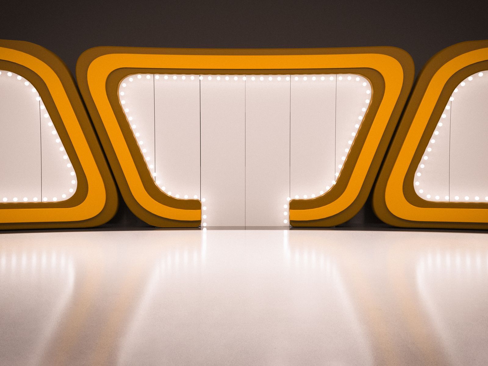 To emphasise power behind the host would be a classical temple like wooded decade. I modelled this on the old bailey to give the feel of a judge’s position and this would be lifted to a height to look down on the contestants.