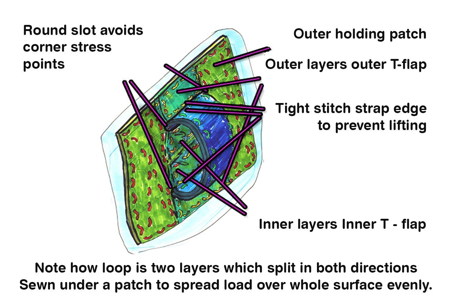 - This was fed though other webbing slots with rounded ends then split and sewn into place. Triangular sewing patterns give strength.