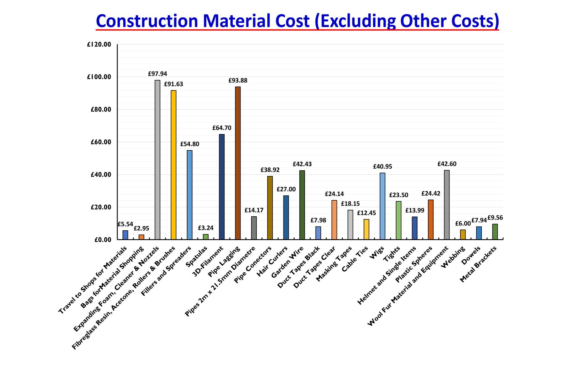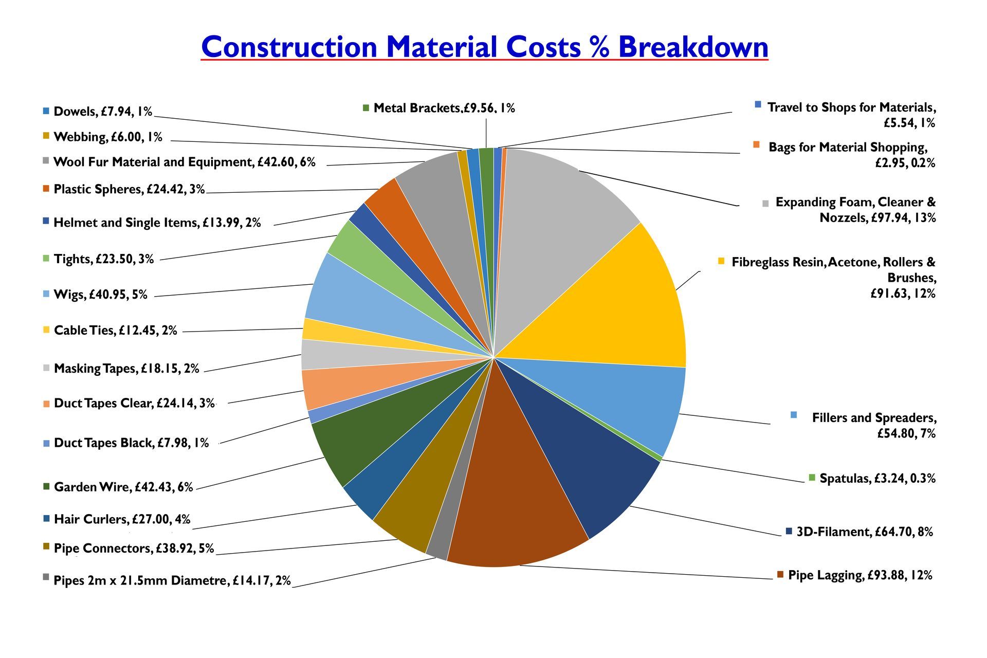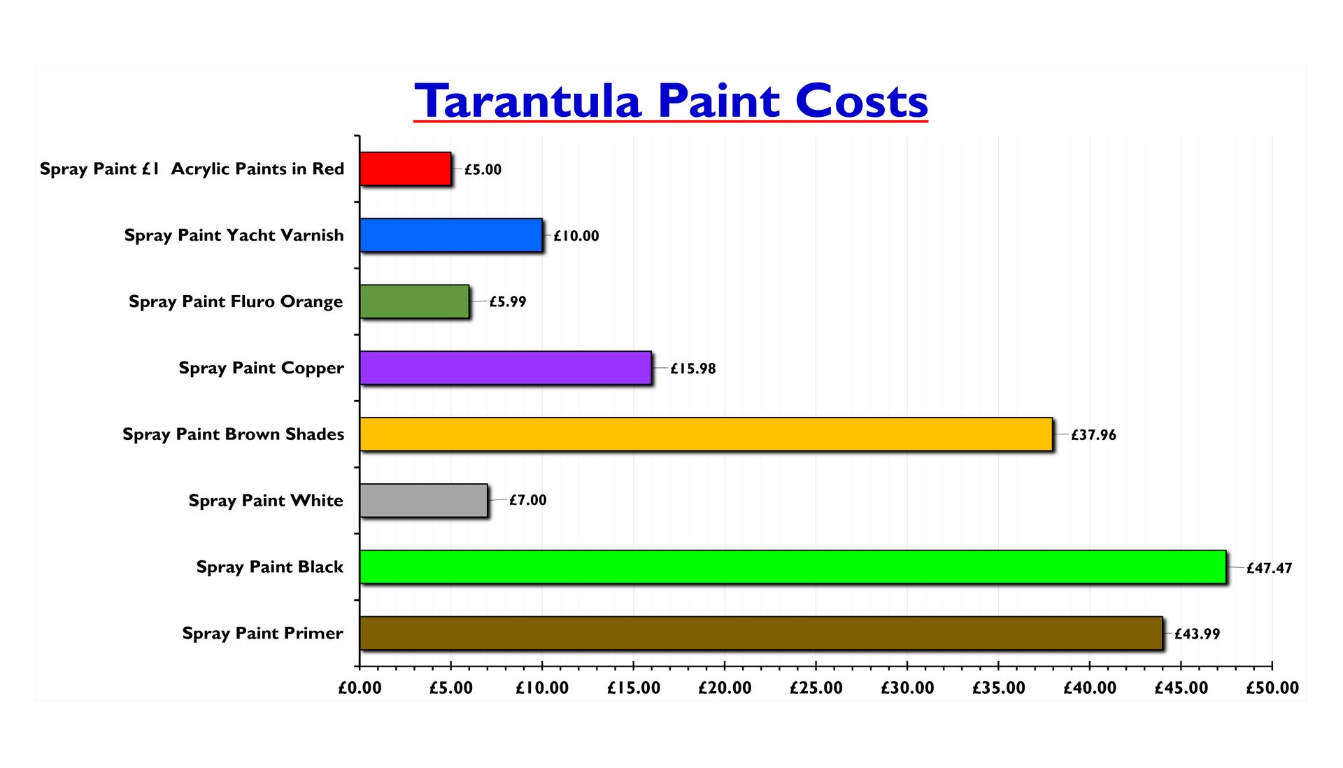 Most of the costs were the various materials followed by spray paint. A lot of the work especially paint was redone over and over and the amount of expanding foam needed was grossly under estimated resulting in 18 cans (Mostly 750ml) needed, totally around 13 litres. Costs were reduced with most of the black, white, varnish and primer spray paint purchases from Poundland along with brushes for the fiberglass. Colour such as brown for the original desired look could not be purchased here so had to be sourced from art supplies for 4 to 5 times the cost per can..