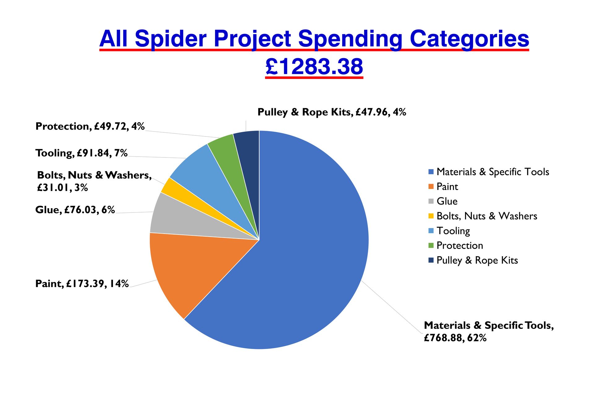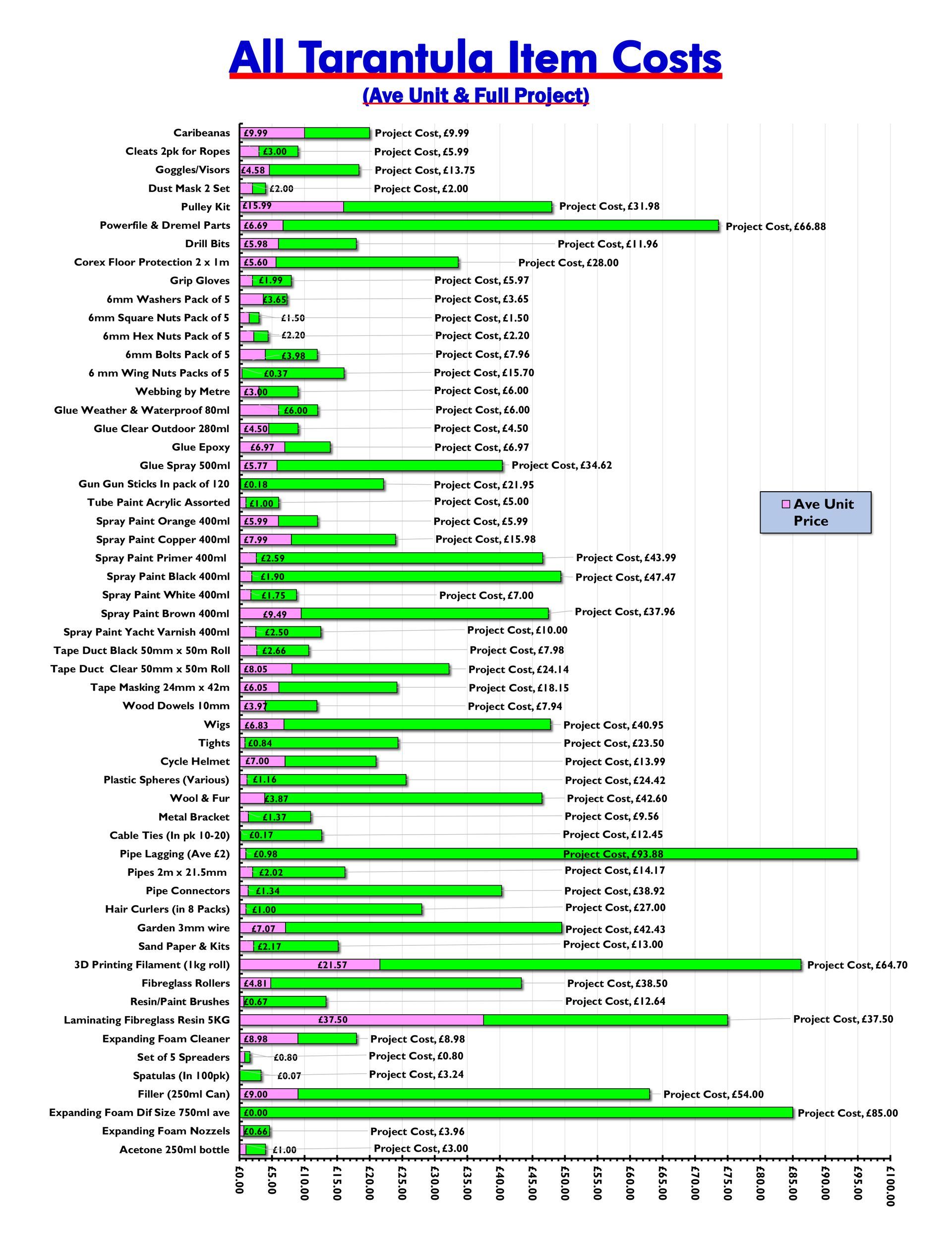 I already had some materials and Safety gear such as a box of disposable gloves. At least 50 pairs in a box and went though most of them, but did not keep count so it is not the full real cost of the spider.