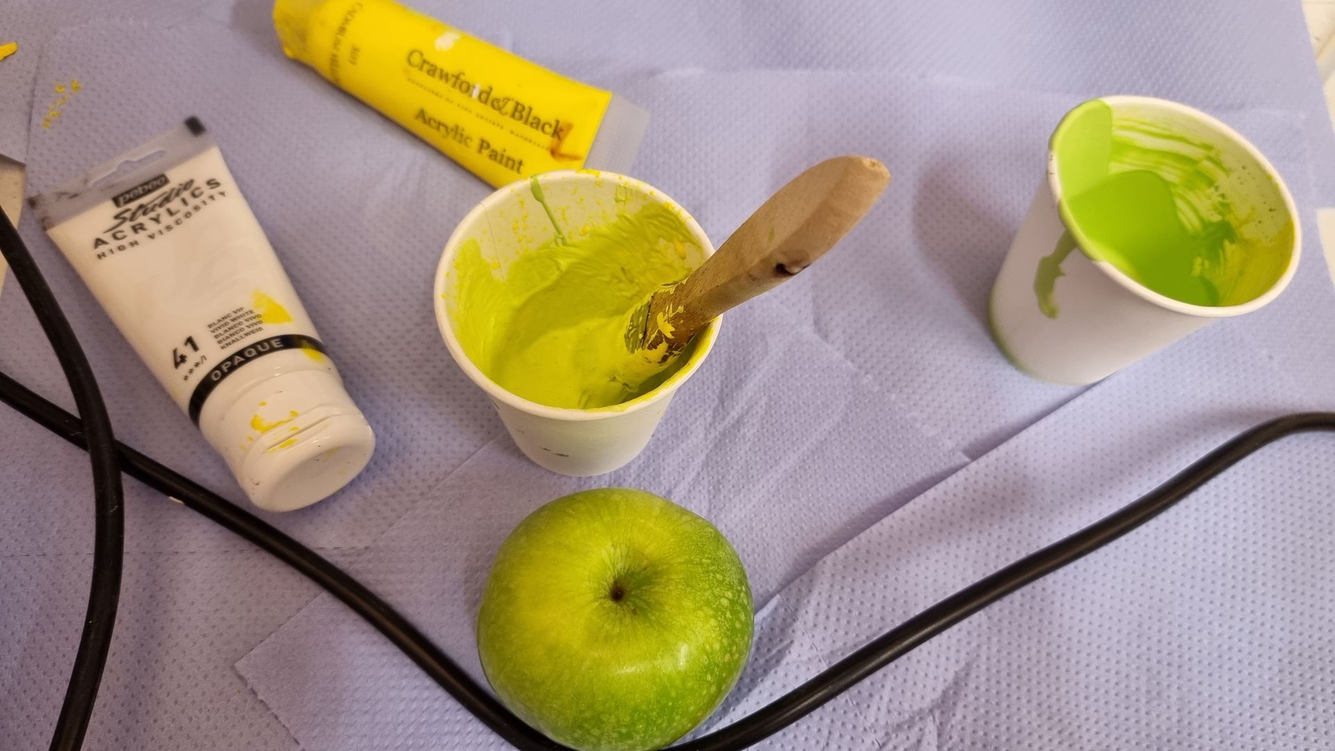 Paint was also soaked into a brush with stiff bristles. The bristles were then slid back to flick paint spots onto the side of the apple to add texture.