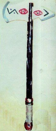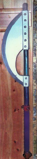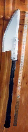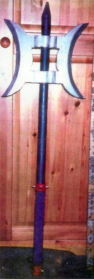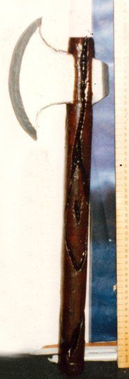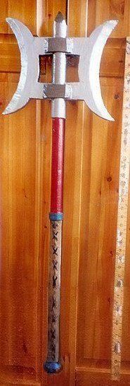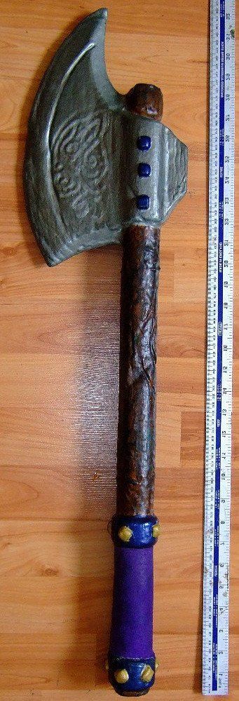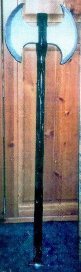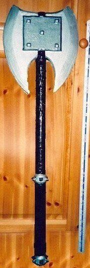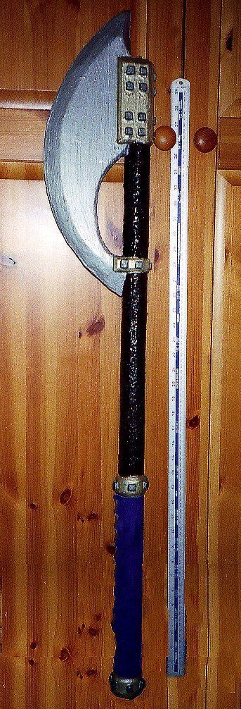 In the Live Action Role Play LARP games axes whilst less manouverable and slower than swords, are often very useful in terms of reaching over shields and as a hook to trap and pull both weapons and opponents to the ground. Some of these had large holes in the blades to act as weapon traps to further this aim. The small ones are also useful for throwing due to the weight on the outside. When I started to make these competitors just stuck o the blades whihc were easy to rip off. Mine were far stronger, with cross bolts through the main shaft and moving away from pipe lagging to wraped foam that was shredded so water down latex could trikle down producing more natureal wood effects. The testure of this aso provided much more puschase for the latex to bond to the foam with all the resesses and the foam was more soaking.