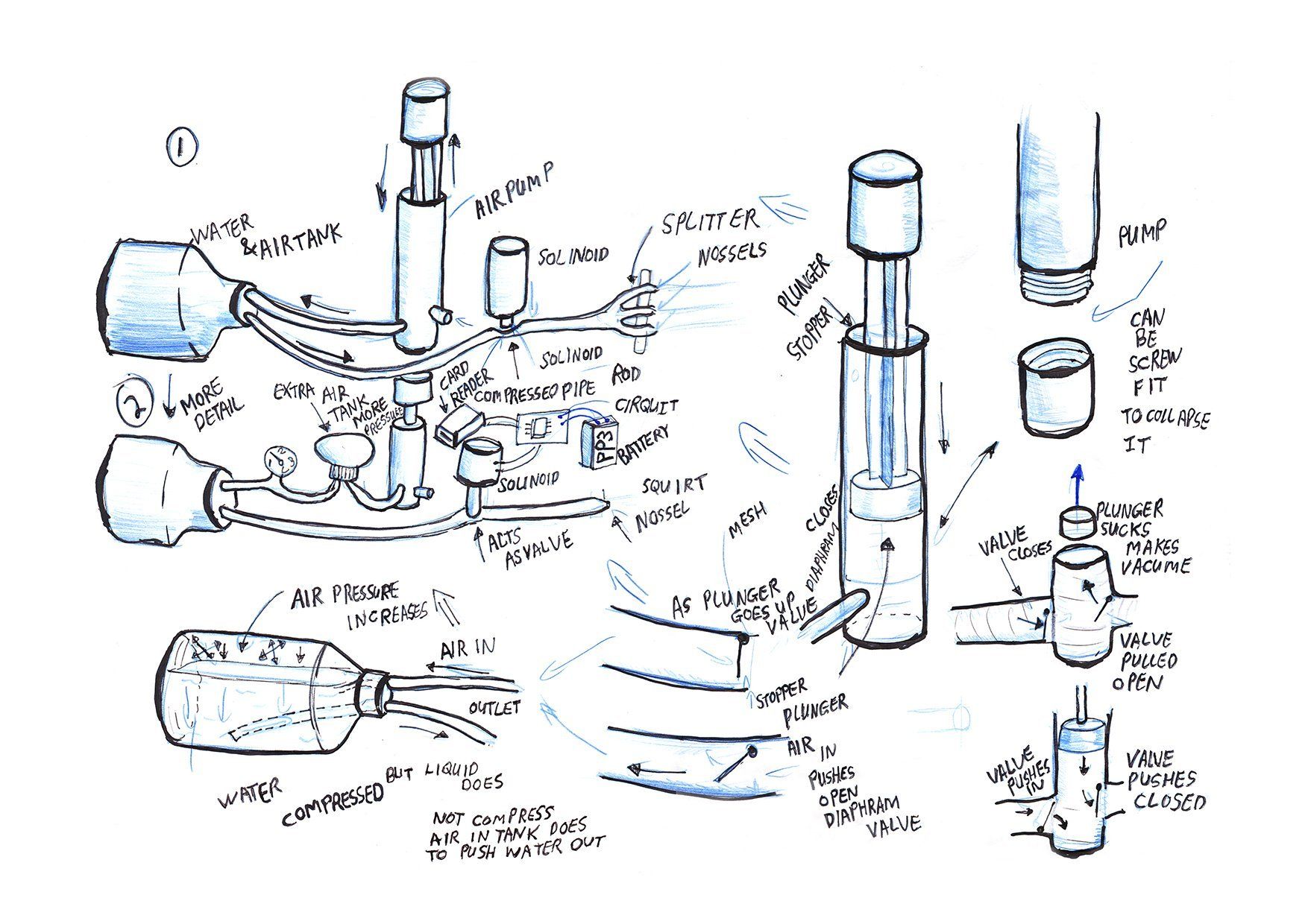 When electricity flows through the coil it creates a magnetic pull stronger than the springs. This pulls the bolt away from the tube opening it out so the pressurised water can be pushed by the air pressure through the tube out of the nozzle. This is just like when the trigger is pulled on a water gun.