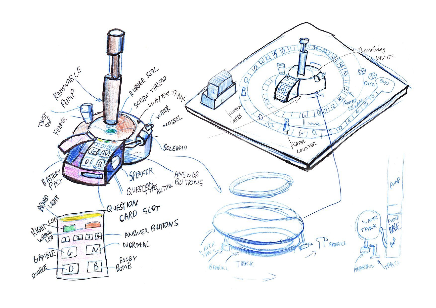 The Squirt Pursuit game concept was designed for an interview with Hasbro Toys. It was intended as a board game race with spaces that have a variety of bonuses and penalties that skip goes send you back or forth with dice and counters all very bog standard. The centre piece is a card reading multiple choice quiz machine/computer that controls a water squirting device.