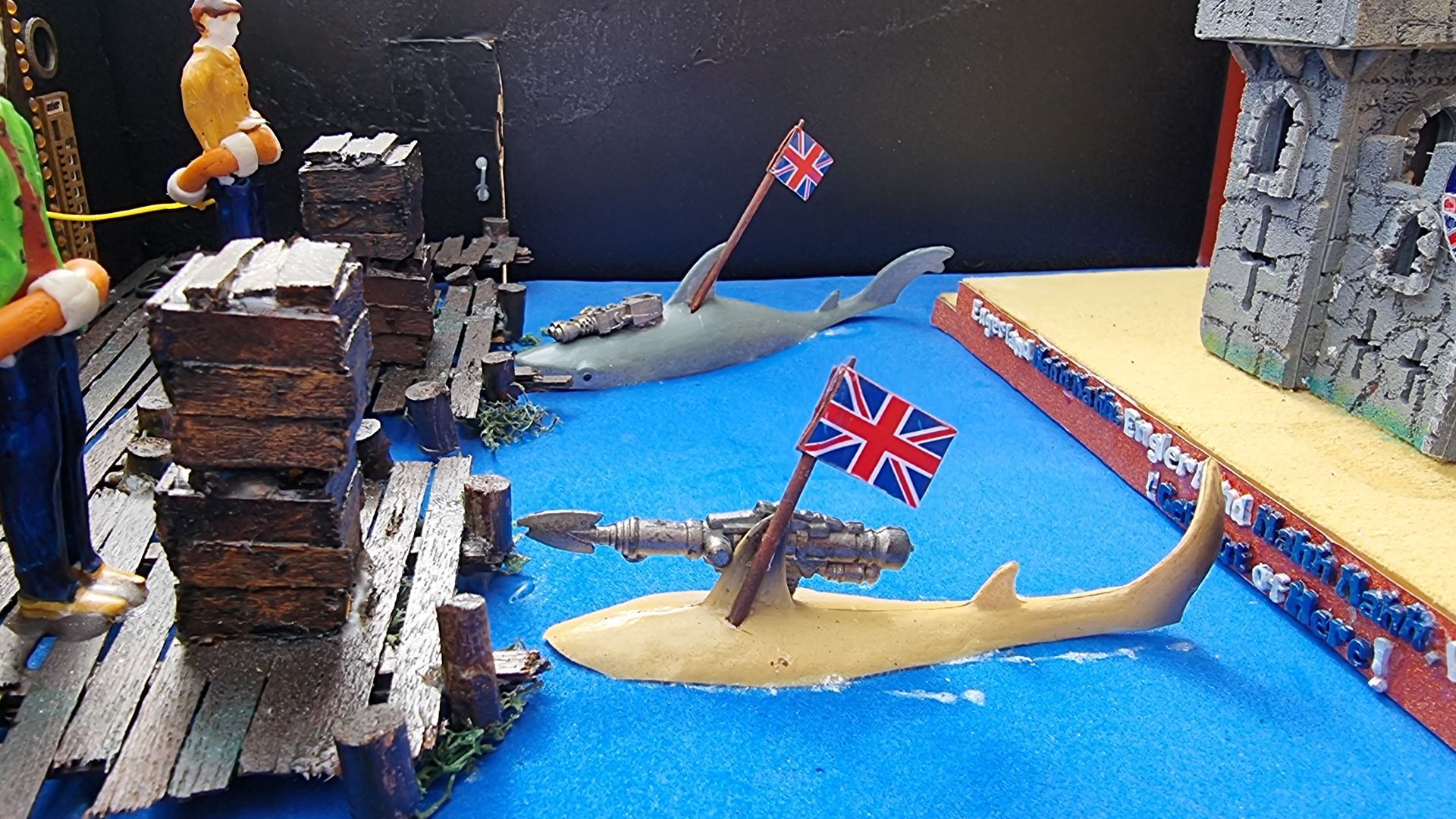 At a model level I just went to my local toy shop and purchased a £2.00 packet of rubber hollow sharks. used Stanley and scalpel blades to splice them and glue on the flags.