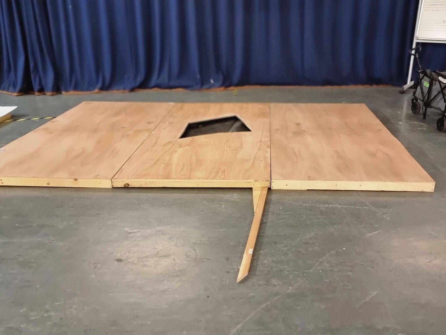 Below is the set construction as we learned to build flats. We were in different groups building the flats but did not get to use the table saw. I added addition coats and touched up paint on the dummy. I also did the creative work on the drop-down transportation flag. Harriet had connections to turn my photo bashing from weird vehicles and sketches into metallic foil printing on material due to connections she had.