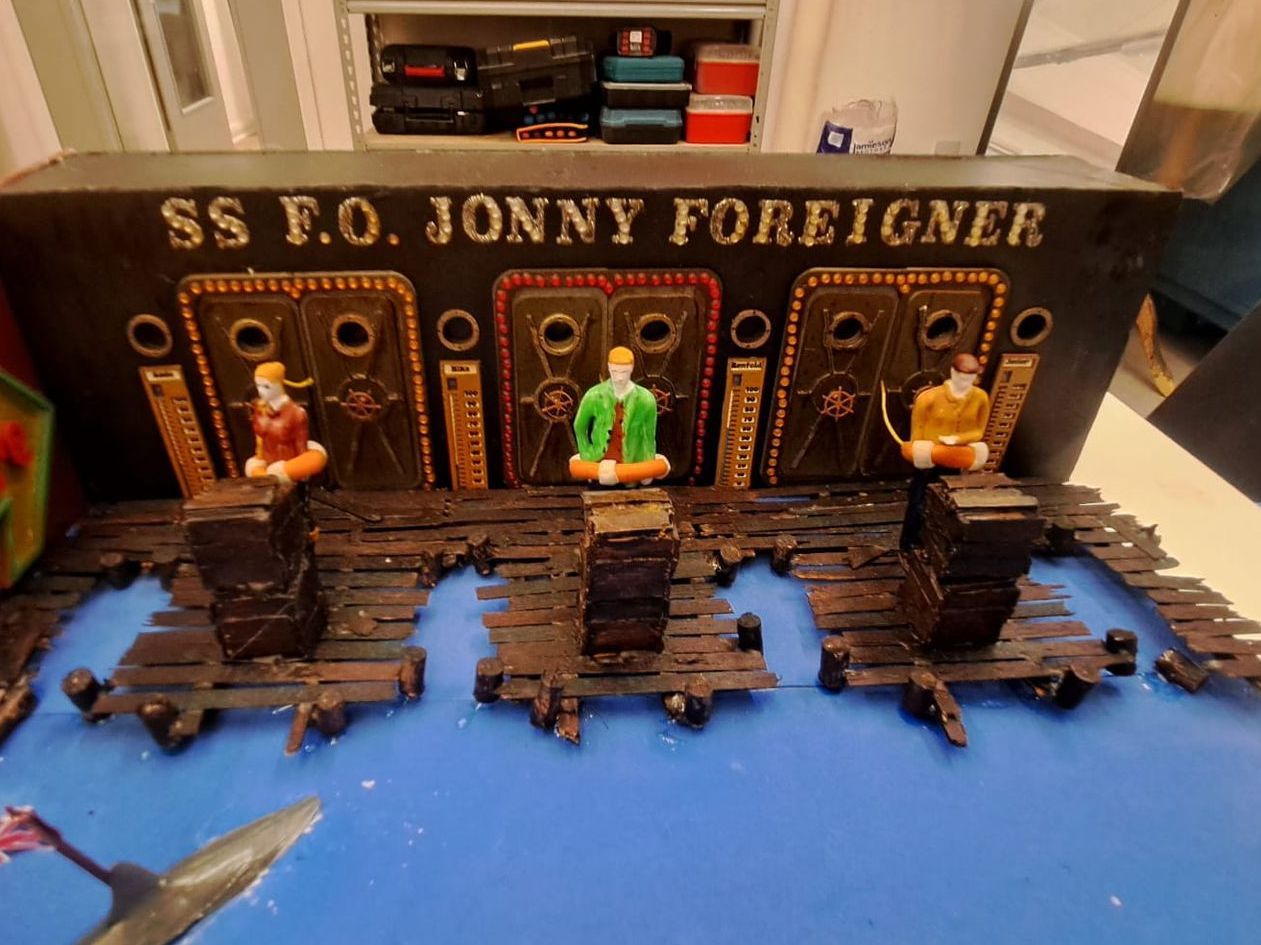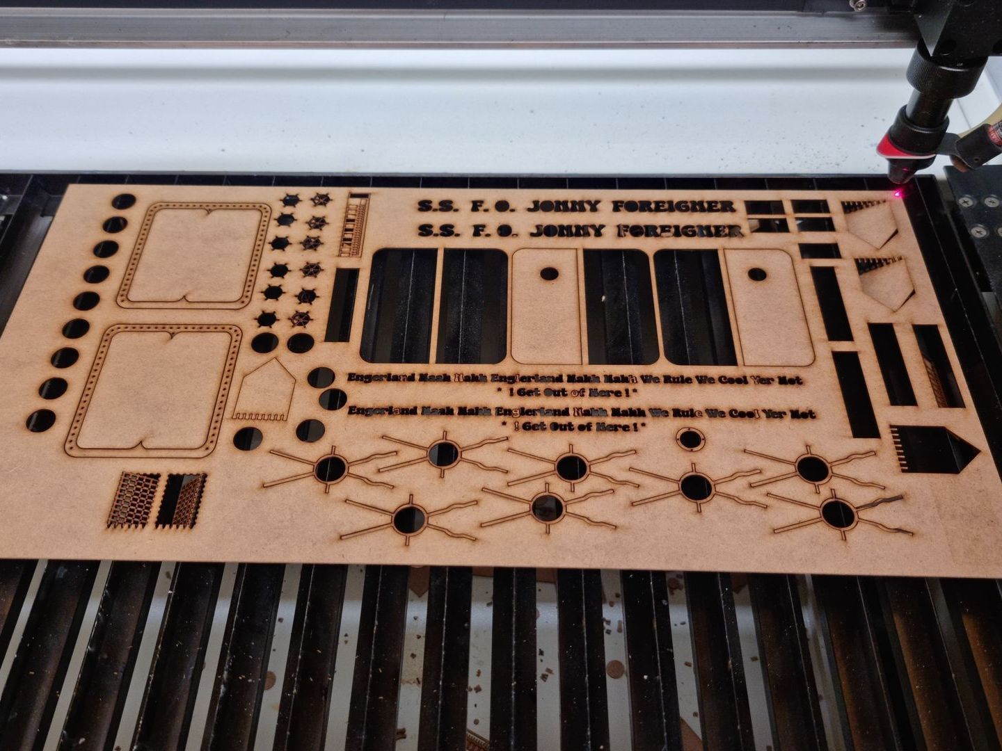 Detailing the difficulties in tiny manual text setting and colouring such lightweight characters. Laser cutting of components and the reasoning of the use of clearly xenophobic offensive football chants.