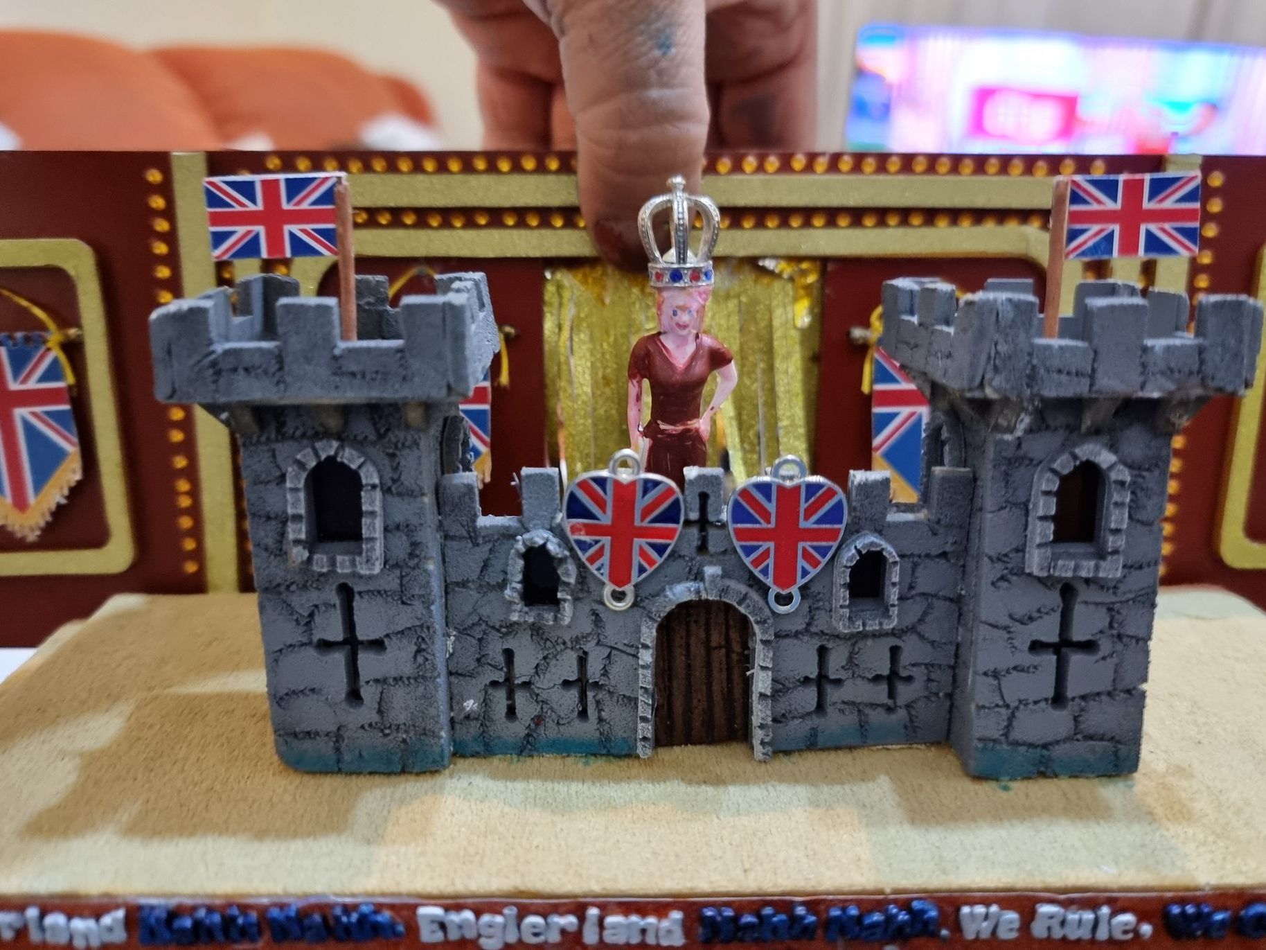 Thus her side is very paitriotic, jingoistic, higher up, has a football jeering chant, she is behind a castle, with a queens crown and pleasure luxuries that she thinks make her look posh and superior but are actually tackey & cheap.