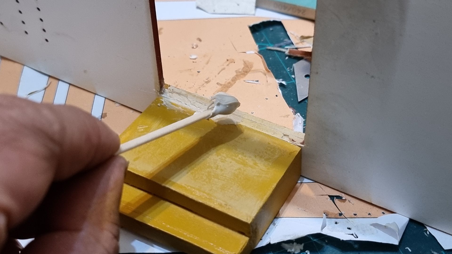 The stage was one of the simpler sections of the model build as mostly rectangular blocks. I cannot remember if this was a laser or scalpel cut out but I used the sand-coloured filler primer to colour the parts.