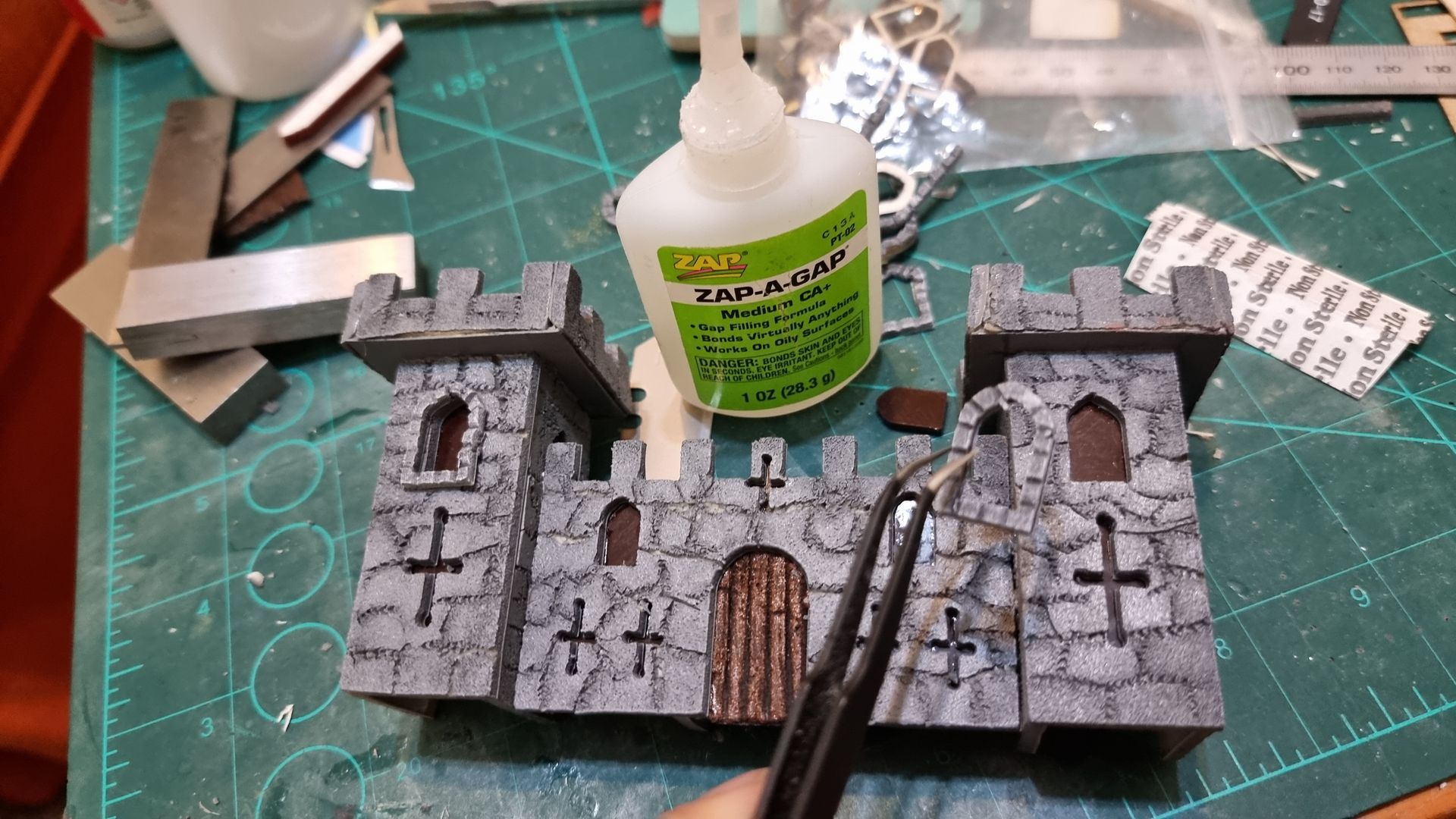 Tiny triangular supports were added for a crenulation effect to support the upper floor in the towers.