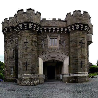 It seems a far easier idea to go with a mock castle gate house, that could look cheaply made be that out of polystyrene or wood that’s painted or coated in carved foam or plaster or simply painted card, paper or material over a wooden frame. The cheap, low tech tacky look would fit the style of a 70s game show and be far easier, quicker and more importantly very cheap to construct, take apart assemble and store, possibly for re-use later.
