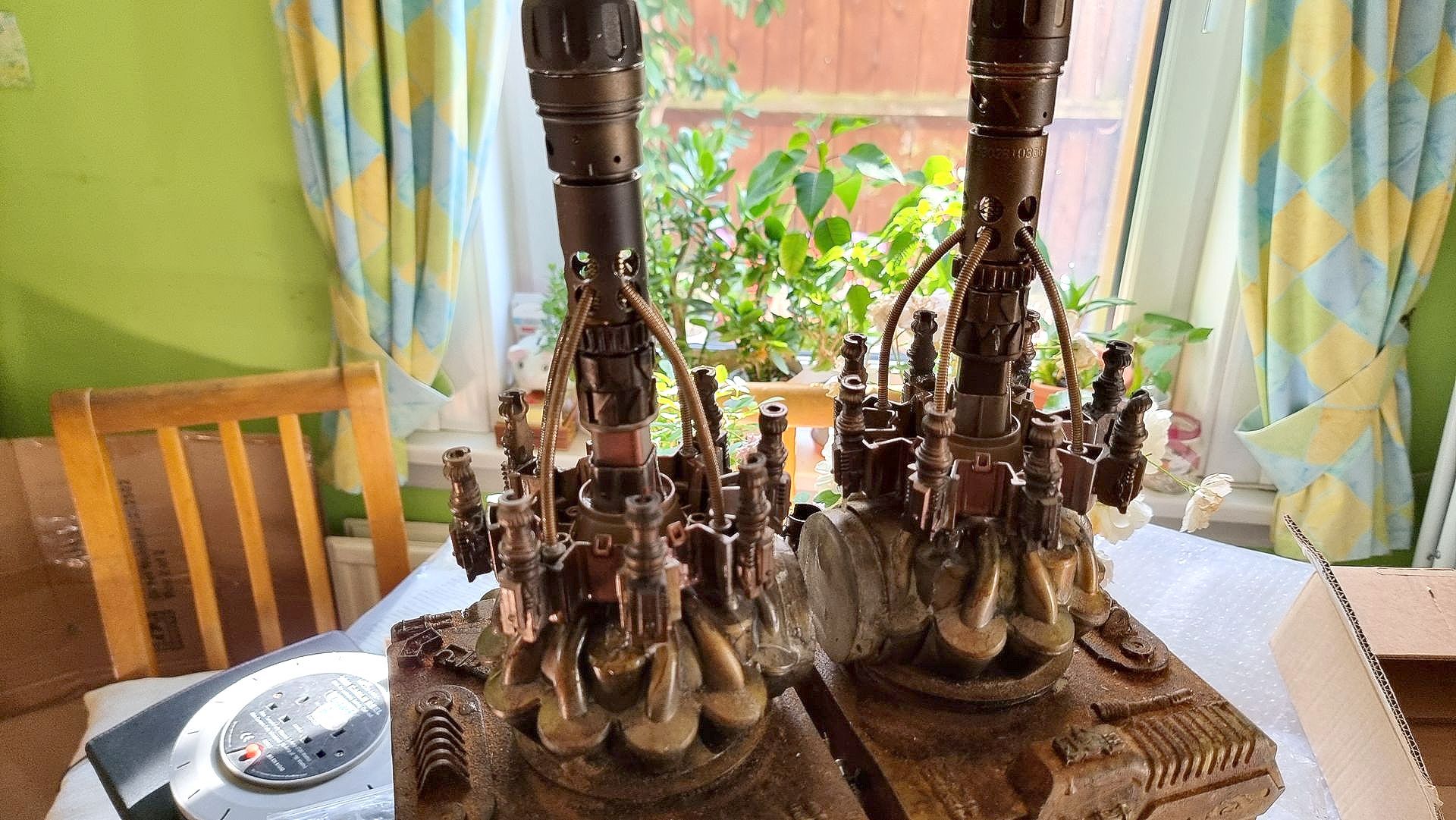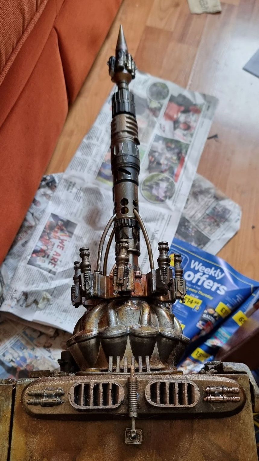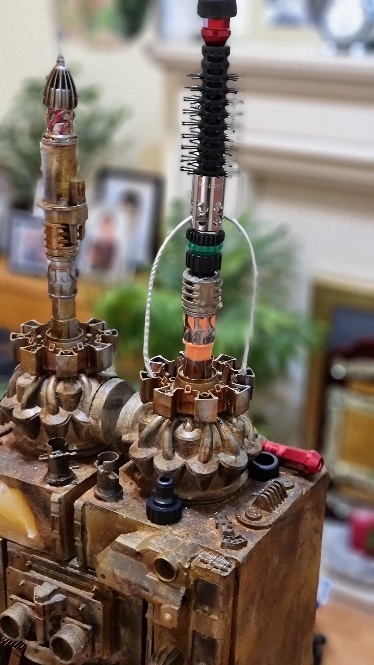 The other end just clipped securely into the doles on the tower component I think originated from a blow torch majorly enhancing he look.