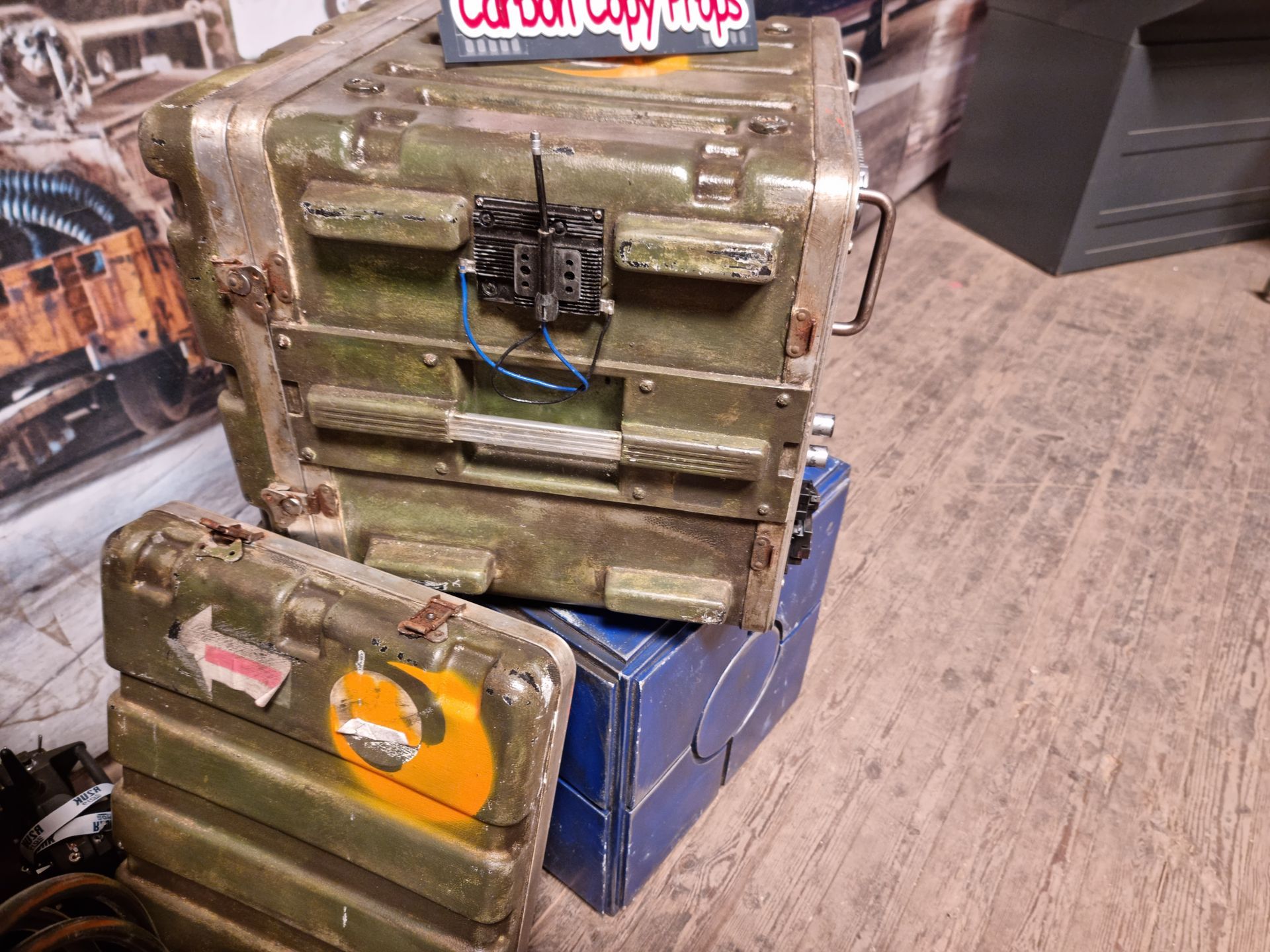 As I started to pick up set decoration to help kit bash the prop I started to prototype the concept with card boxes and duct tape to look at size and mechanics of how the unit will work and fit together and what sizes to build the component parts, how to place the controls, what works what does not and how to fit it together.