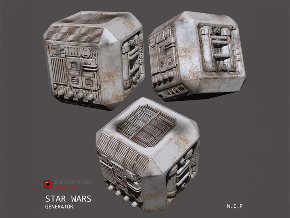 The sketch development led to the concept of the wings housing the control and dials, communication and control transmitters on top and an open power core showing the working on the centralised box section. This follows the George Lucas philosophy of showing the insides working and appearing to have power.