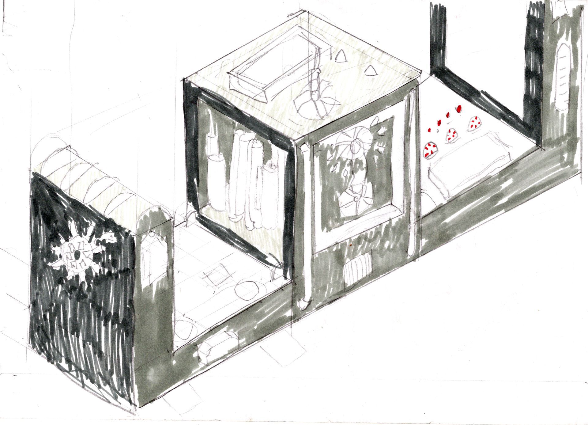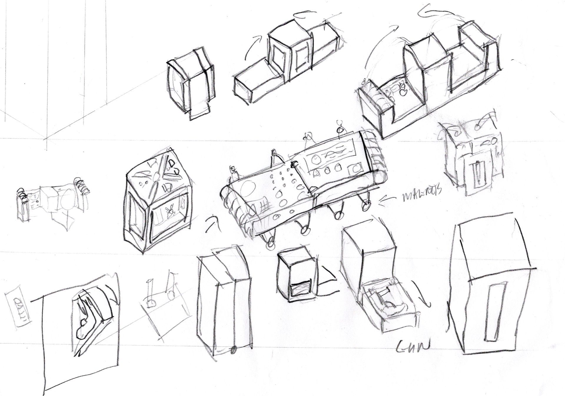In the sketch development I thought it would be better to have a pair of these boxes that were hinged to close, thus the character could pull it open much like a laptop.