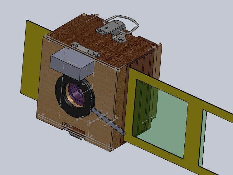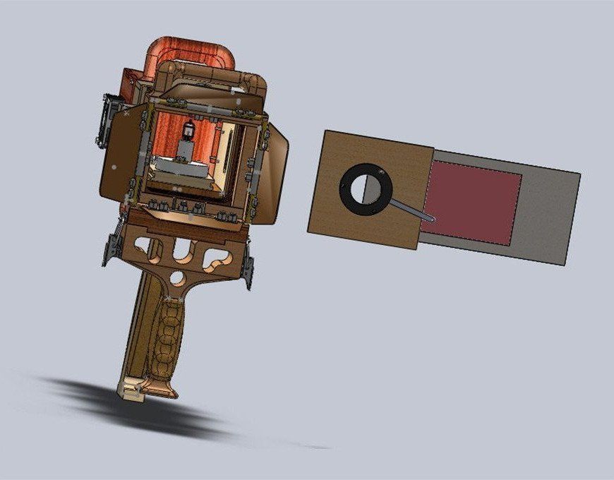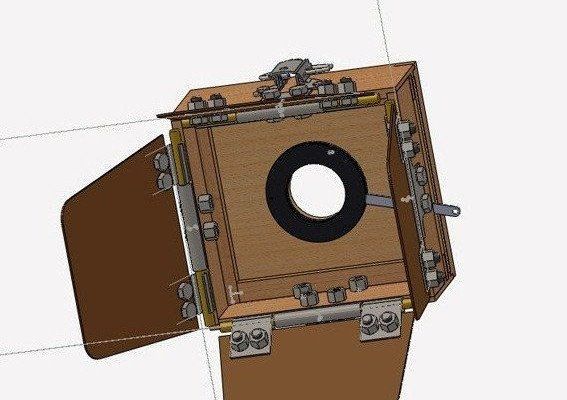 The barn door section can be used to shape the light to the screen and prevent light spill. The doors could be laser cut with high friction hinges. Again catch clip connections.