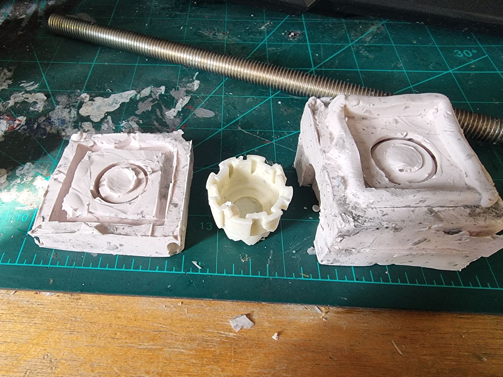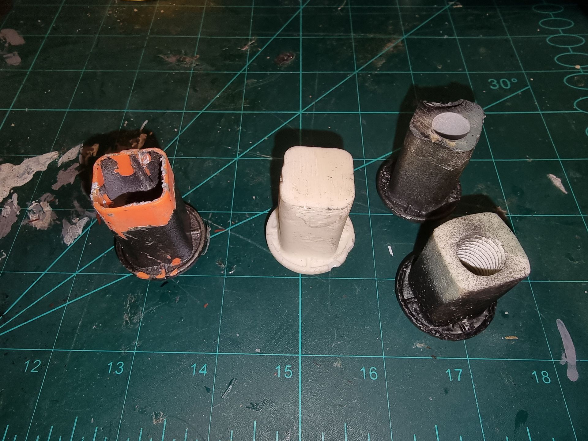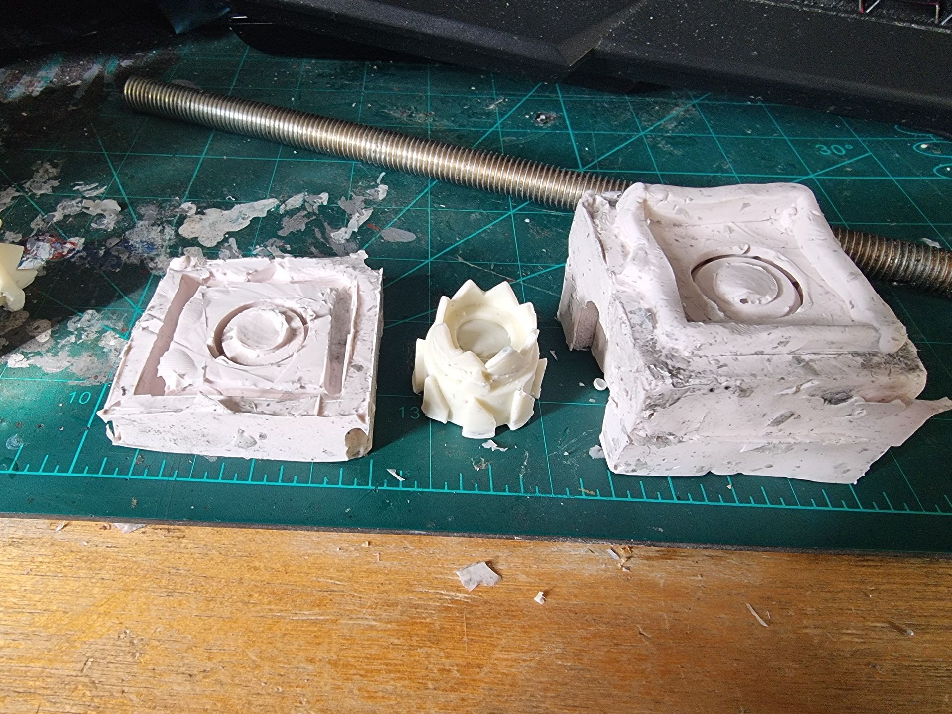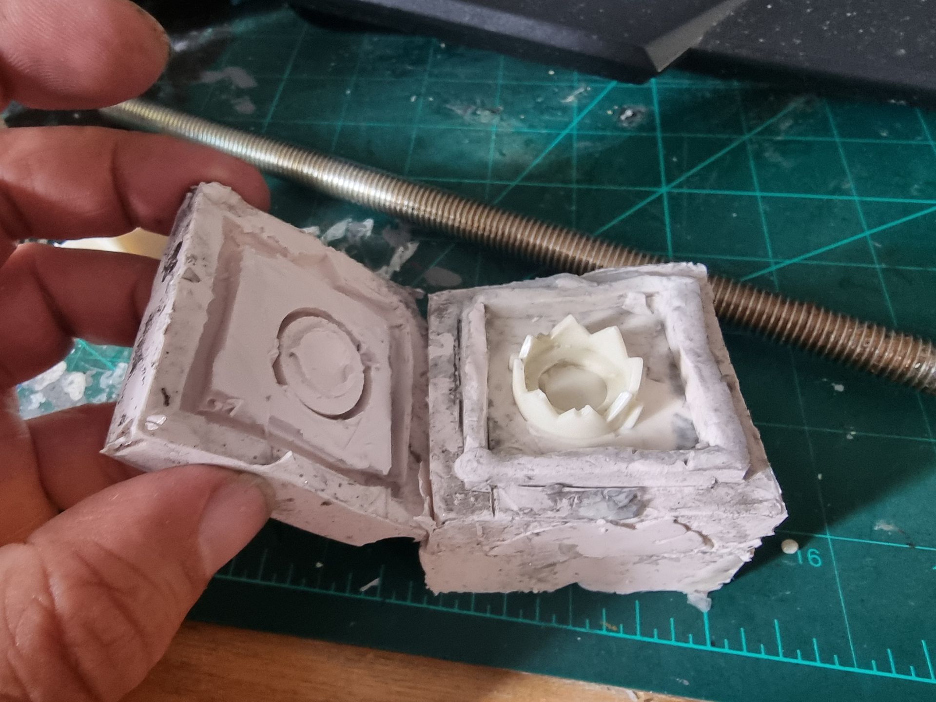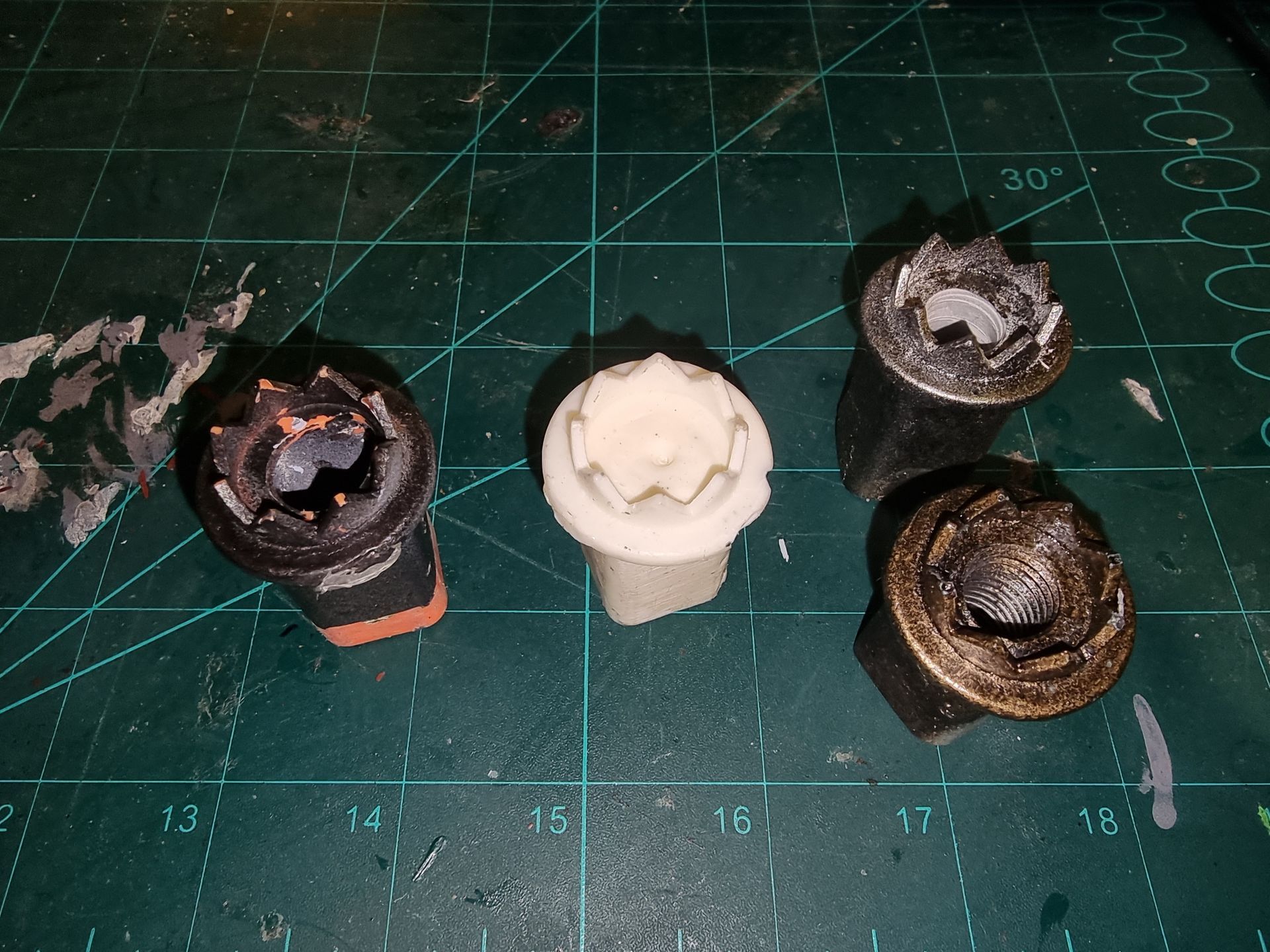 I also could see these parts where fragile and the long square part with the crown to the right here was where the spike entered and at the most stressed point. Being hollow it was also not holding the shaft, so I tried to make a new mould that filled in the inside to make a solid part from my resin. This I could then drill through and add a taped interior screw thread.