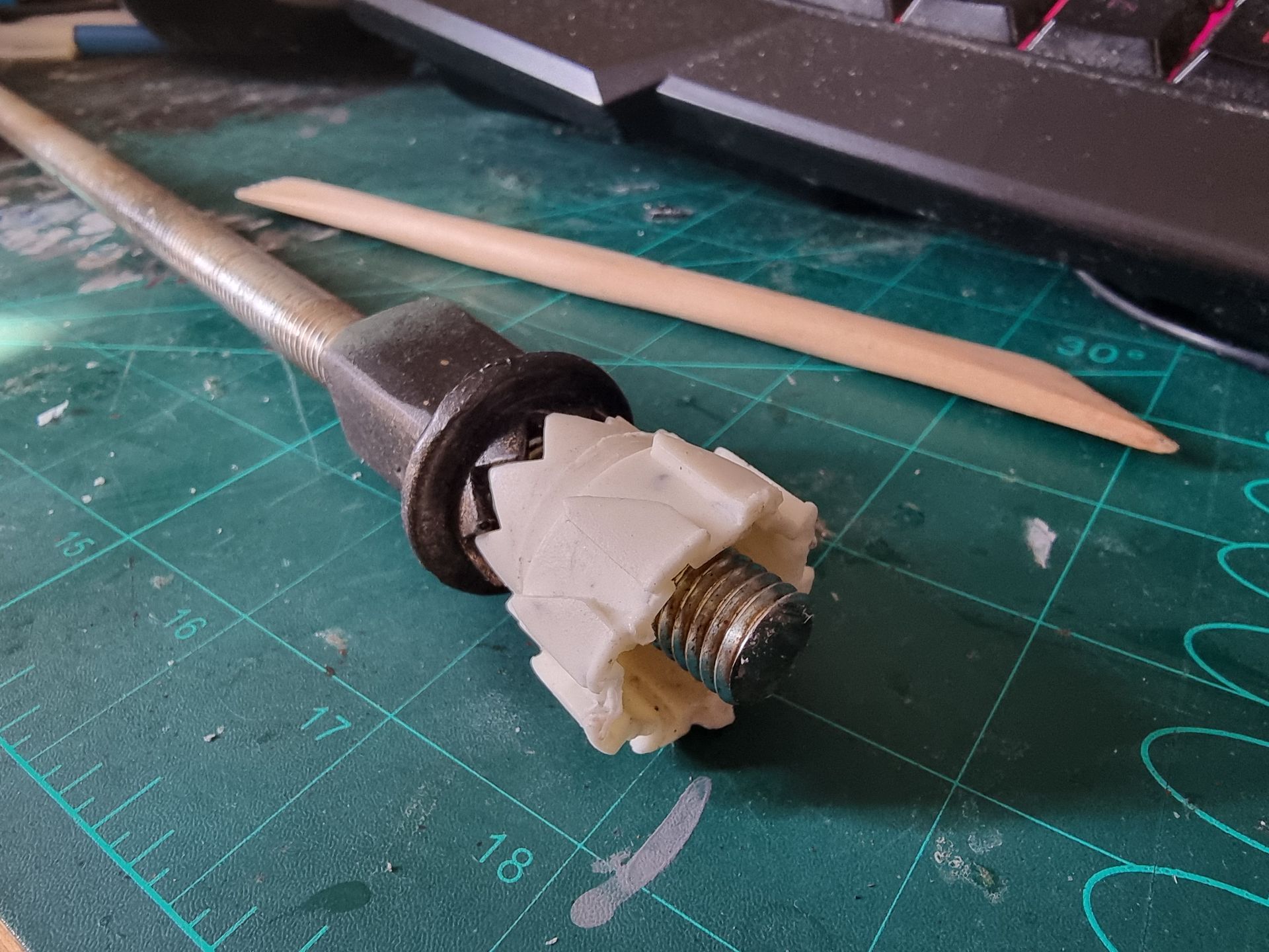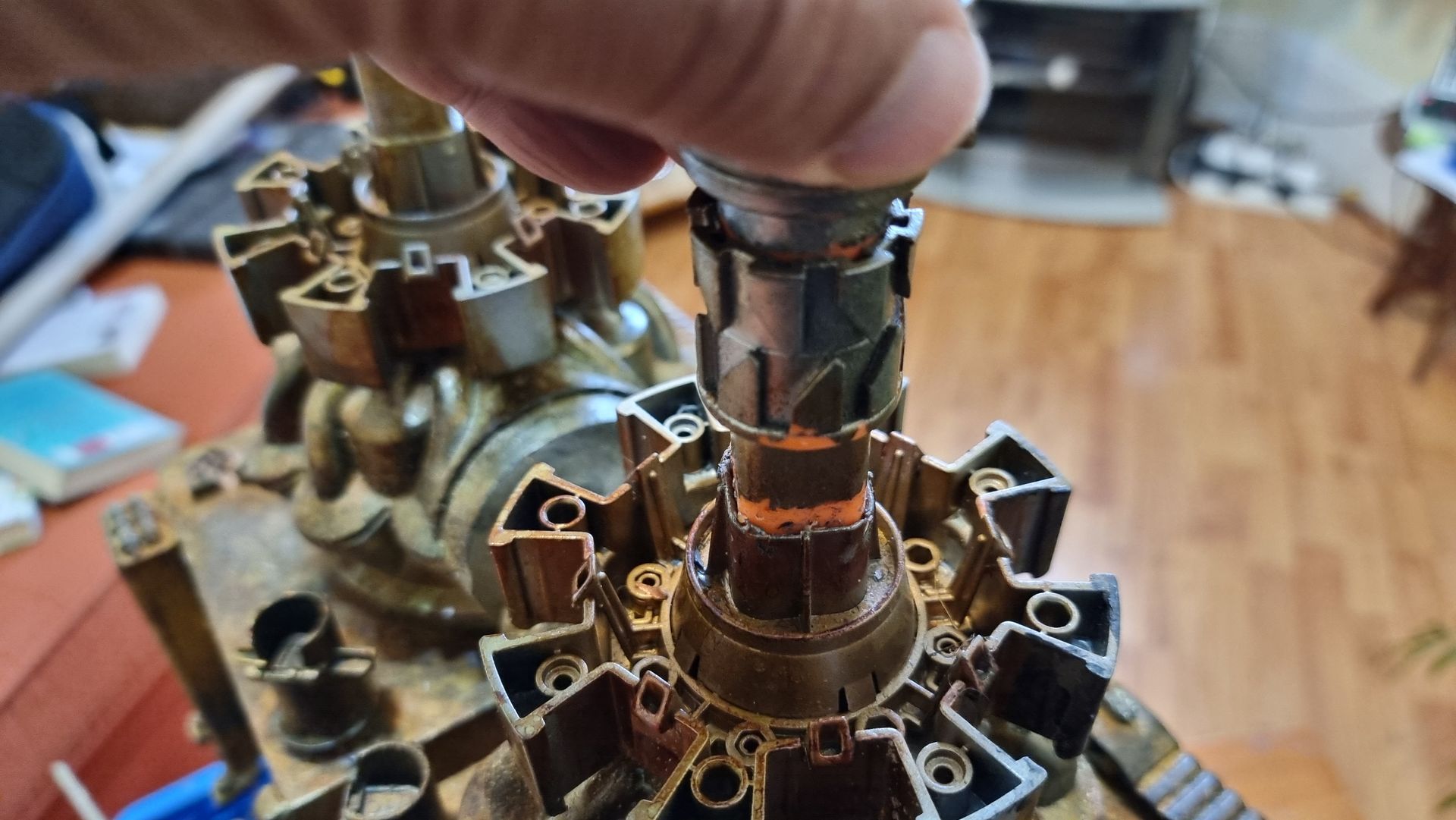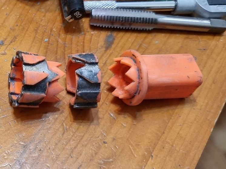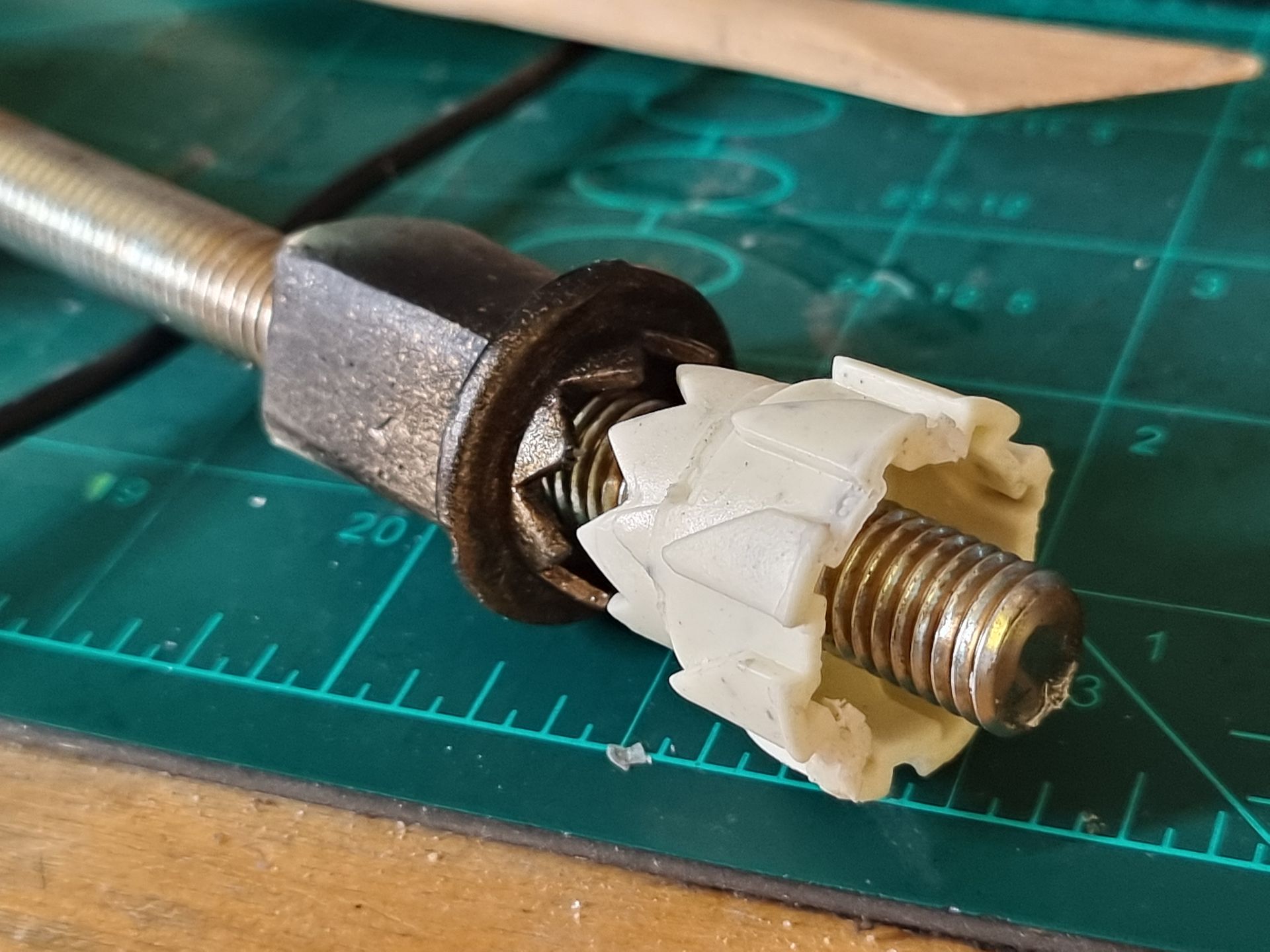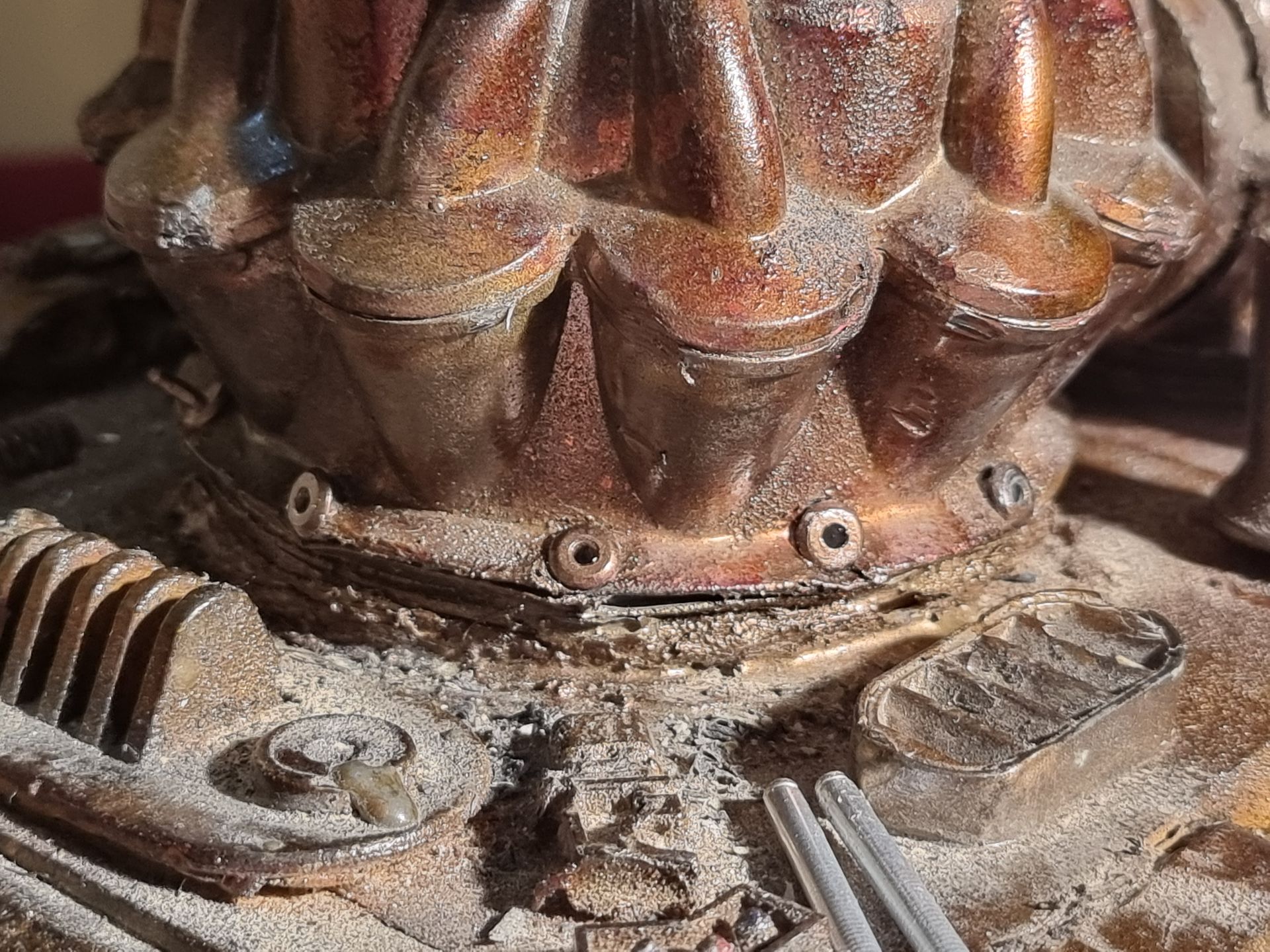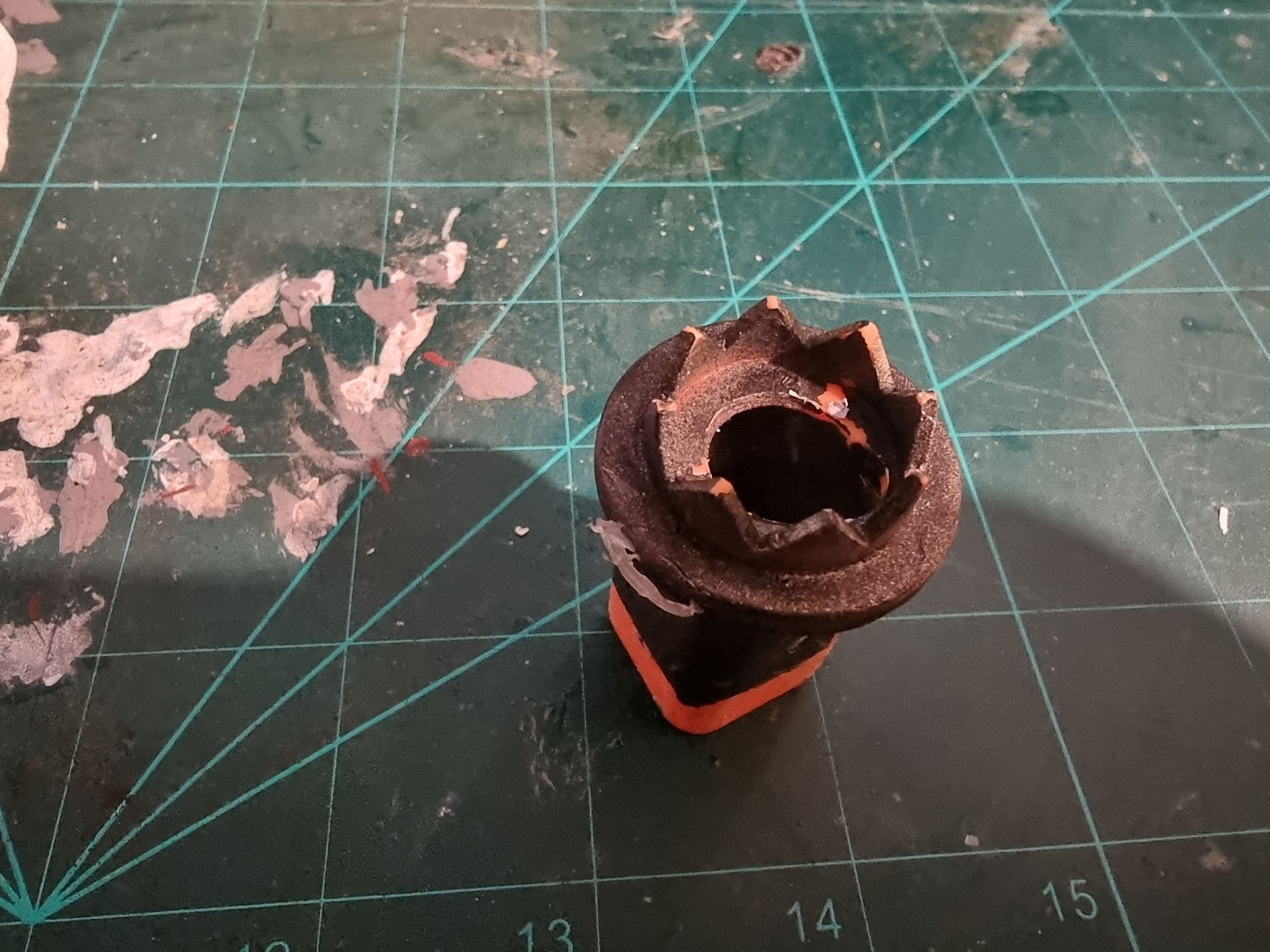 I also could see these parts where fragile and the long square part with the crown to the right here was where the spike entered and at the most stressed point. Being hollow it was also not holding the shaft, so I tried to make a new mould that filled in the inside to make a solid part from my resin. This I could then drill through and add a taped interior screw thread.