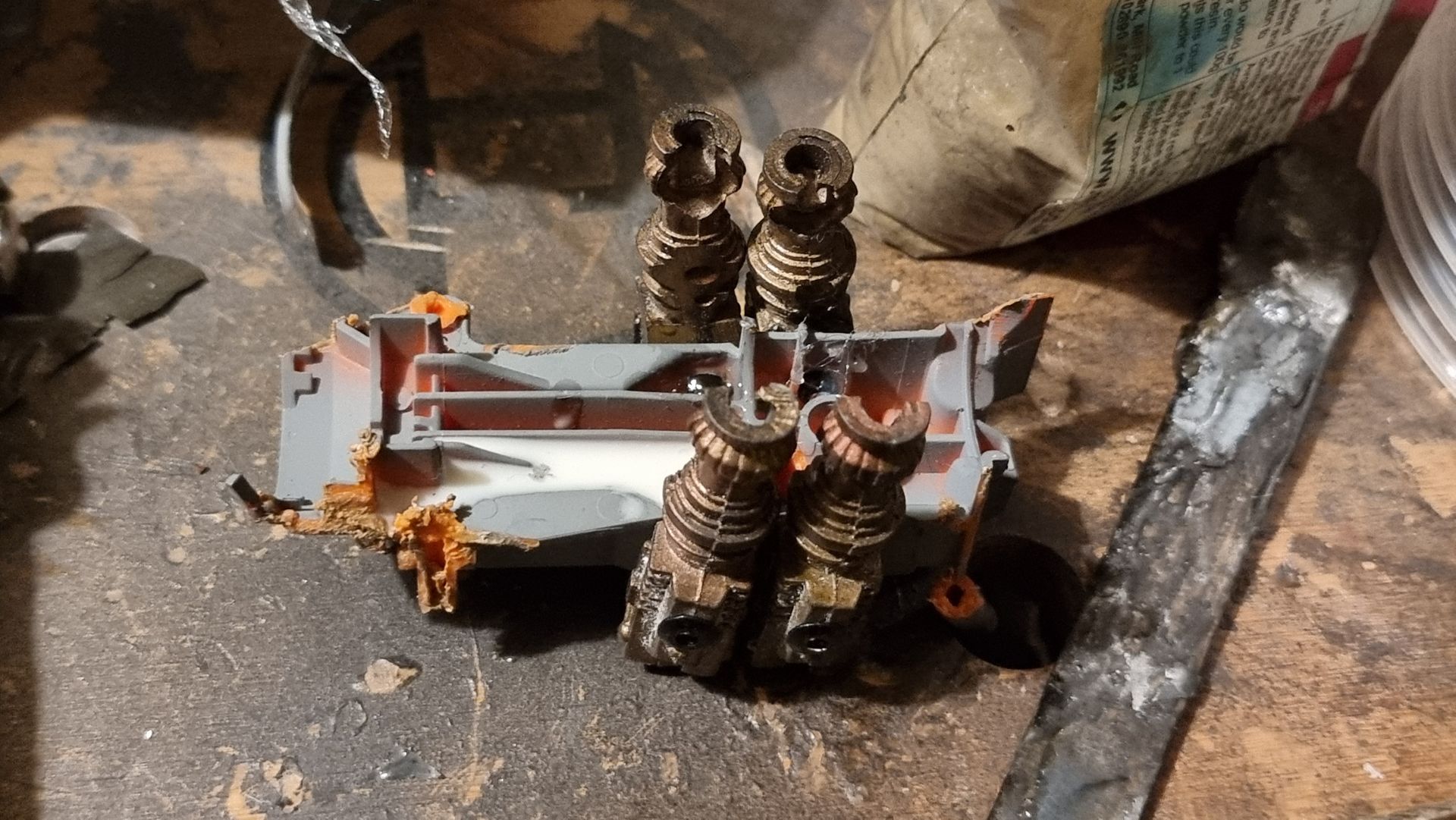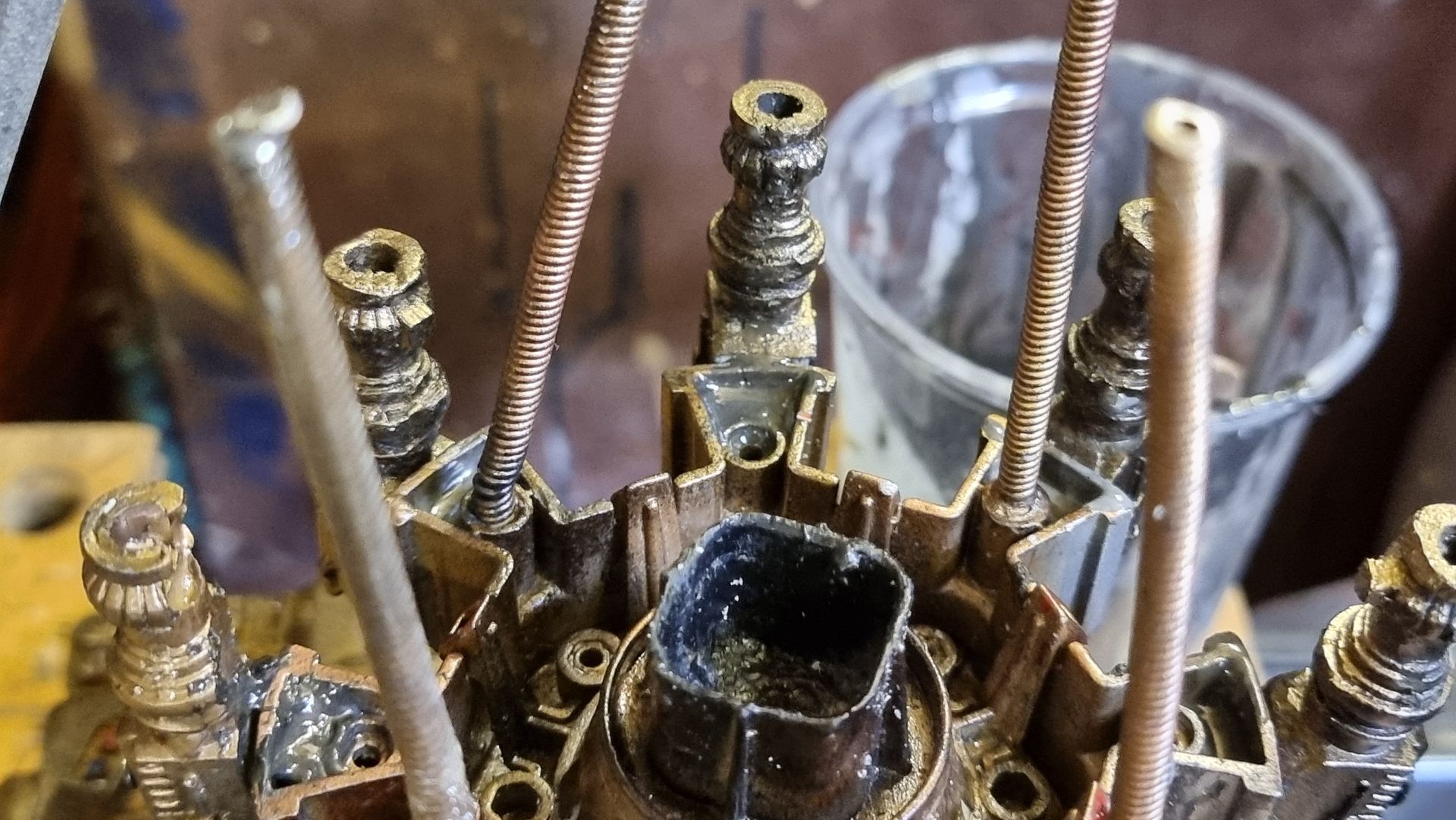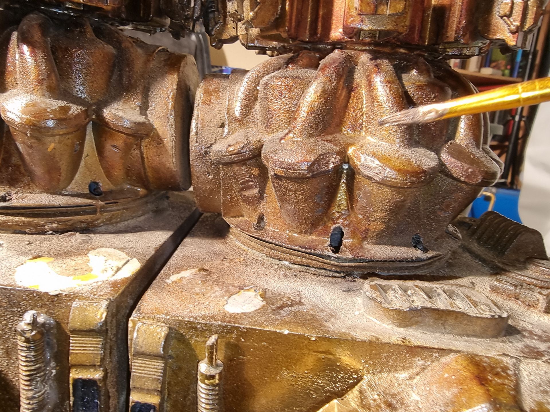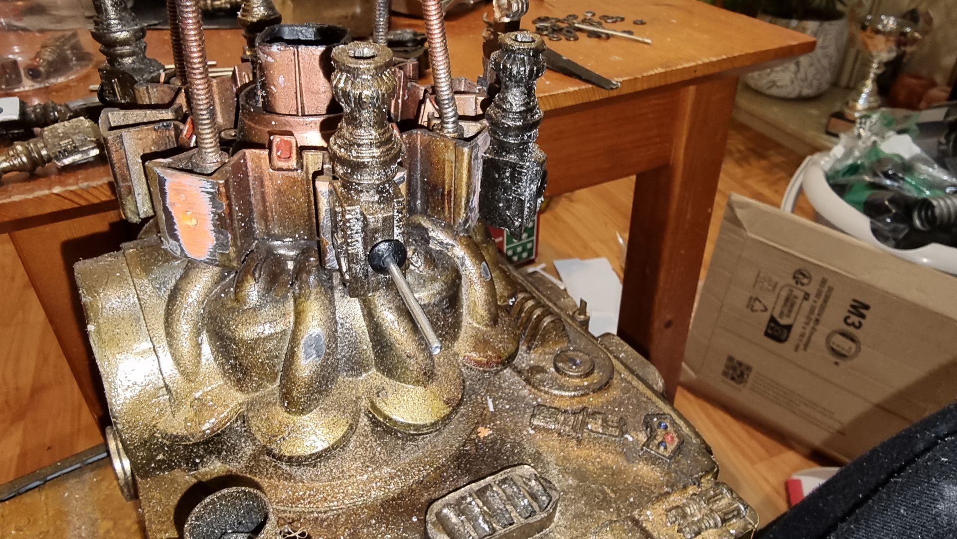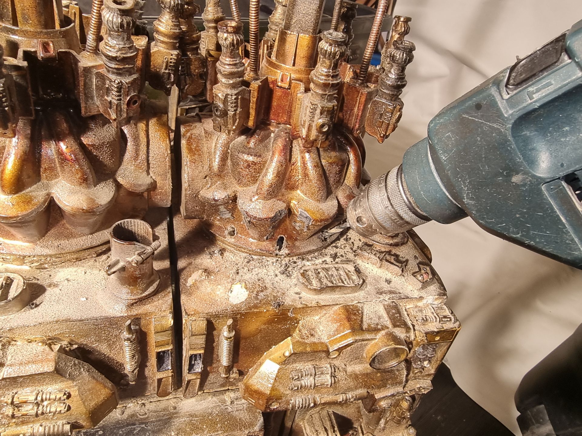 I also could see these parts where fragile and the long square part with the crown to the right here was where the spike entered and at the most stressed point. Being hollow it was also not holding the shaft, so I tried to make a new mould that filled in the inside to make a solid part from my resin. This I could then drill through and add a taped interior screw thread.