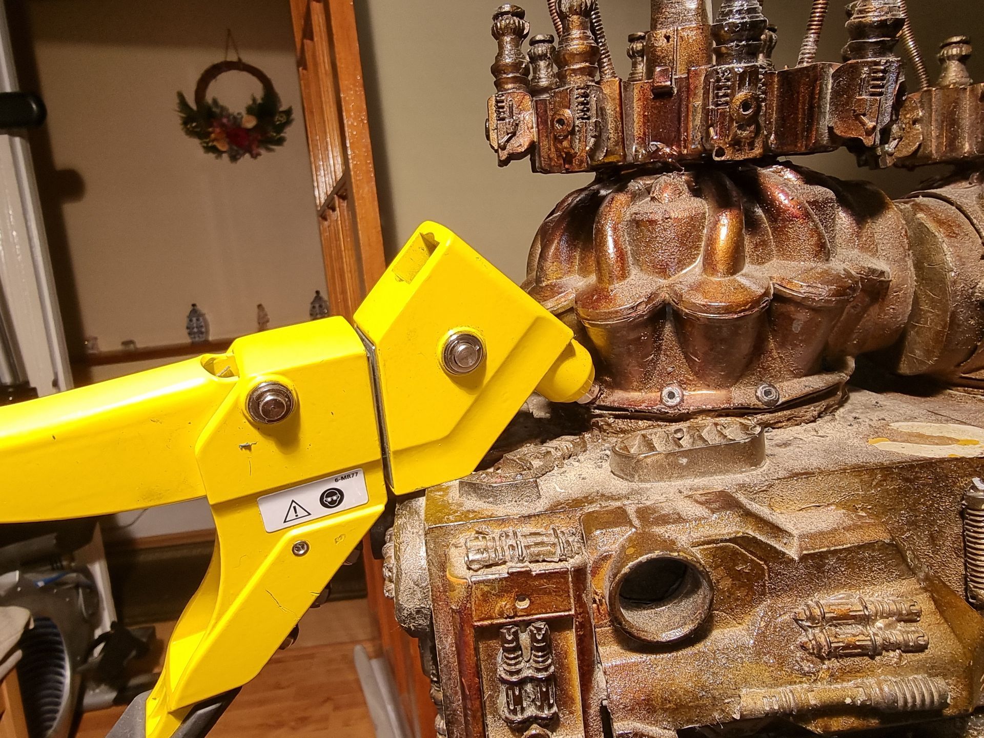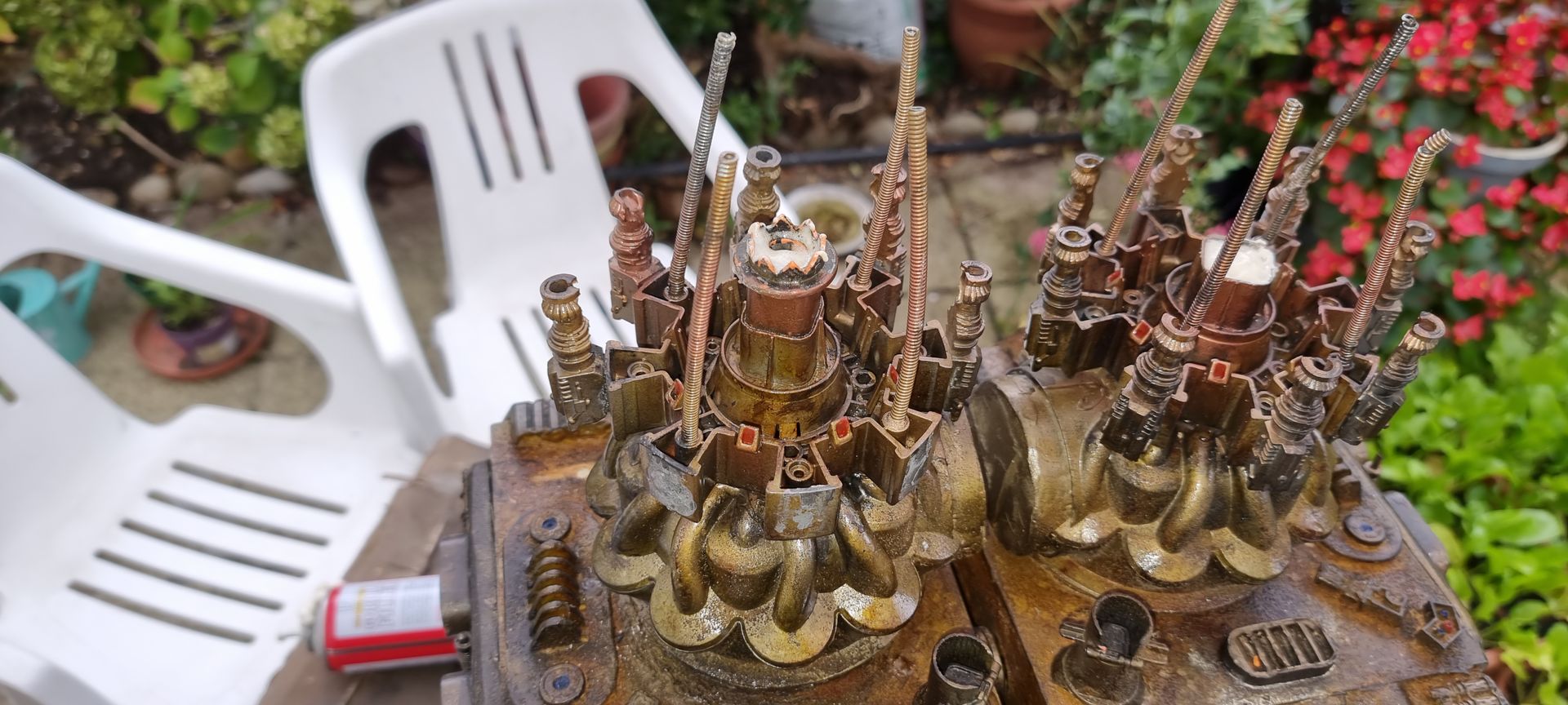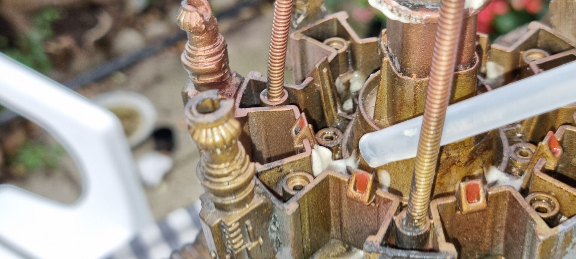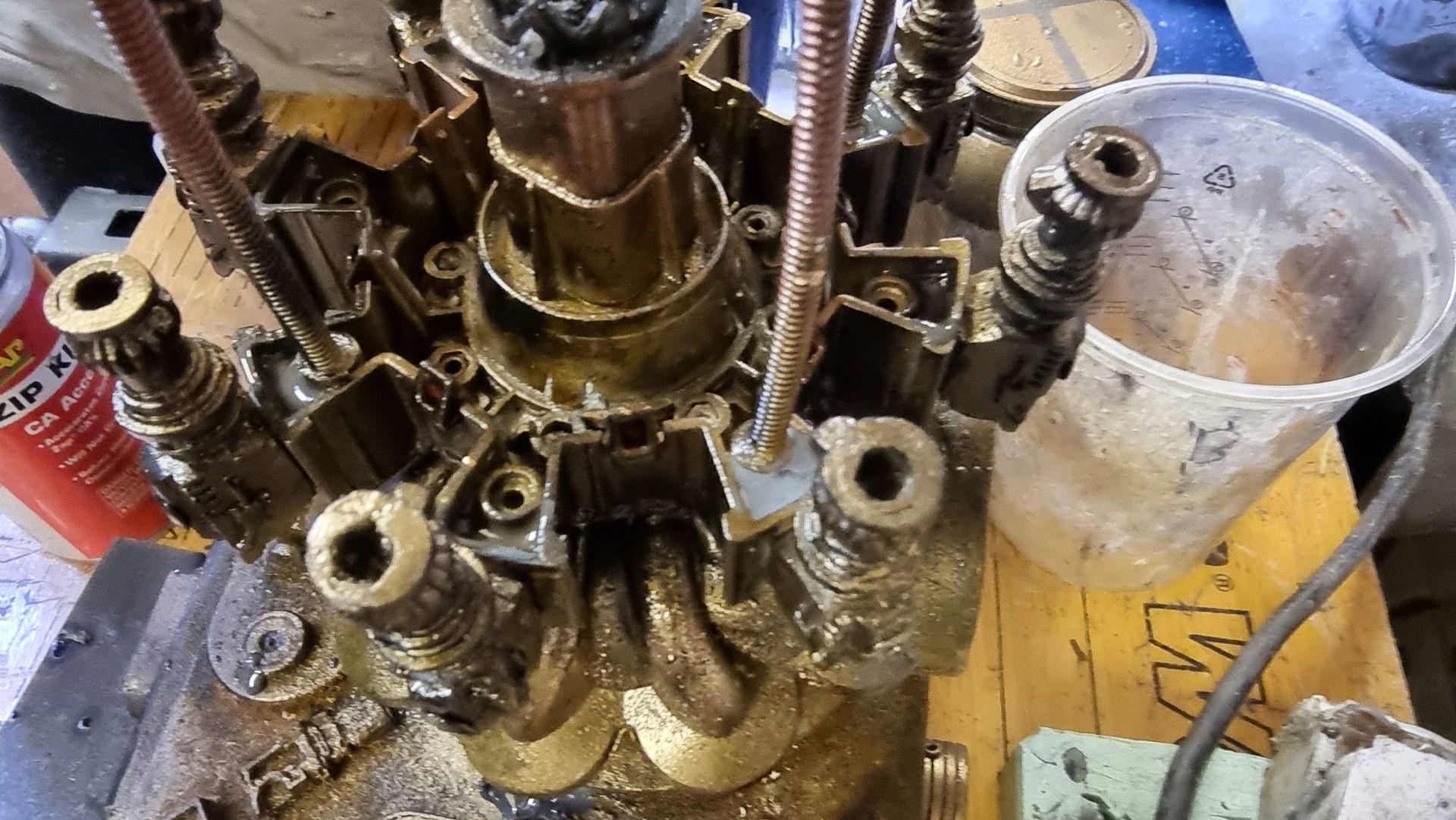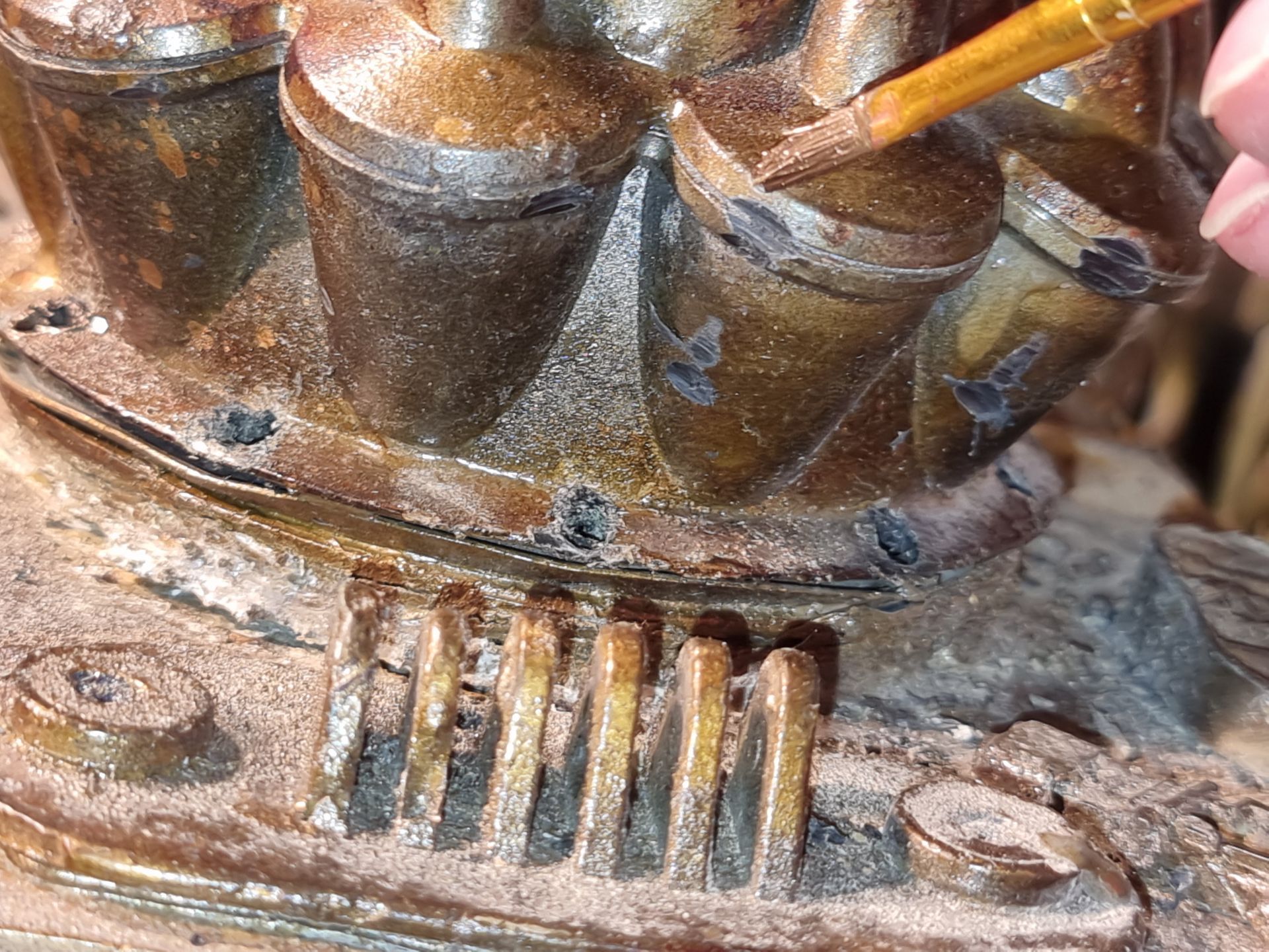 I also could see these parts where fragile and the long square part with the crown to the right here was where the spike entered and at the most stressed point. Being hollow it was also not holding the shaft, so I tried to make a new mould that filled in the inside to make a solid part from my resin. This I could then drill through and add a taped interior screw thread.