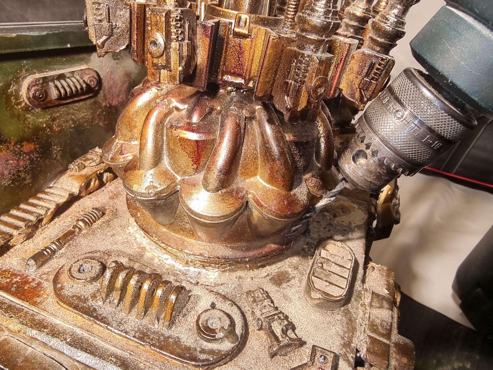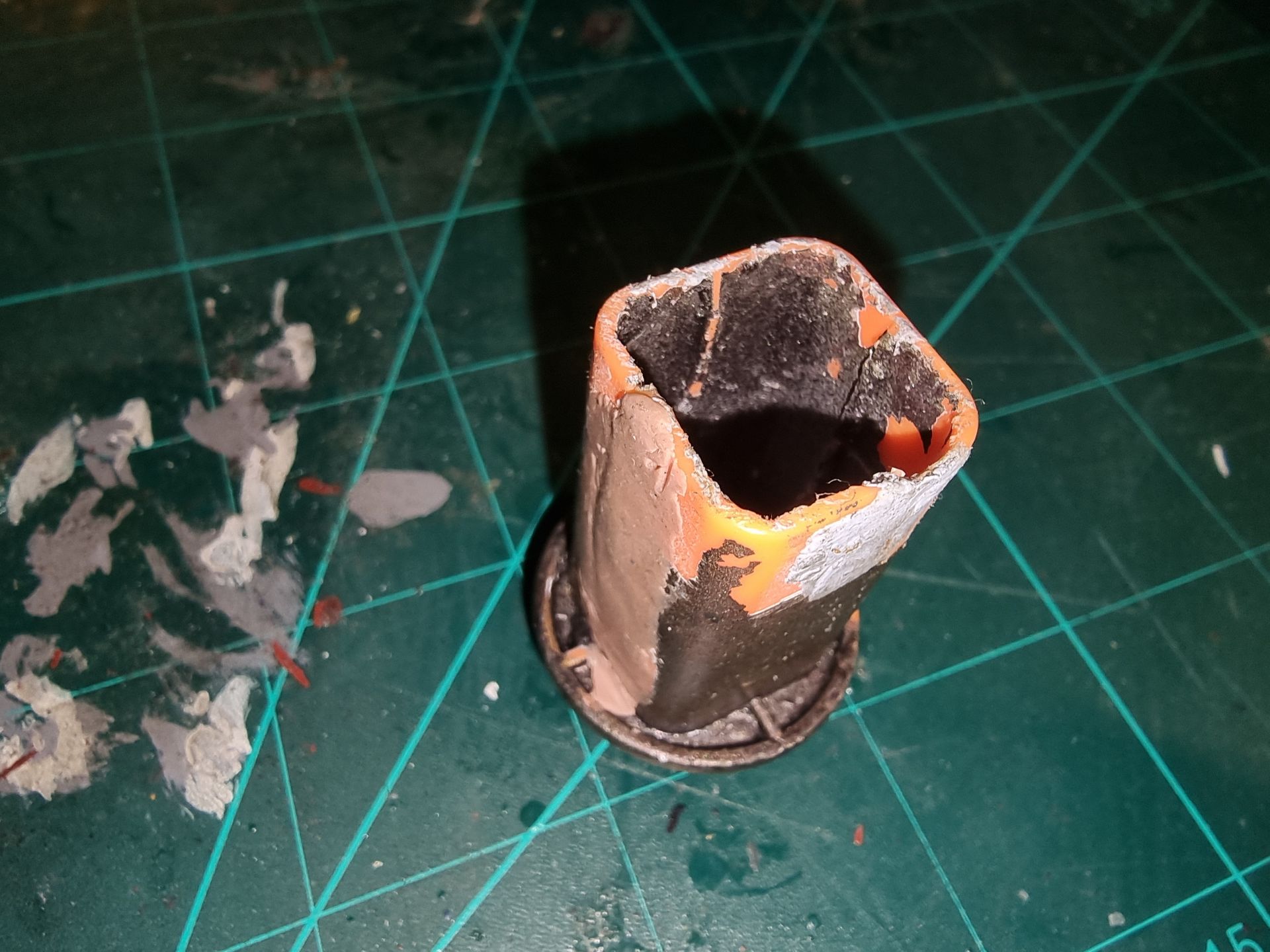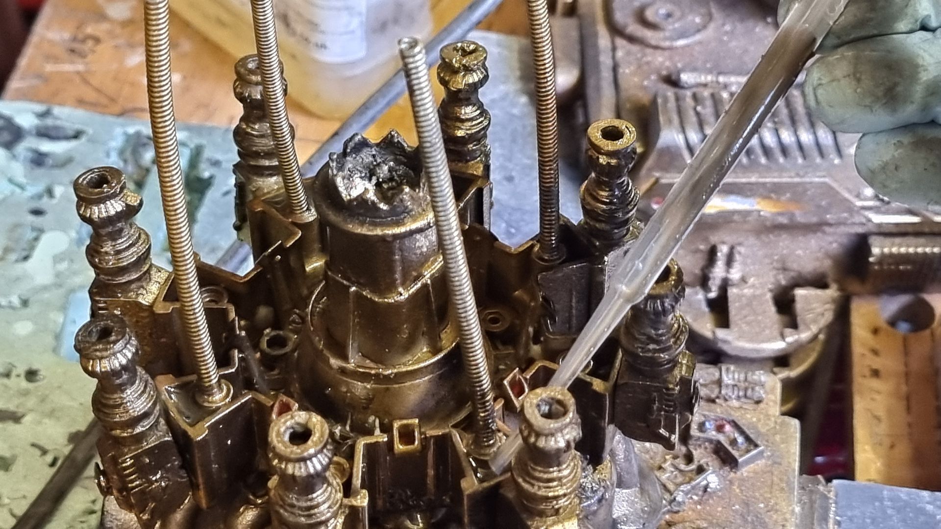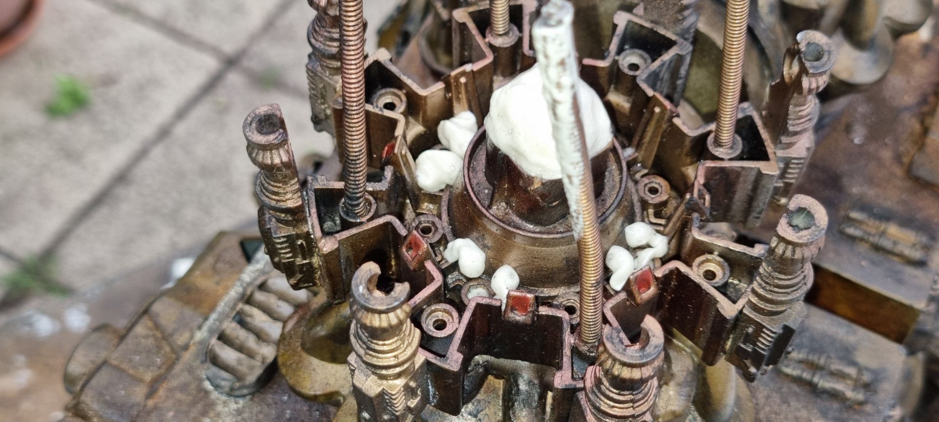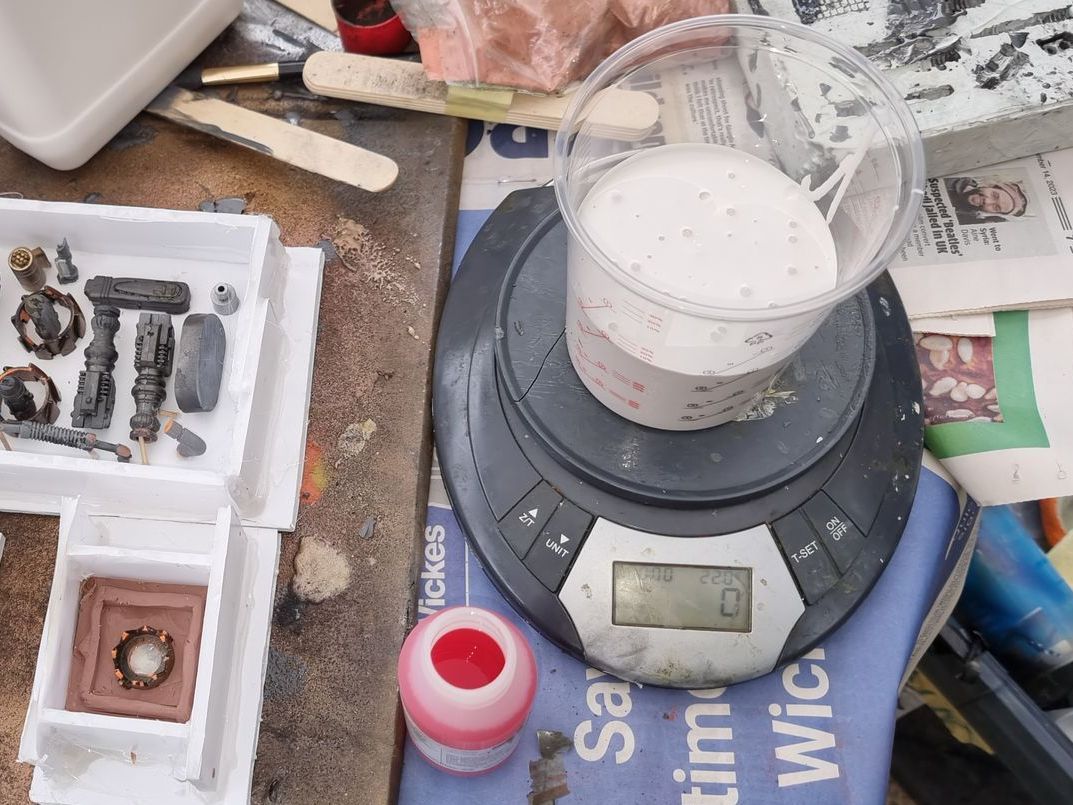 However nervous that the upward pointing kit bash gun parts were only held by 1mm or ABS from a nerf gun Cartridge I came up with the idea of filling the compartment where the rivet had gone through with resin. I also looked at use of Epoxy.