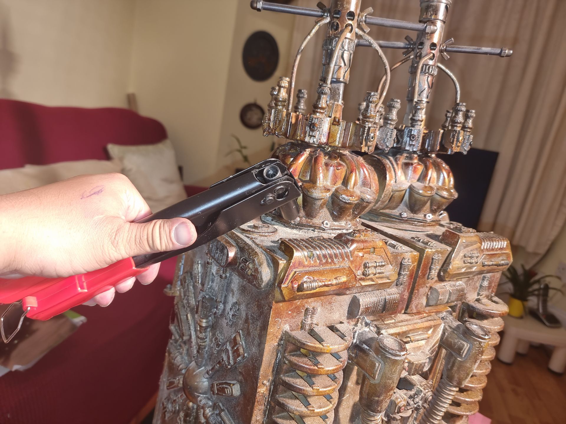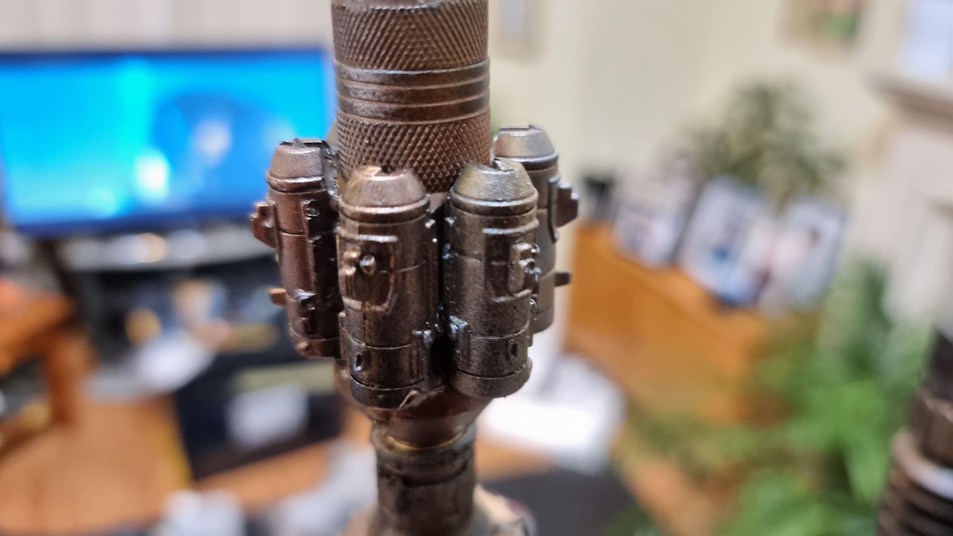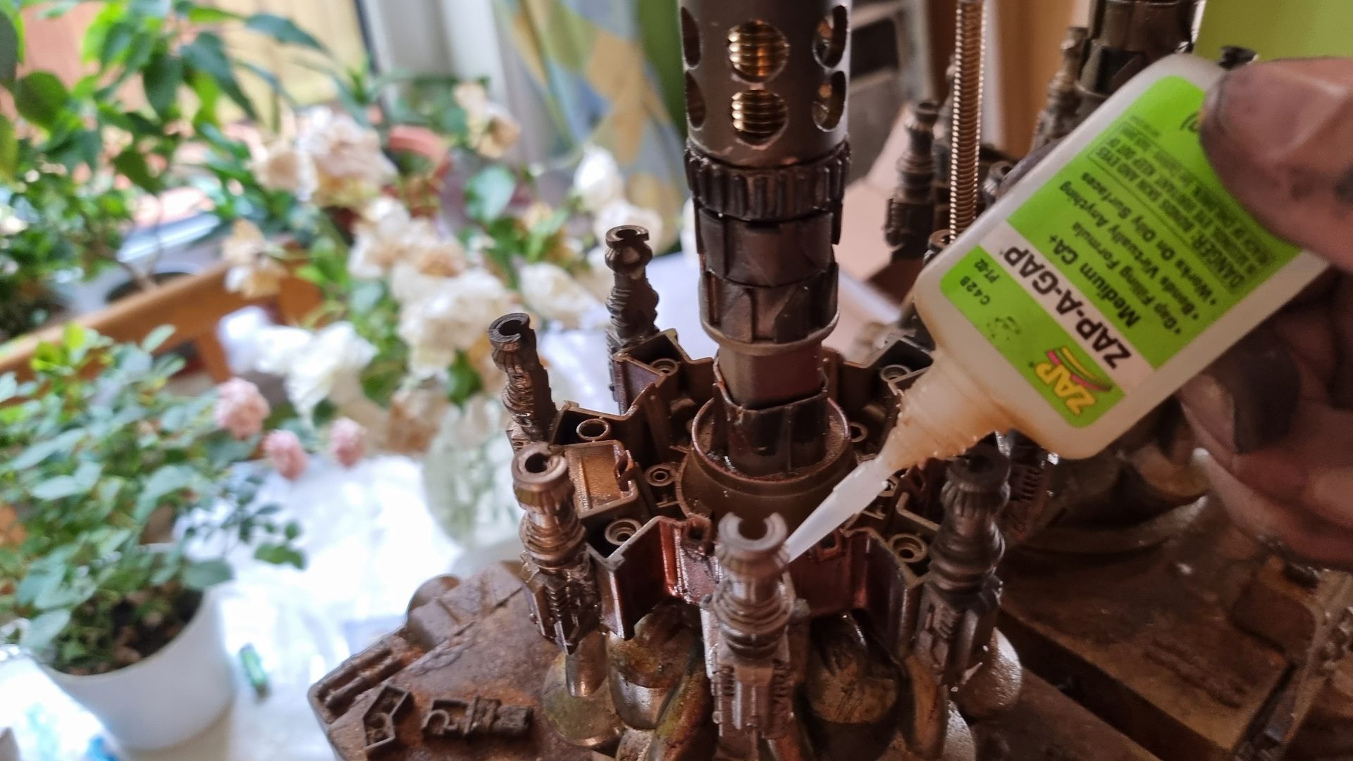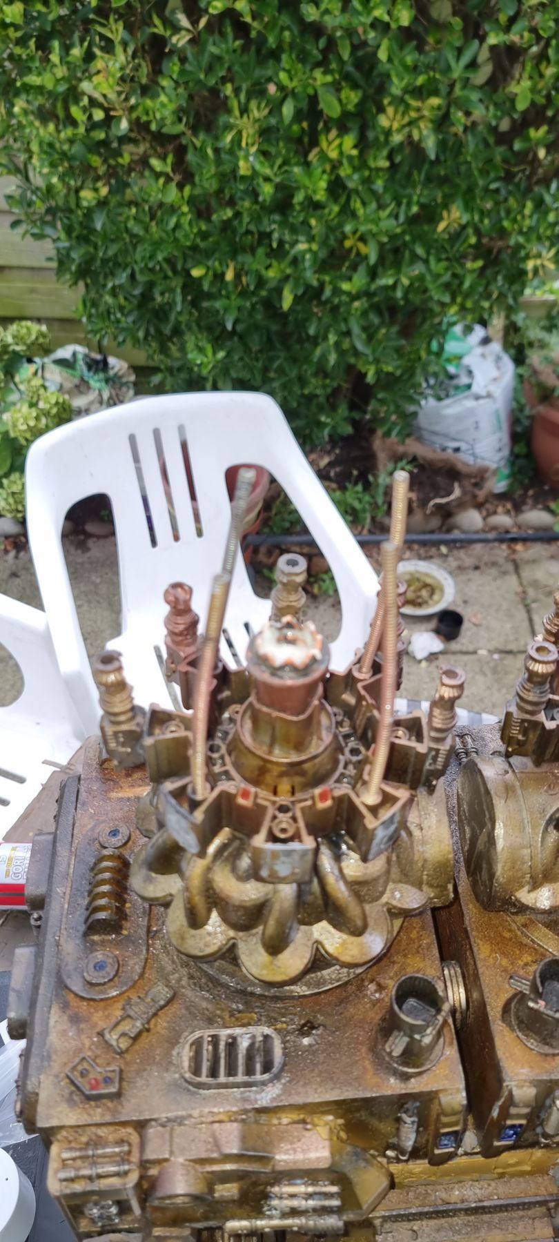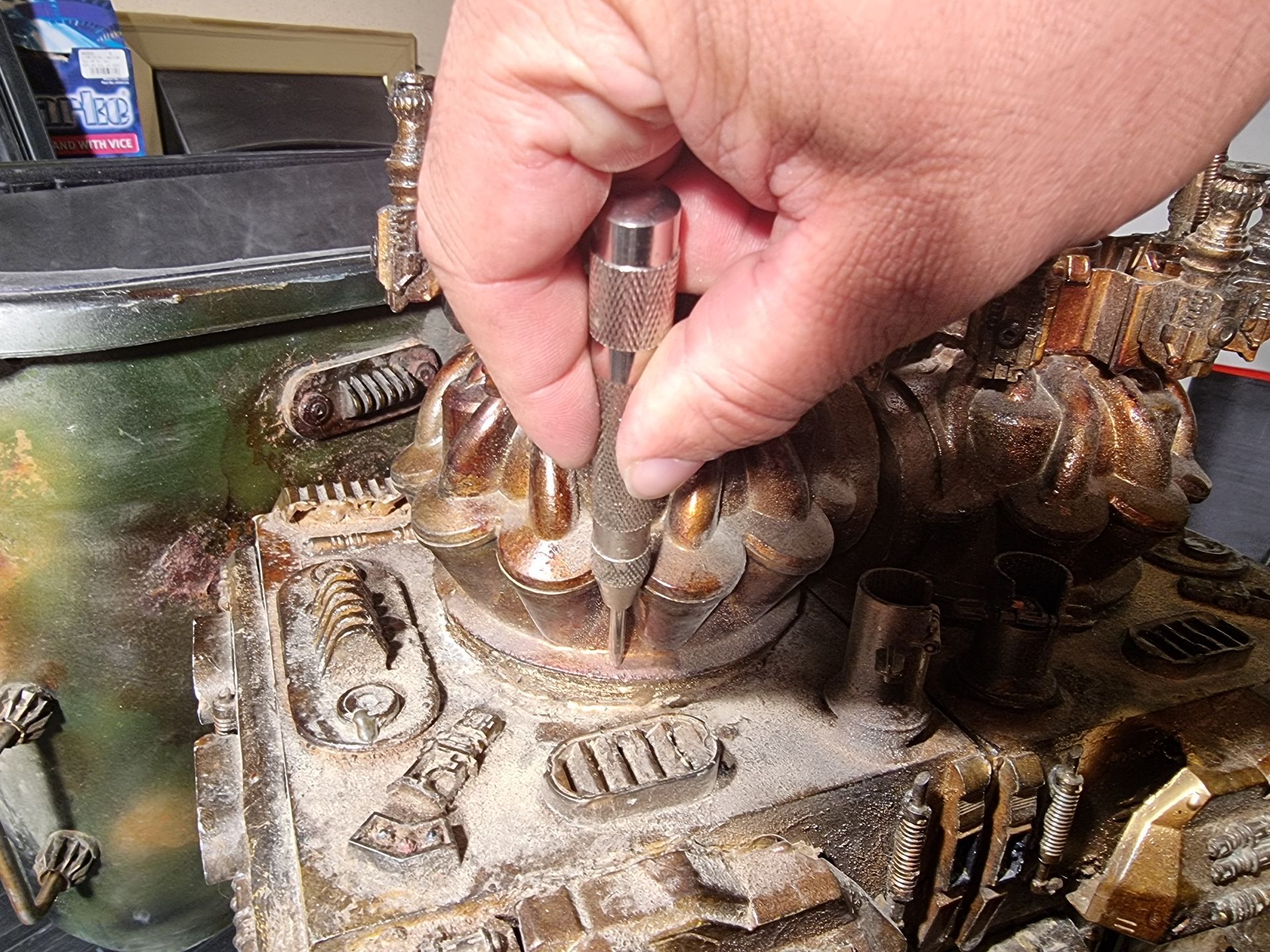 However nervous that the upward pointing kit bash gun parts were only held by 1mm or ABS from a nerf gun Cartridge I came up with the idea of filling the compartment where the rivet had gone through with resin. I also looked at use of Epoxy.