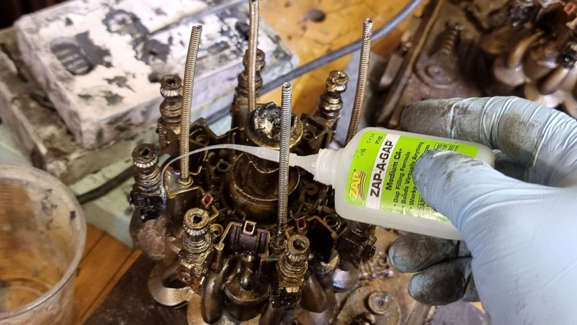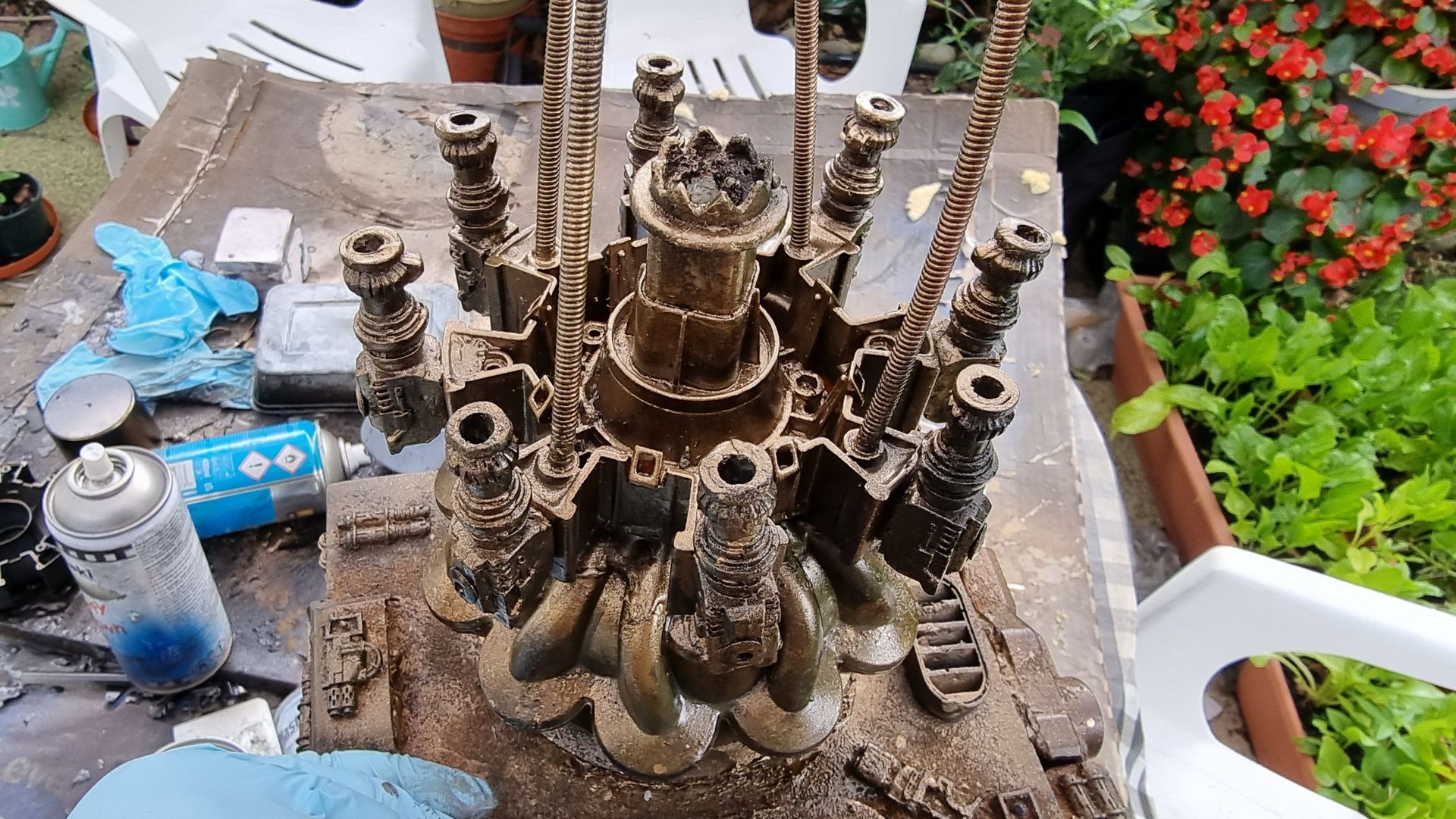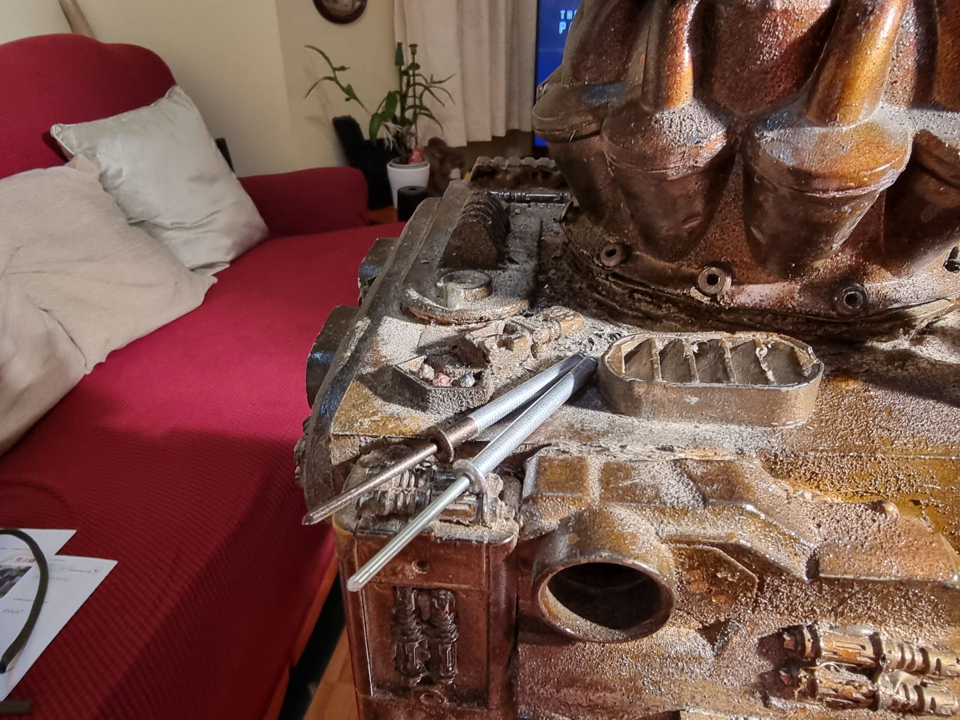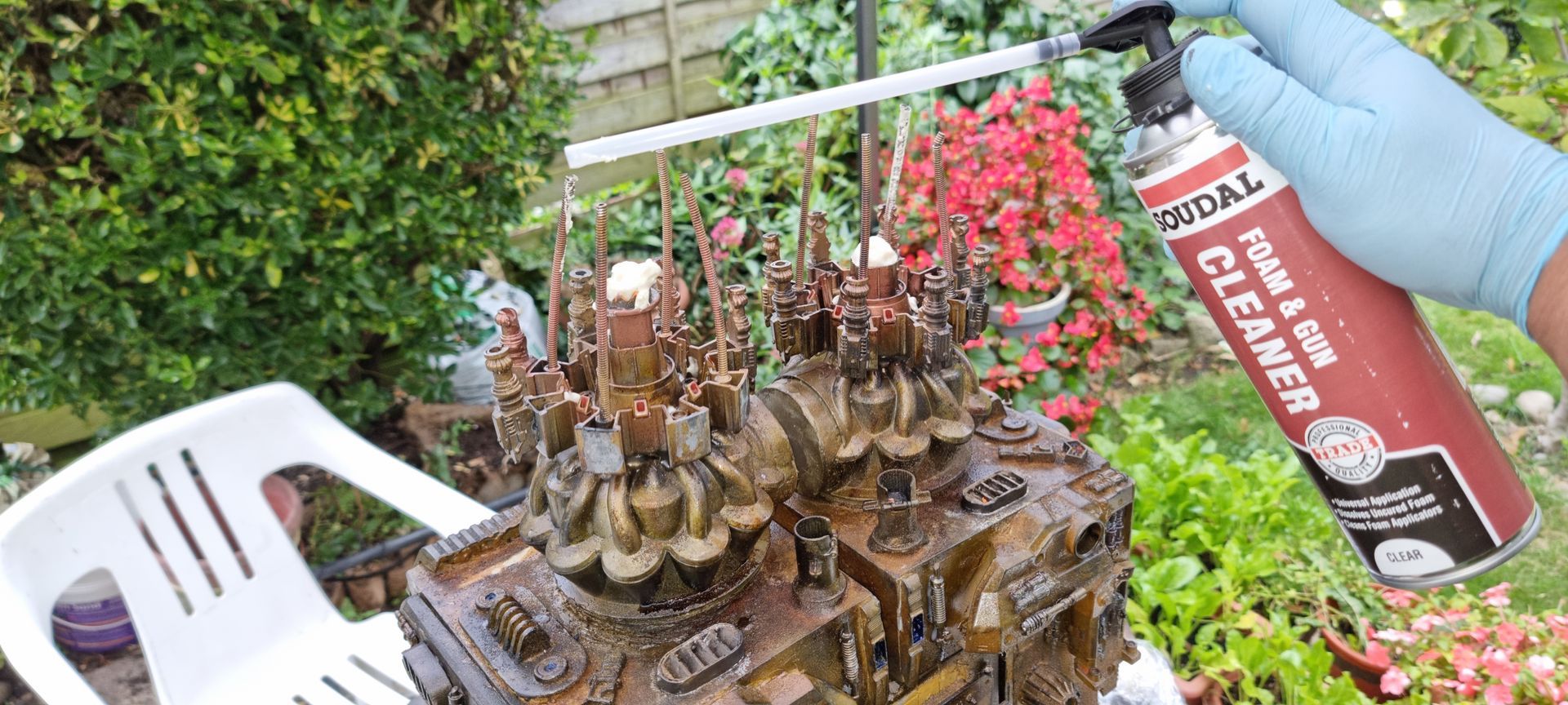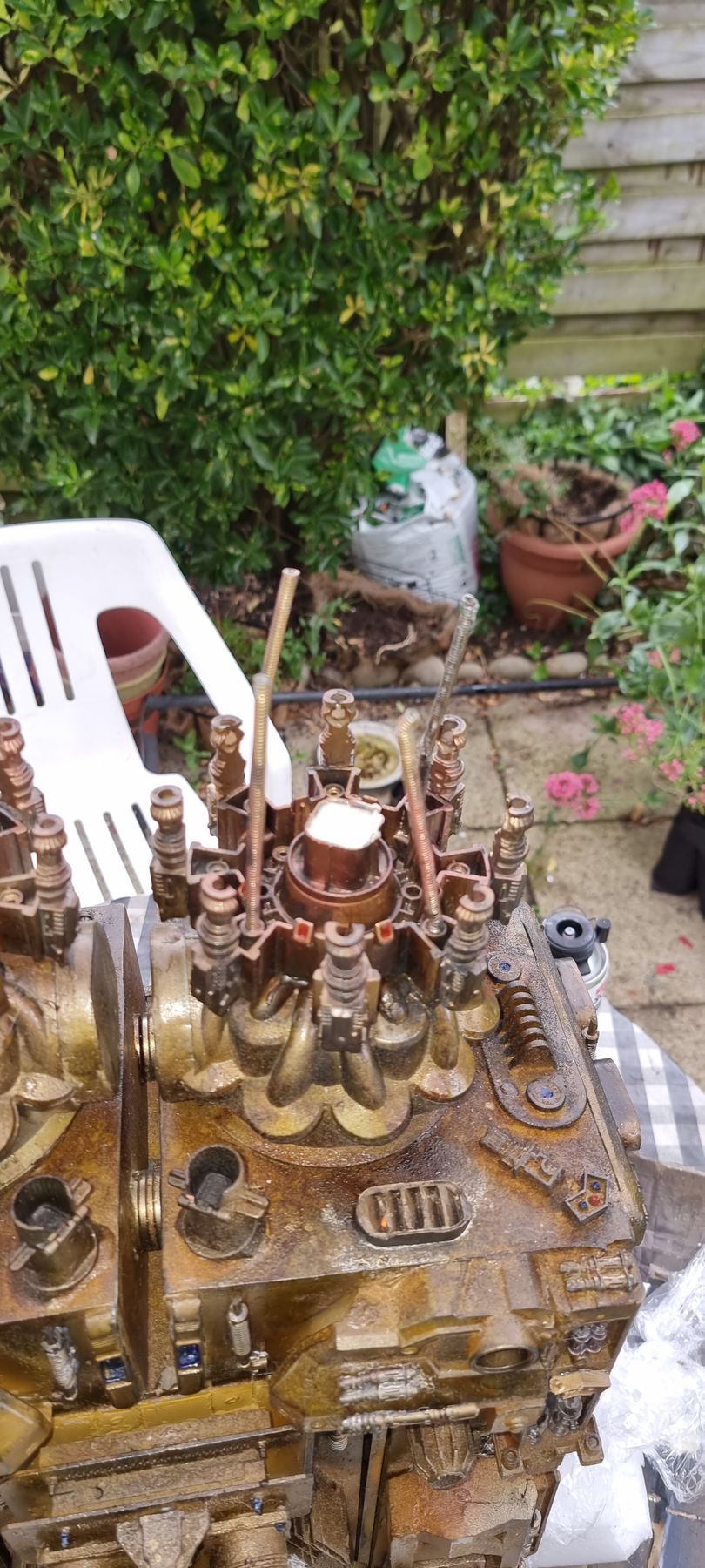 However nervous that the upward pointing kit bash gun parts were only held by 1mm or ABS from a nerf gun Cartridge I came up with the idea of filling the compartment where the rivet had gone through with resin. I also looked at use of Epoxy.