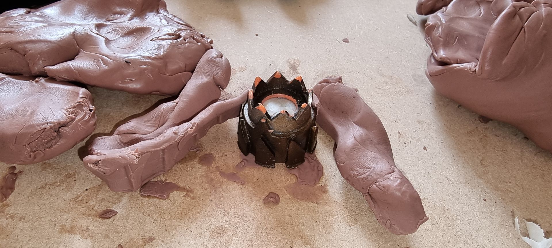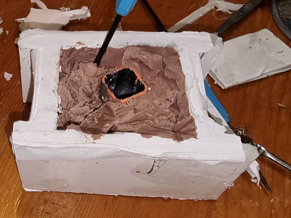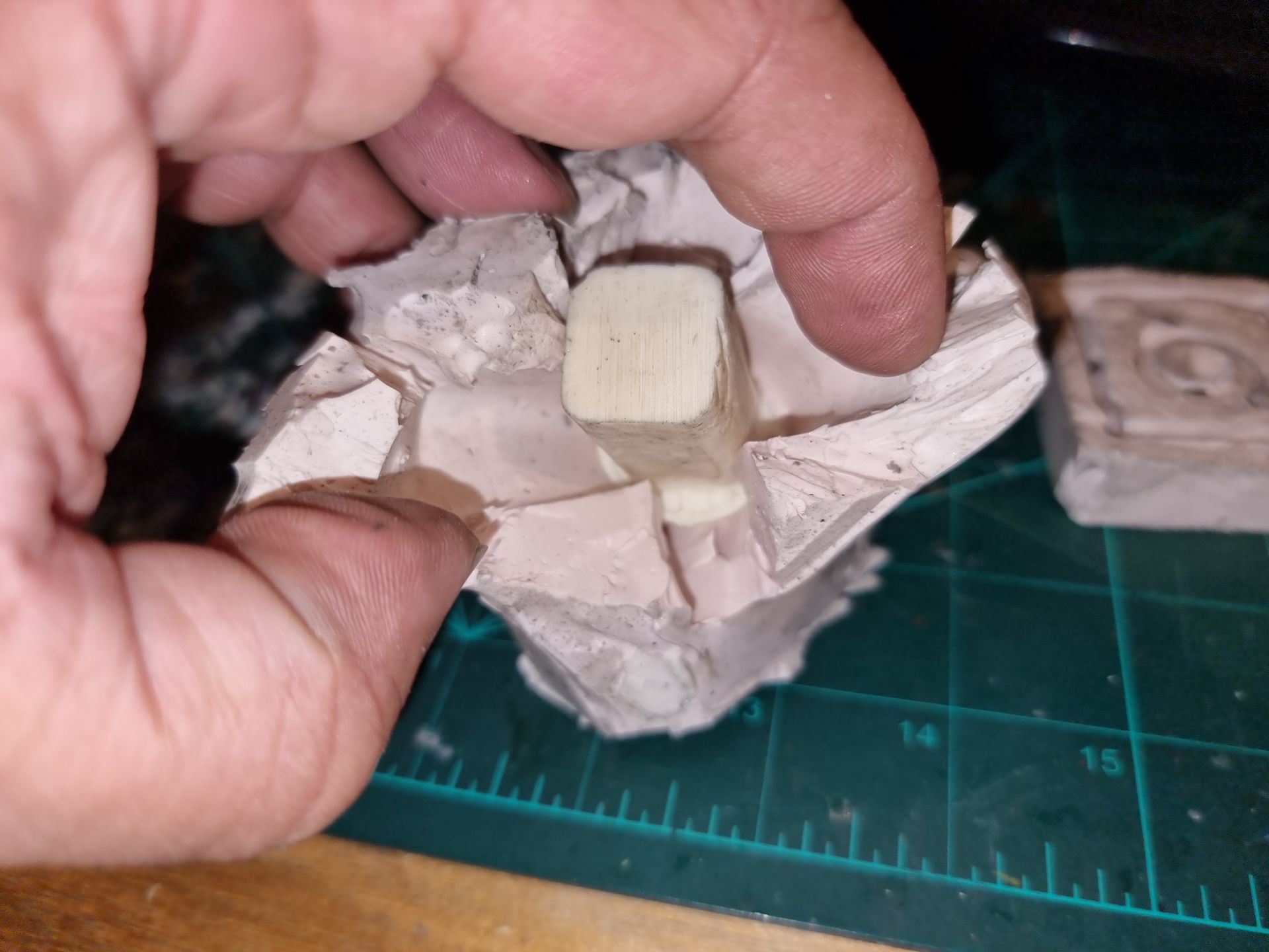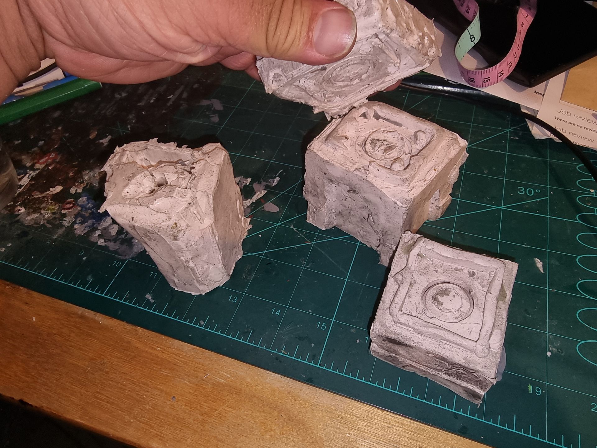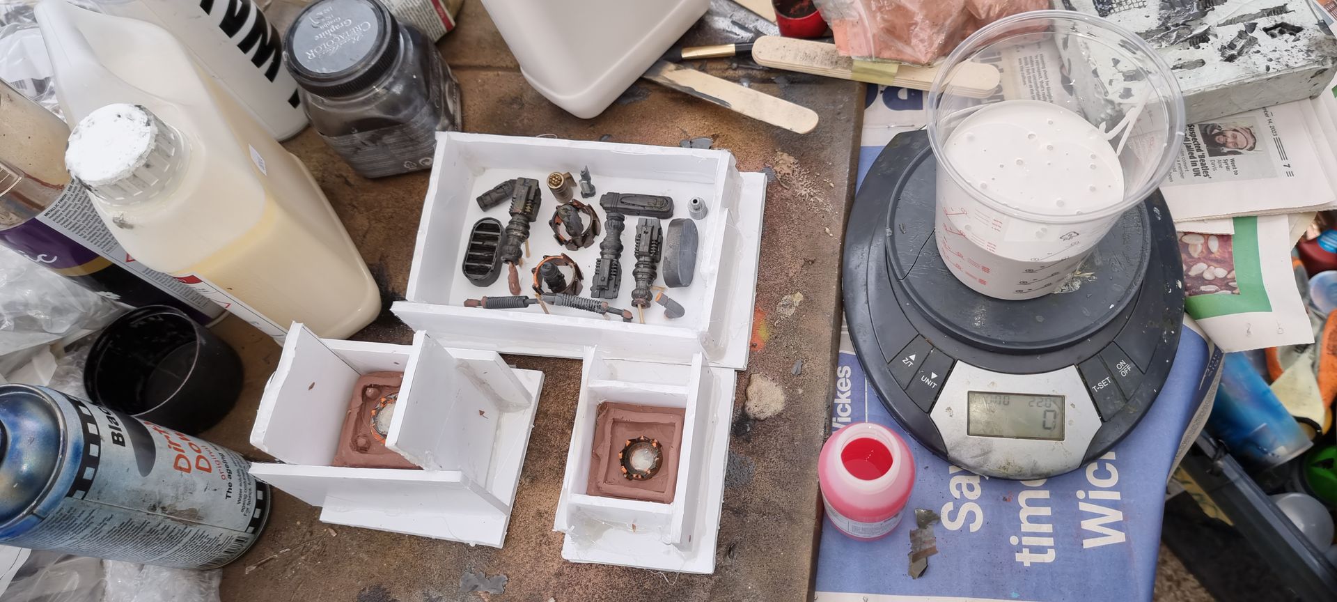 As these were complex fully 3D shapes with overhangs and internal cavities 2-part moulds were required. Plastaline was used to mask off the lower halves of the mould making blocks, whilst the first part of the moulds was filled with silicon and when set quick release was spray was applied before filling the second half with silicon.