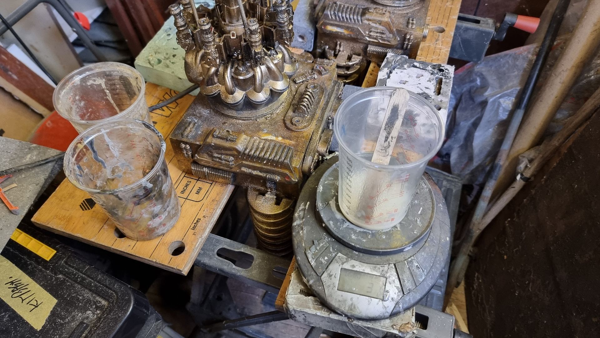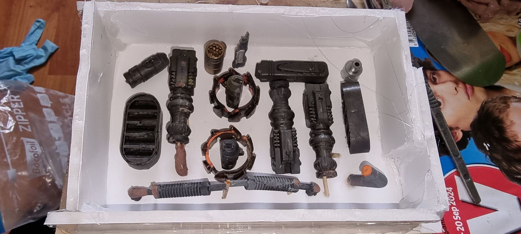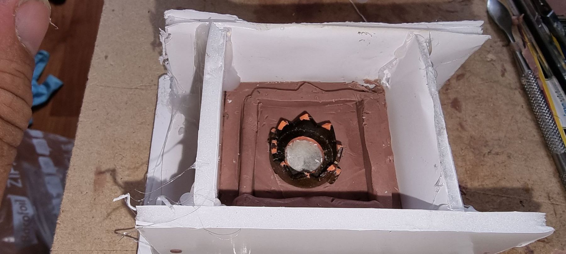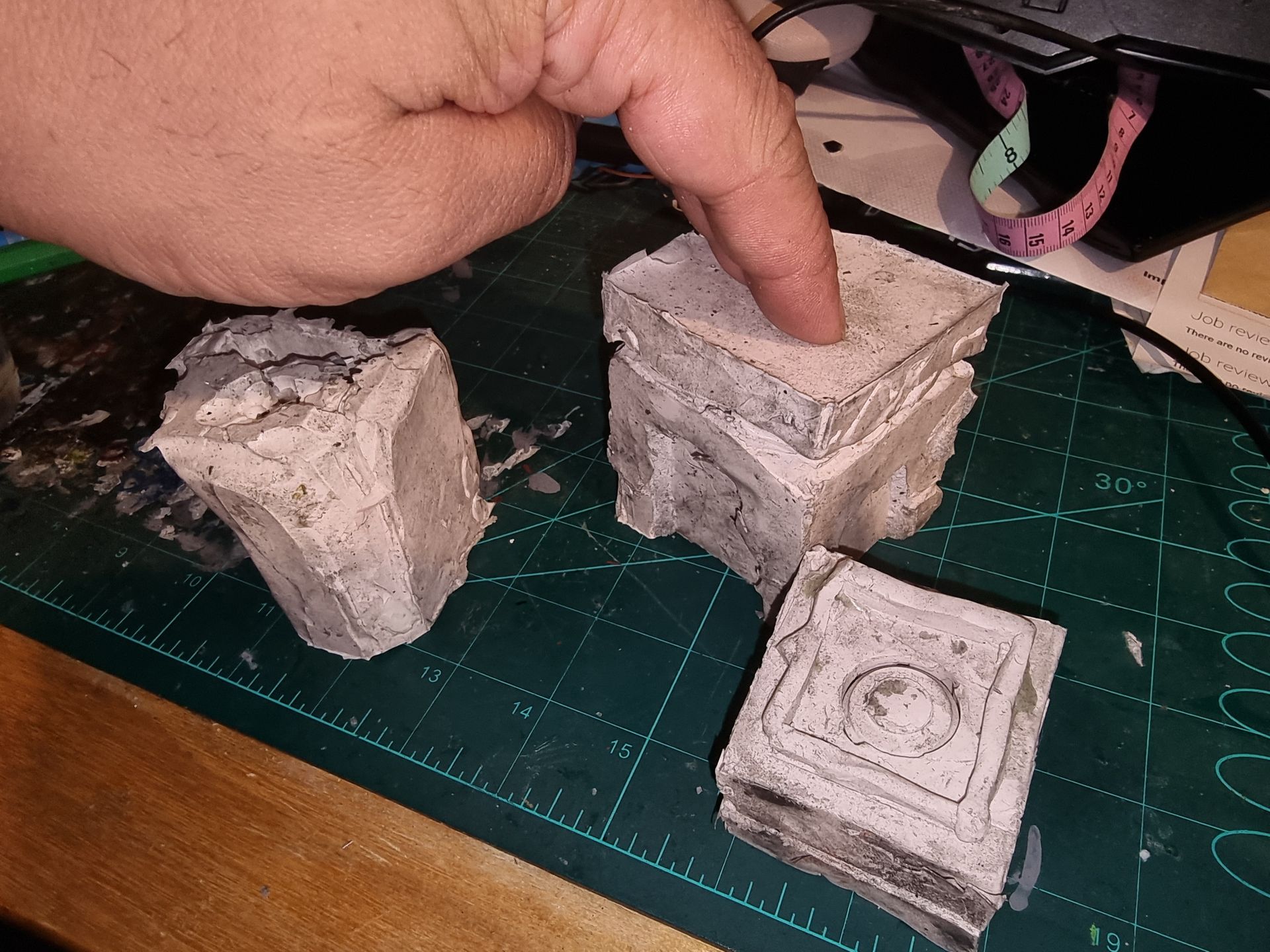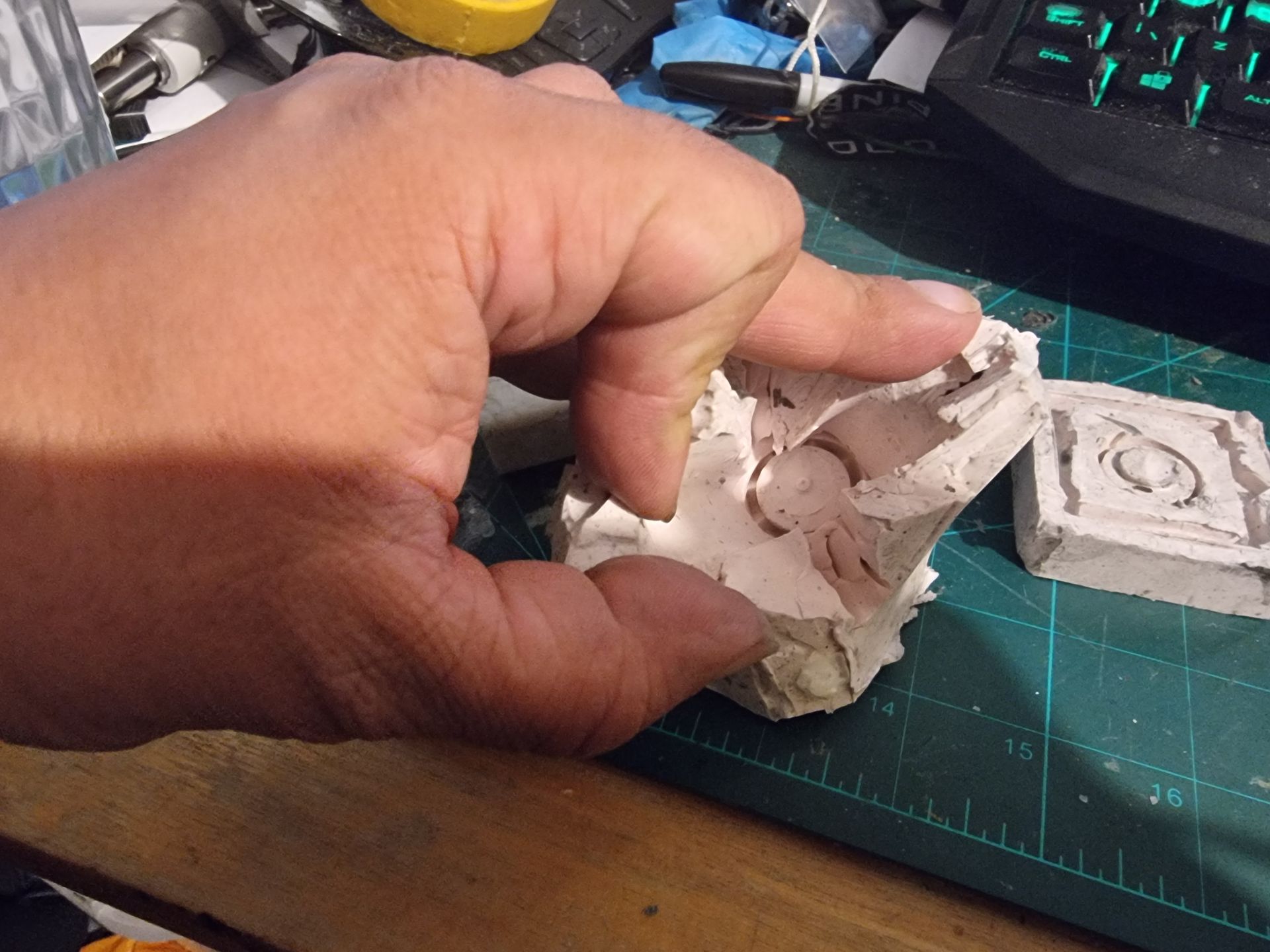 As these were complex fully 3D shapes with overhangs and internal cavities 2-part moulds were required. Plastaline was used to mask off the lower halves of the mould making blocks, whilst the first part of the moulds was filled with silicon and when set quick release was spray was applied before filling the second half with silicon.
