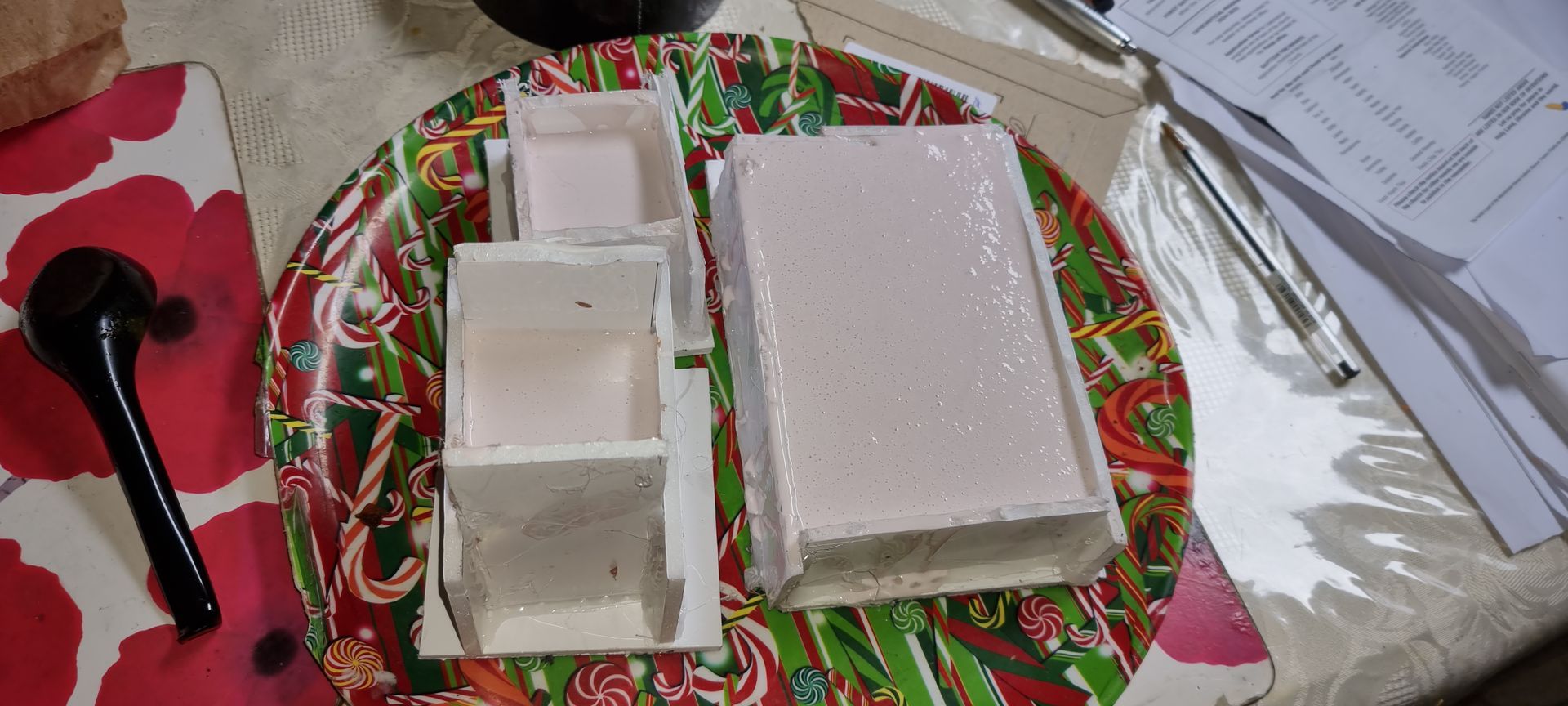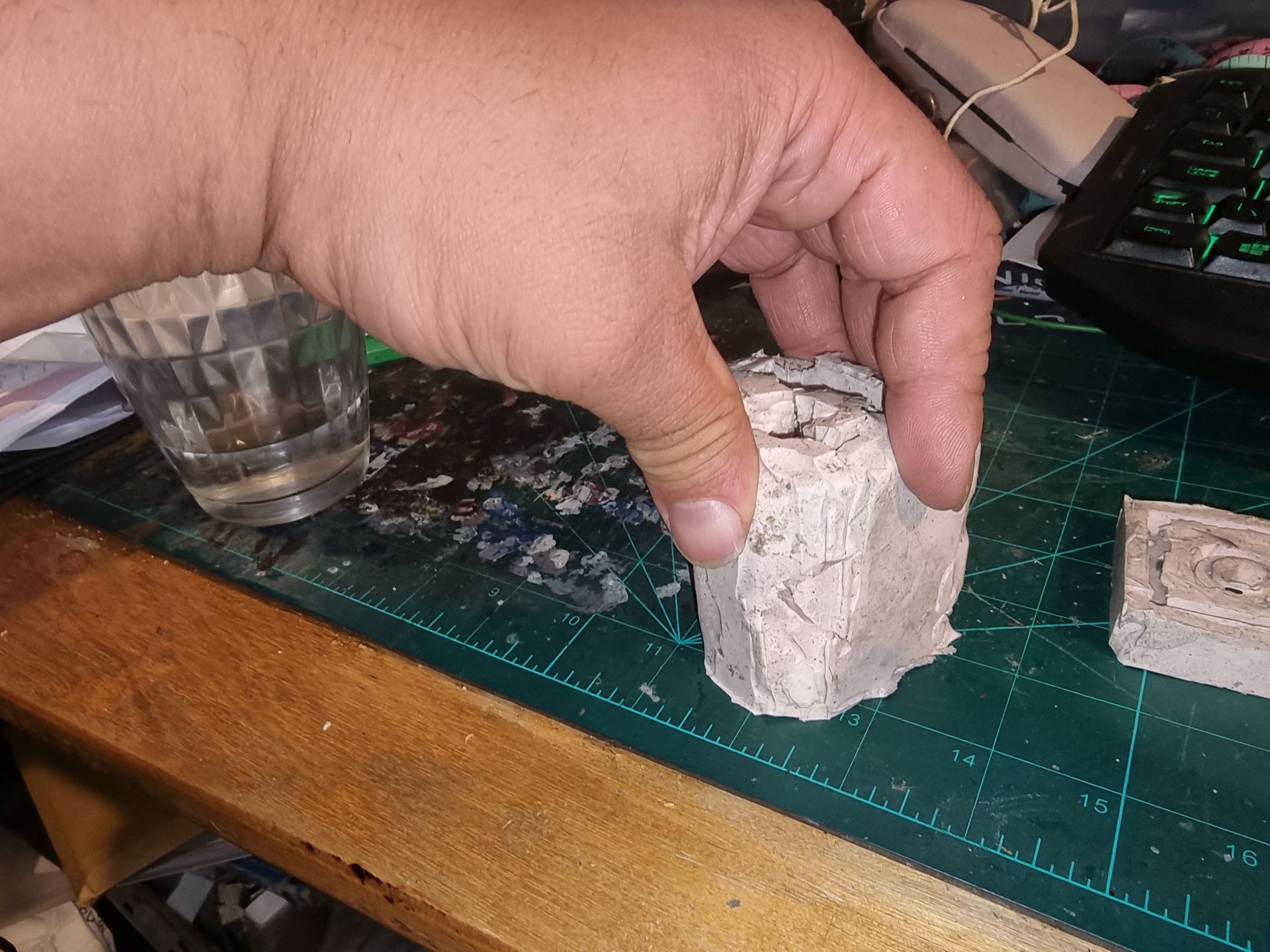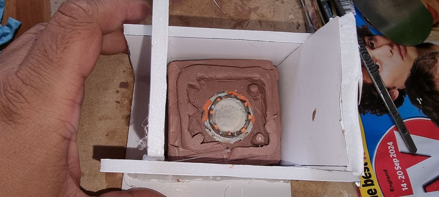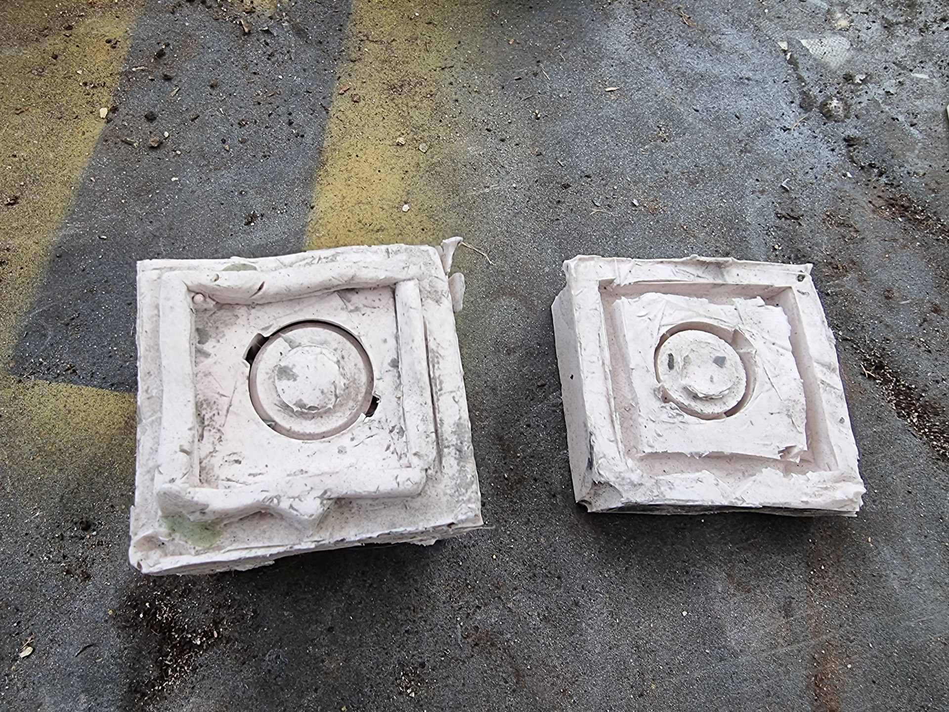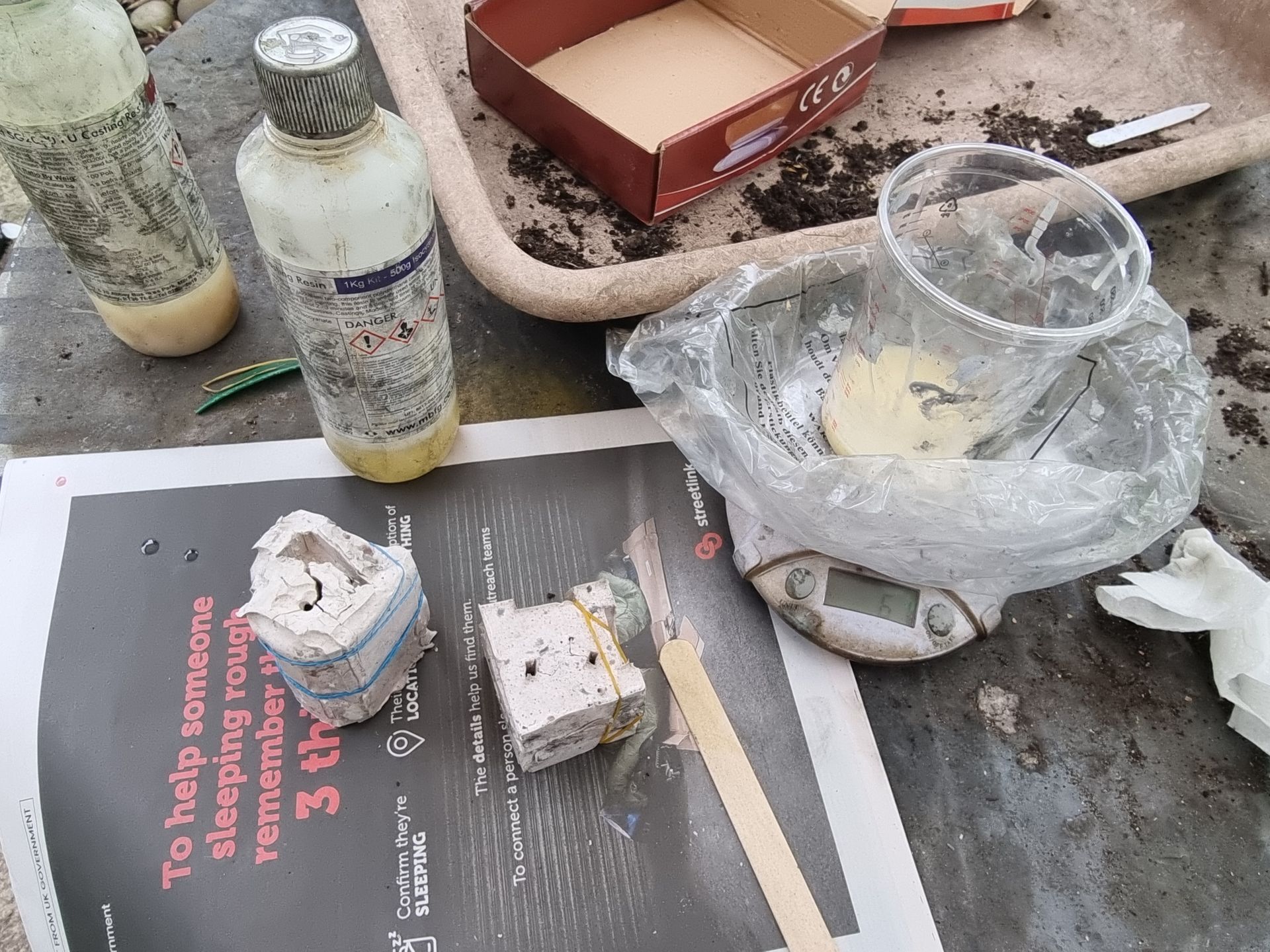 As these were complex fully 3D shapes with overhangs and internal cavities 2-part moulds were required. Plastaline was used to mask off the lower halves of the mould making blocks, whilst the first part of the moulds was filled with silicon and when set quick release was spray was applied before filling the second half with silicon.
