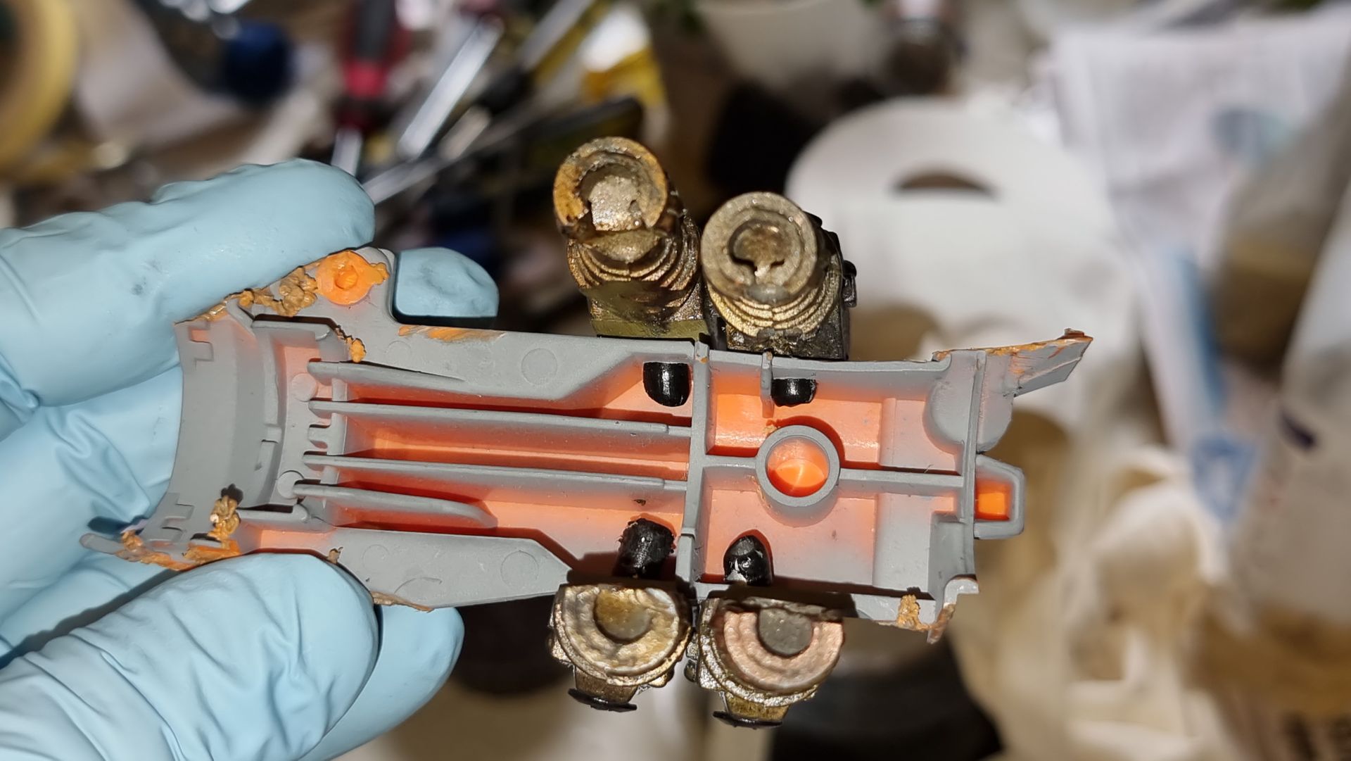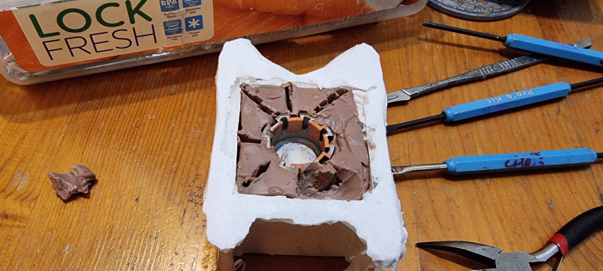 Just above the Dyson motors was a set of interlocking connection parts taken from Nerf guns. Given these were places at a key stress point and could not be replaced as from certain Nerf gun parts, that had been purchased from Ebay, second hand, and were most likely discontinued it seemed wise to make moulds so replacement and spares could be made.