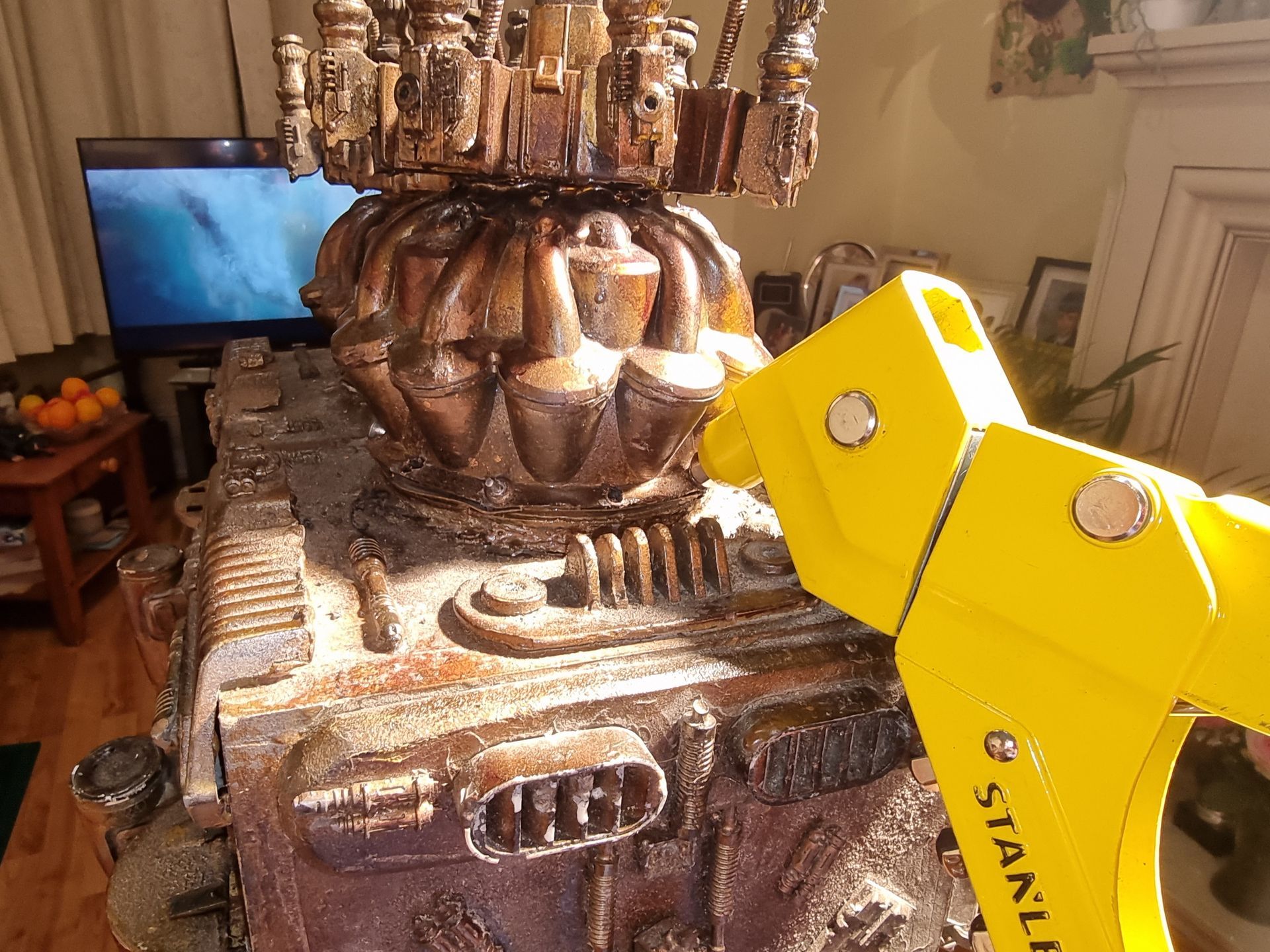 Various kit bash parts kept falling off as only glued on. The cylinders as the top often as handled they were held to twist the communication towers rubbing them off and the the up pointing gun like parts on the nerf disk