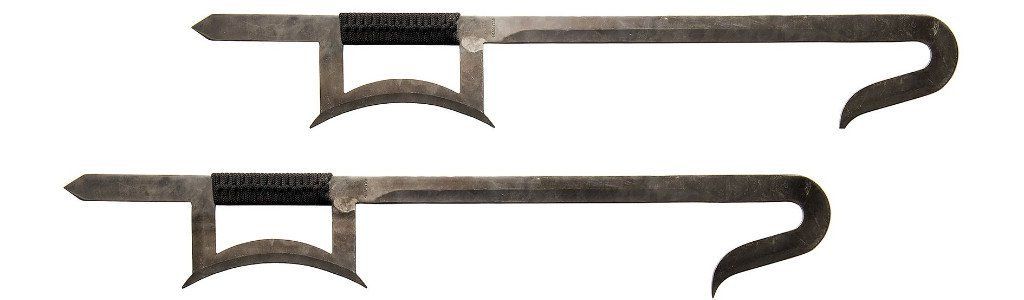 As can be seen in the black and white image these were useful for hooking and pulling away opponents weapons, exposing the opponents body for striking with a secondary weapon.
