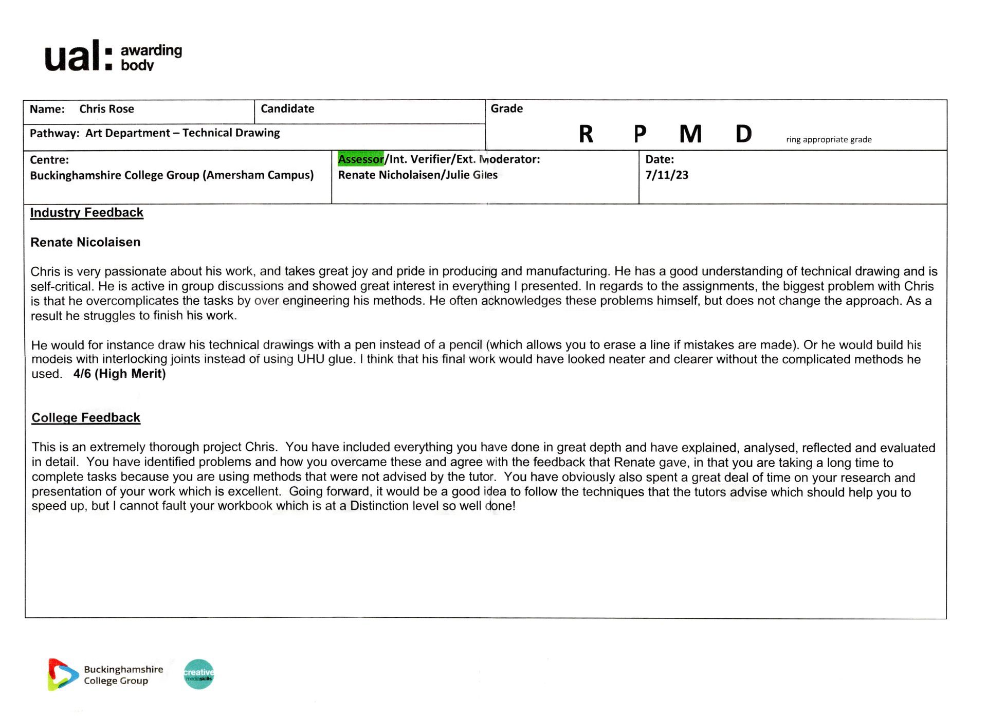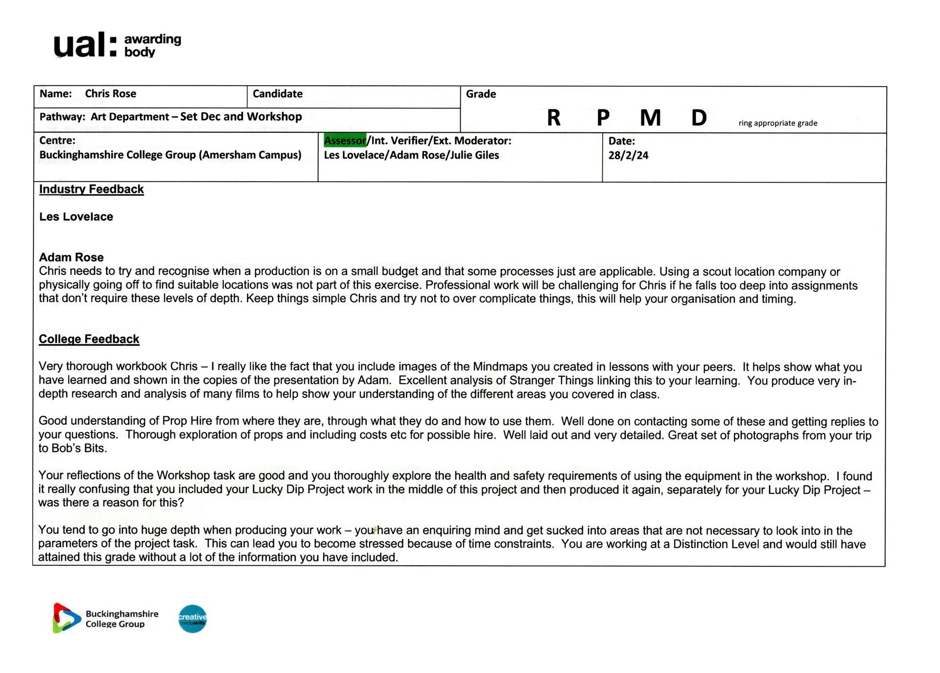 These are the module reports I received over the academic year at Creative Media Skills in Pinewood Studios. As can be seen all were distinctions bar the first model where I got a high merit whilst finding my feet. I also received one of only 3 gold stars for above and beyond effort.