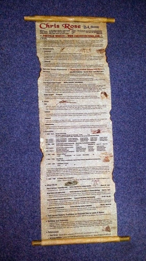 This is my scroll CV, on parchment like paper, stained and burned with custom printing techniques