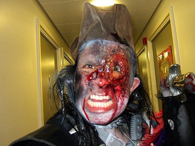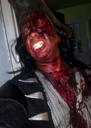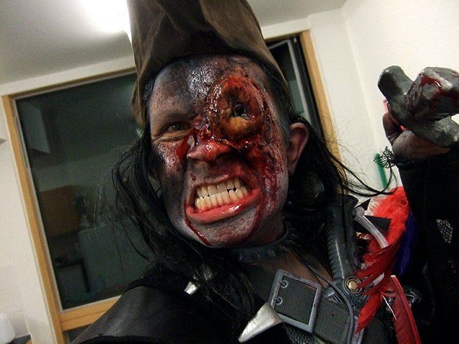 Have used my pirate costume, prop weapons and various DIY prosthetic over several Halloween years, with black and white hair spray, home made syrup blood and custard puss. Peckers the frisky parrot joined in the party spirit to pull in he other birds. (Mainly as tend to be broke at this time and had the costume).