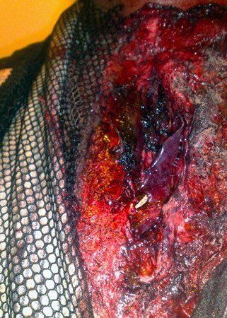 The skinned look was some condom rubber, cotton wool and latex ans some tissue with syrup food dye blood.