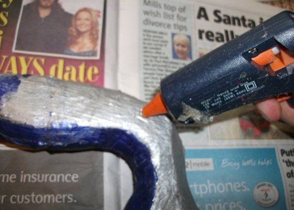 - The thinner cross-rods needed to be level with the 10mm handle / hilt and blade tubes and to level with the foam so a novel use of plastic spoon handles was incorporated. All held together with glue gun glue which has some flex thus impact resistance. These were then sanded down and inserted with contact glue into the centre blanks.