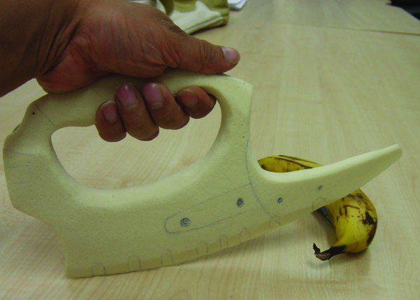 The problem was that the form for the knife being developed also happened to increasingly ideal for a form of very efficient and lethal combat knife / martial arts weapon. Much as it was genuinely conceived as a high-end multi-use kitchen knife, it appeared to be so efficient in the hands of anyone somewhat fit and agile, with only basic martial arts skills that lecturers were too scared to allow proving principle. It also gained widespread interest from other students.