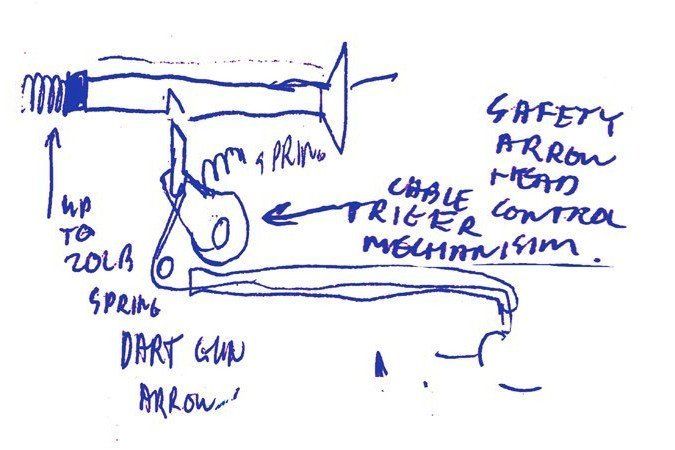 What was first looked into one or more dart gun system firing official regulation safety spec LARP arrows. It is thought wiser to incorporate 3rd party projectiles here due to the importance of safety so the shaft cannot go through the head of the projectile and penetrate a human, especially the eyes.