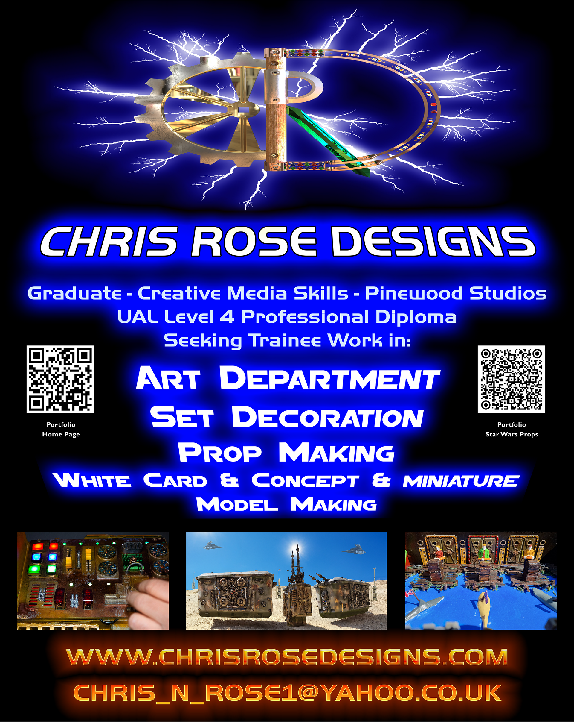 - The QR codes include one for the website home page and one for my best work, my Star Wars project props. This can be seen in the left and middle images on the front.