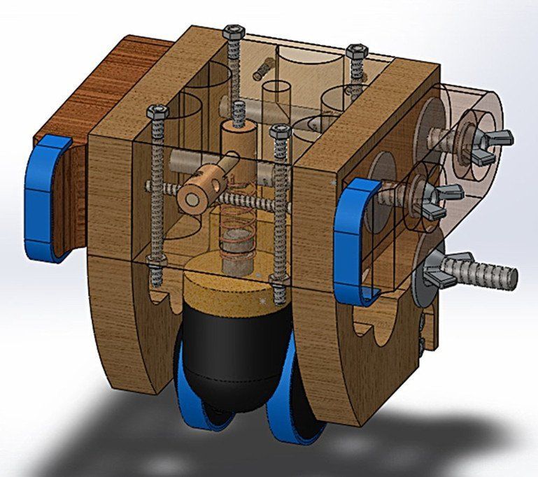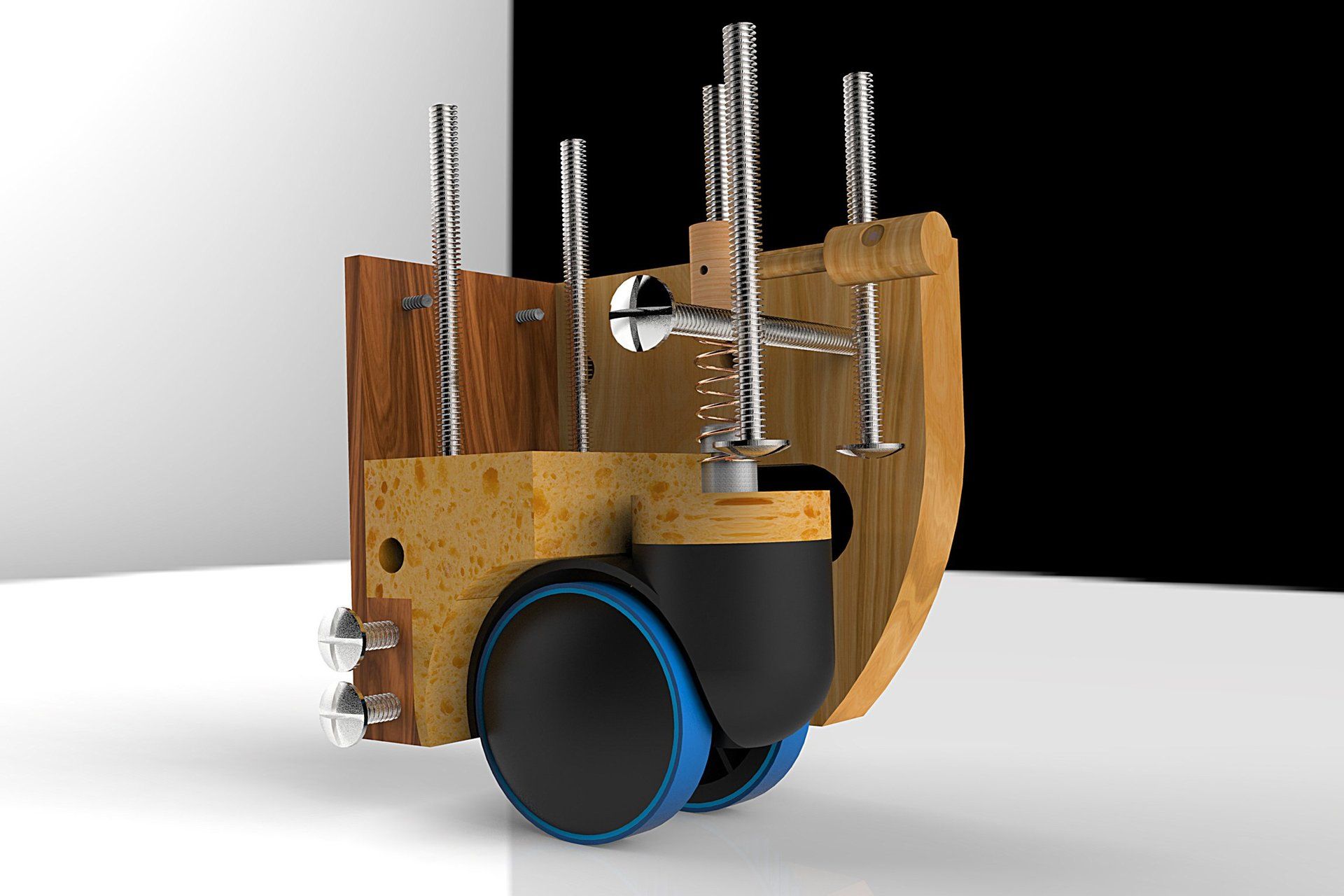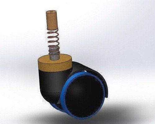 - The forward pin in the centre of the bottom left pair image holds the wheel suspension plunger in place stopping twisting to keep the wheel straight and hold it in place giving the spring something to bounce against. The sides hold the brakes and provide housing structure. The rear foam also softens the vibrations from the floor with elastic band tyres. The brakes can also be bolted up or down, on or off. Keyshot was used to render some of the images beyond standard Solidworks colour.