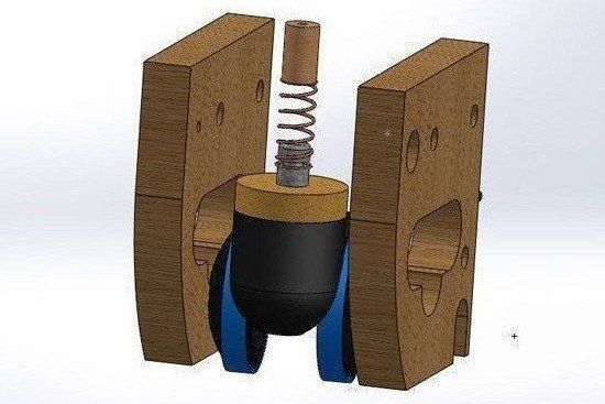 - The forward pin in the centre of the bottom left pair image holds the wheel suspension plunger in place stopping twisting to keep the wheel straight and hold it in place giving the spring something to bounce against. The sides hold the brakes and provide housing structure. The rear foam also softens the vibrations from the floor with elastic band tyres. The brakes can also be bolted up or down, on or off. Keyshot was used to render some of the images beyond standard Solidworks colour.