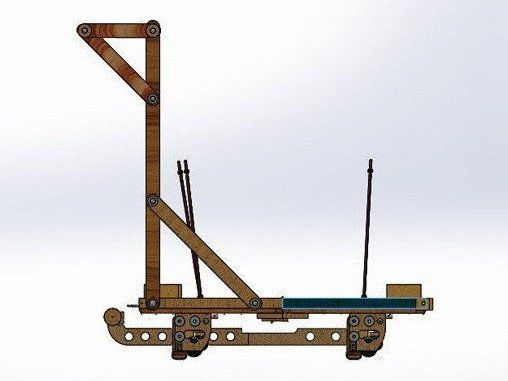 The breaking system involving 4 wheel units controlled by one pull lever had to be able to fold into itself on the rear section as well so a system for that to happen had to be designed using Solidworks as a CAD system. You pull and lift the handle at the front this pulls up or drops all four brakes. The forward pair can be disconnected and the joining arms folded into the rear section. Then the base can be folded up.