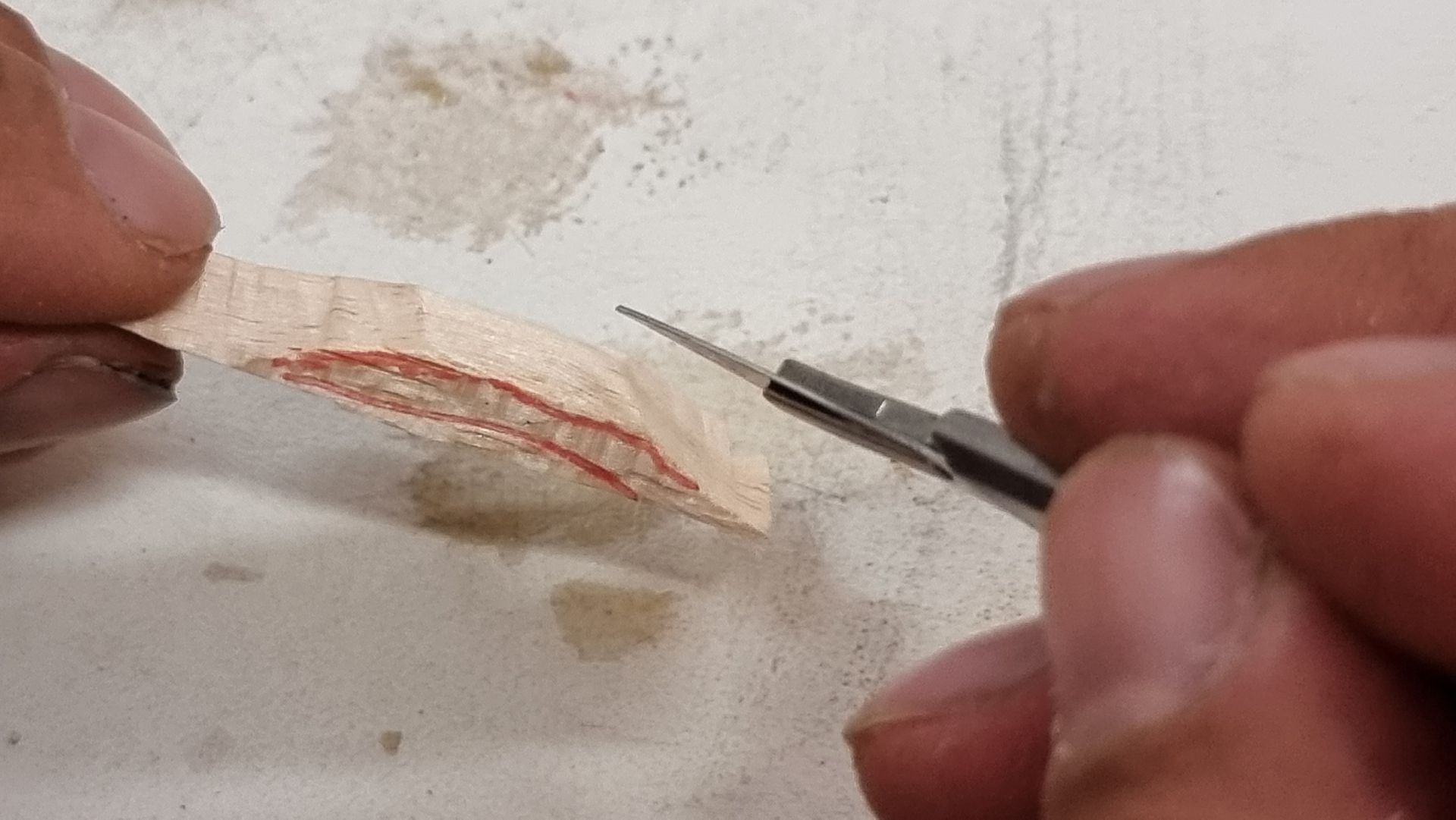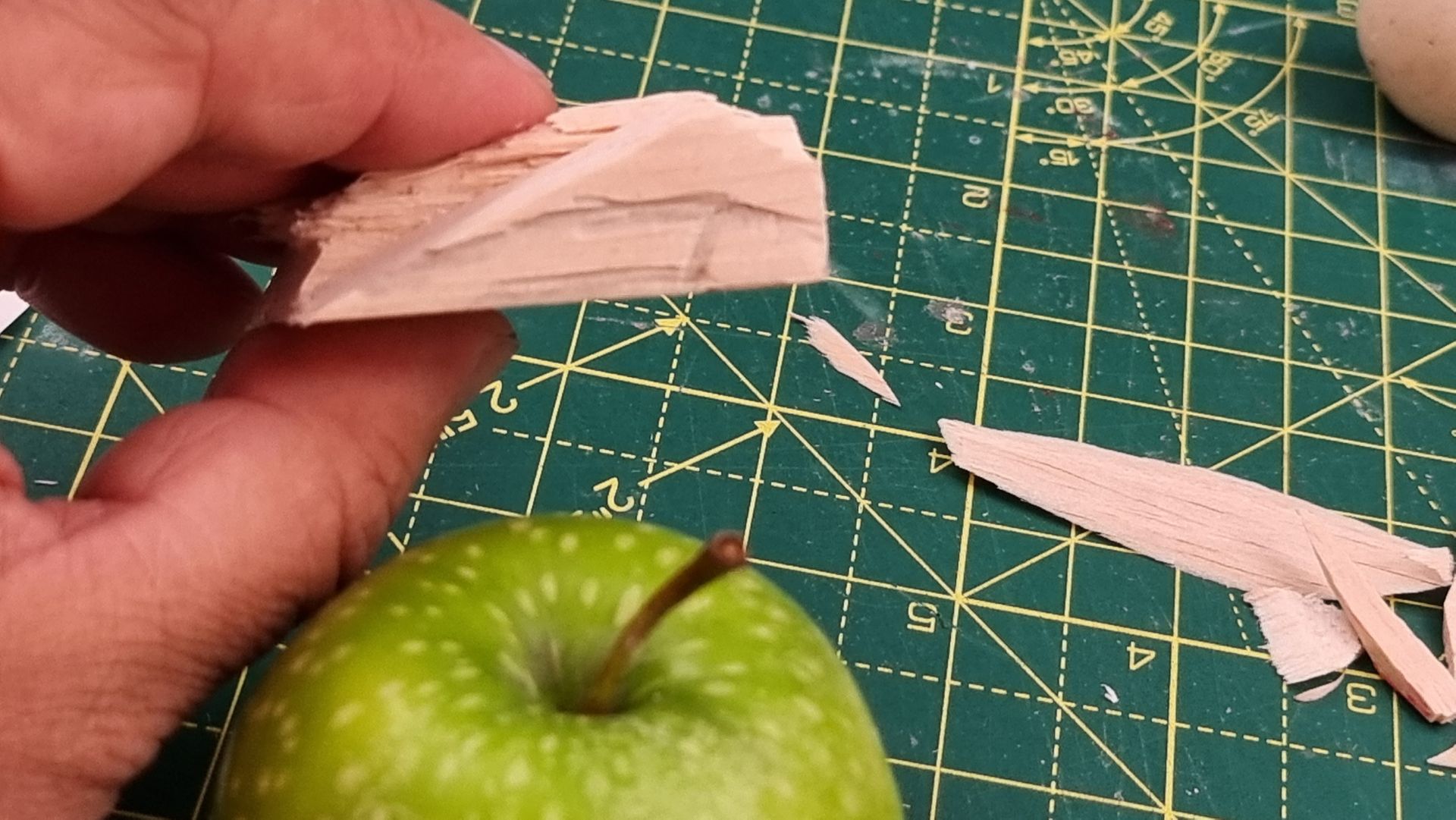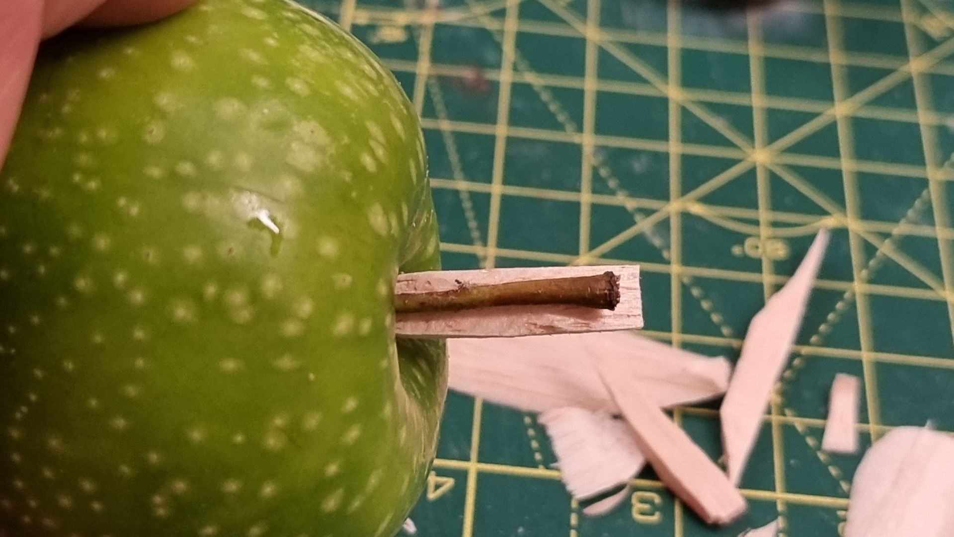 The apple stalks were carved from balsa wood with scalpels, sandpaper and files. Leaves were sculpted from Plastaline.