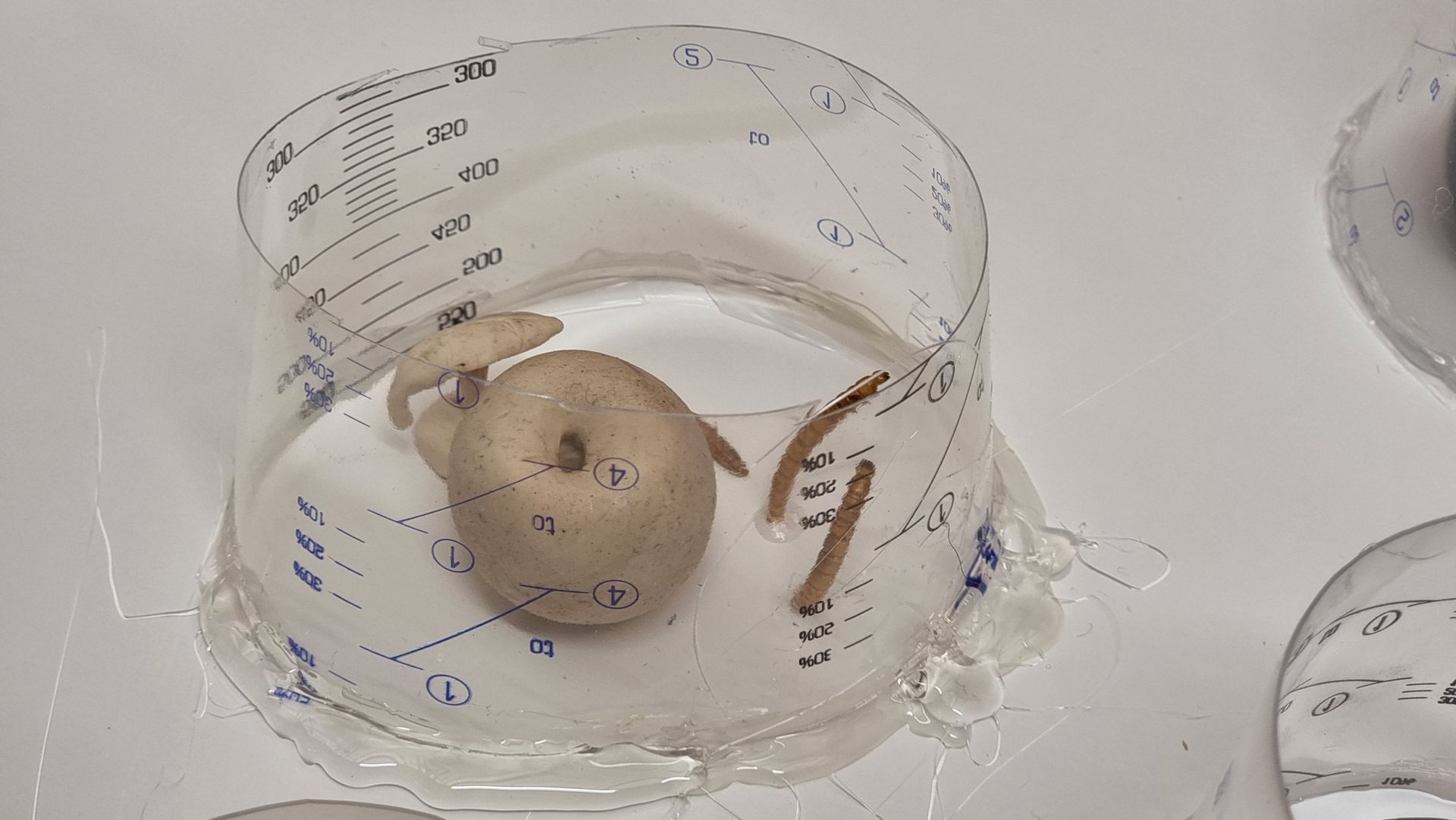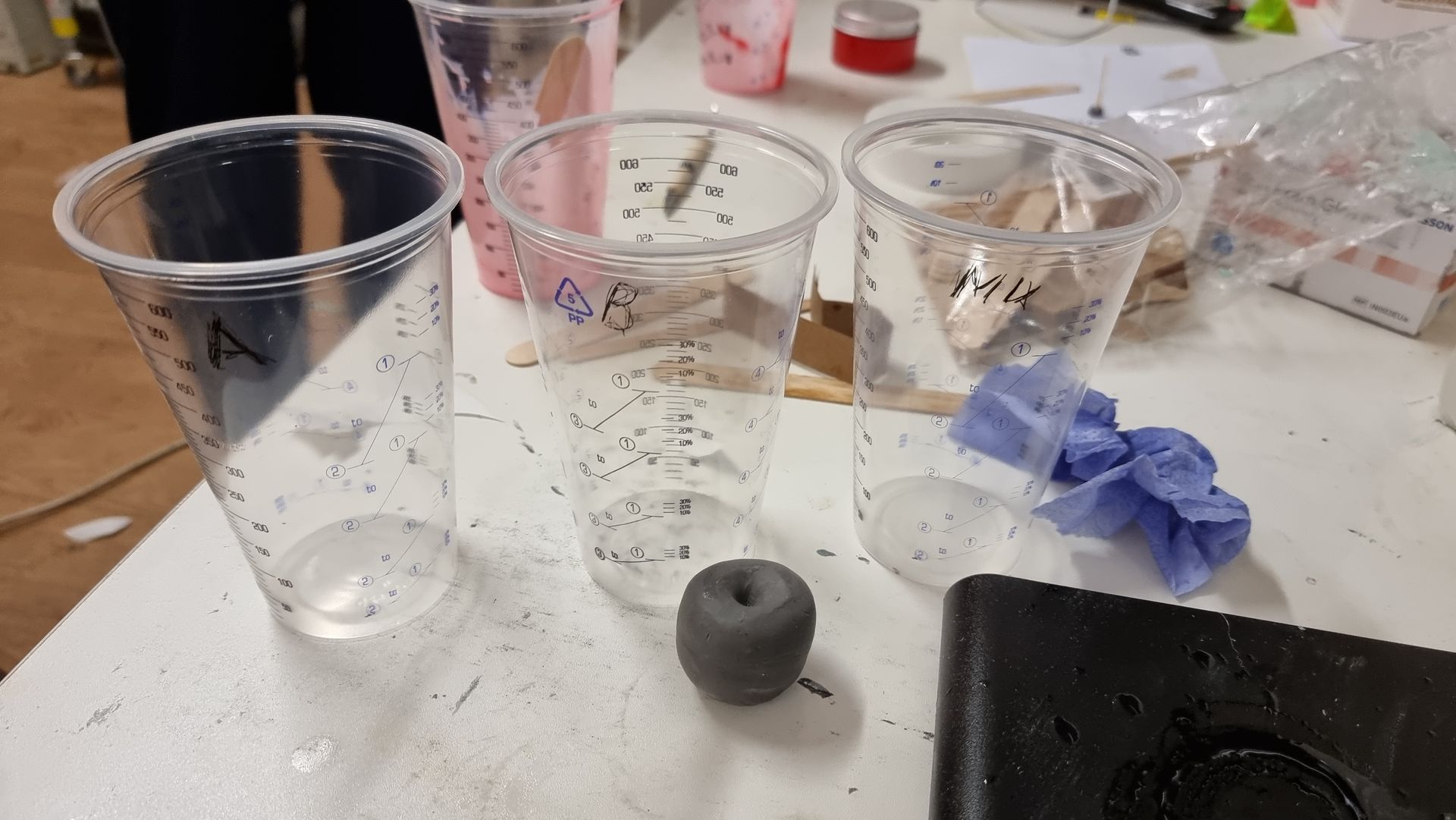 These were then placed in a cut plastic beaker, help with glue gun glue to start to form a mould for the silicon to make a silicon mould.