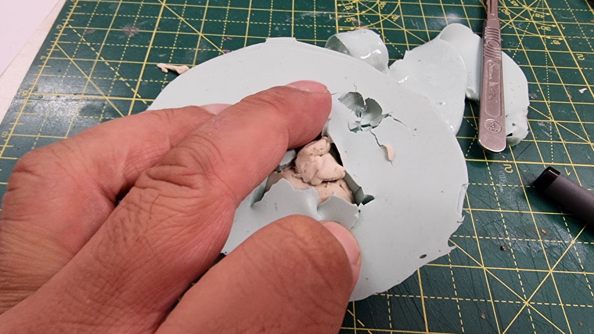 This is then left for hours then the mould is cut into in a zig zag pattern to help it mesh together again when full of resin with a very sharp knife to extract the Plastaline sculpt or other items being moulded. Often a fresh blade scalpel. Everything must be extracted. Sometimes this will be done with the first cast.