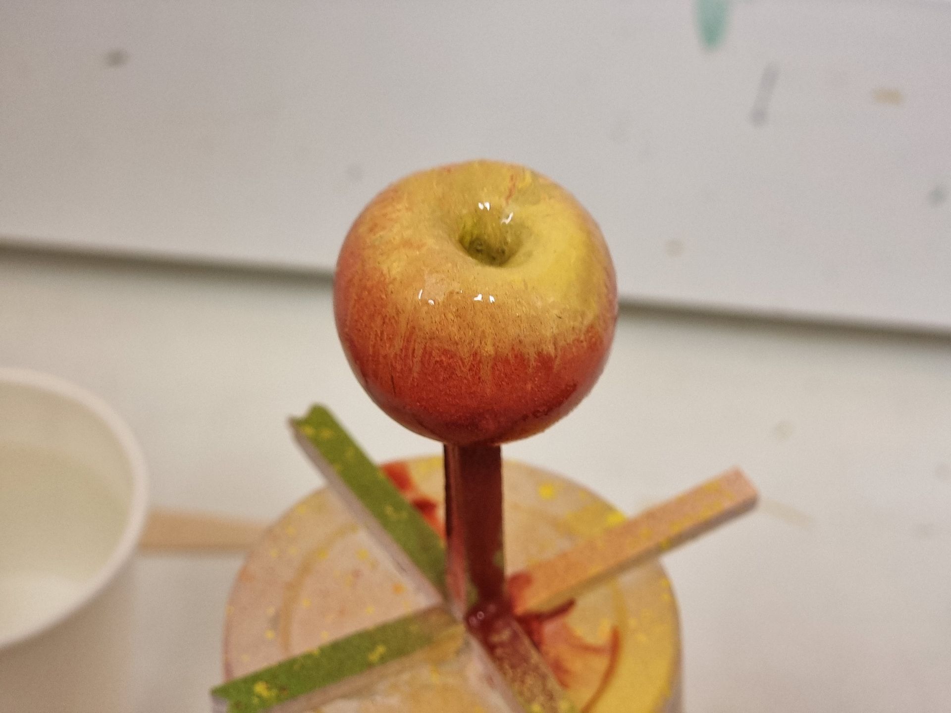 Paint was also soaked into a brush with stiff bristles. The bristles were then slid back to flick paint spots onto the side of the apple to add texture.