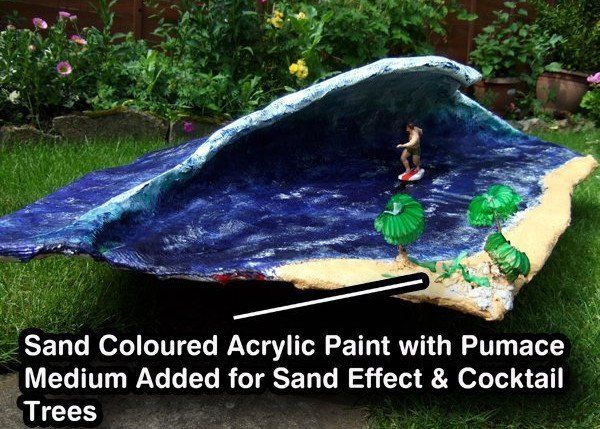 The surf wave was covered in textured wall paper to give a water surf stream texture and coated in acrylic paint. The water was mixed with gel medium to make it more deep glossy water like and a pumice grit medium added to the sand painting for the beach.
