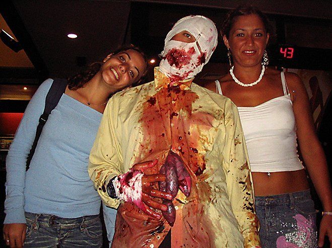 I filled the condoms with newspaper, water and food dye giving some texture. Glued these to each other and tied them together and tied them to a black t shirt under a ripped open shirt, tied the inari pouch inside out to my neck, added the cooked rice for maggots, tied on the bandages then covered the guts and body with the syrup and strawberries as flesh.
